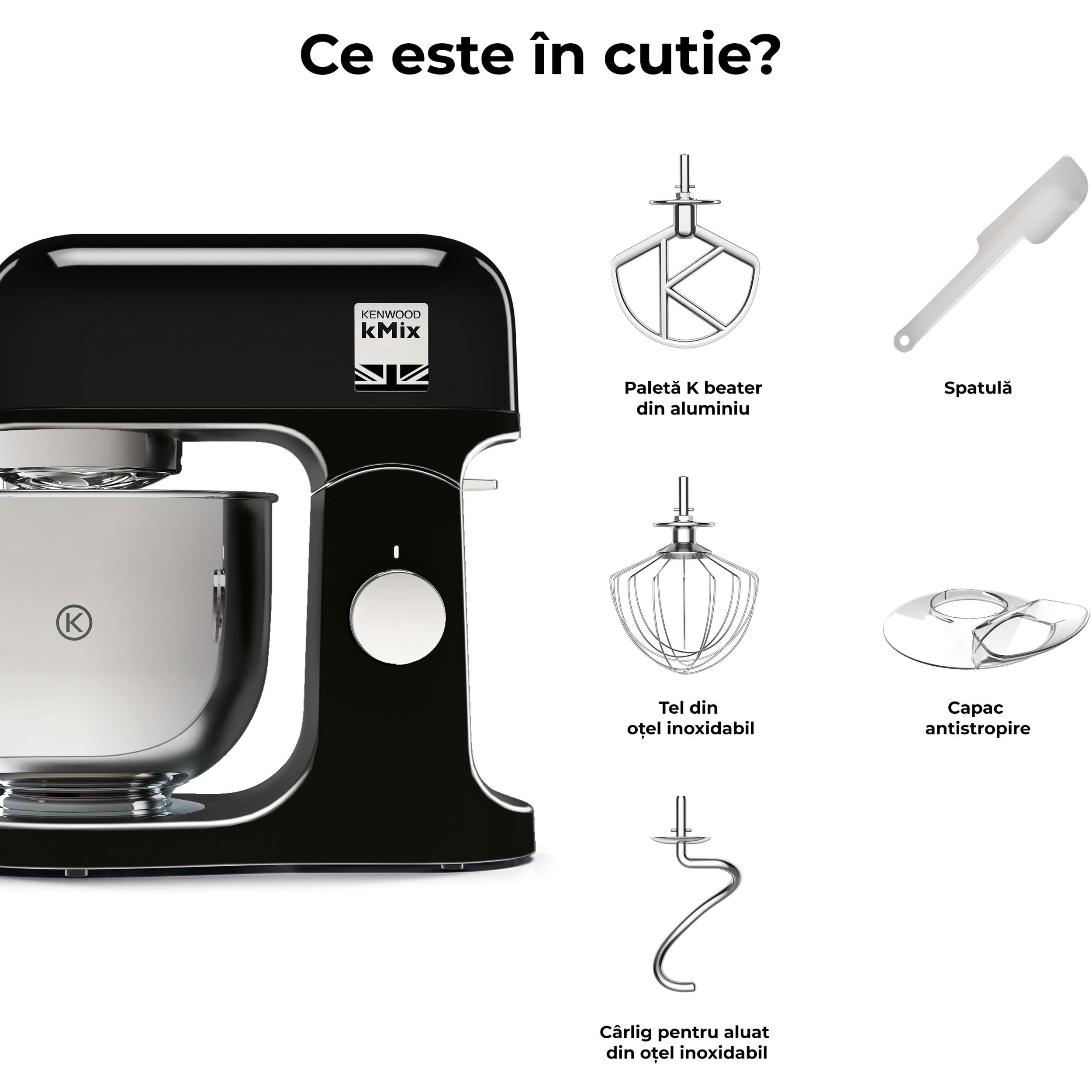 Robot de bucătărie planetar KENWOOD kMix KMX751ABK - 0W20011524, 1000W (6 trepte și Turbo), Vas inox 5l, Corp aluminiu turnat, Set patiserie (tel 16 brațe, cârlig, paletă K), G8.86kg, Sleek Black