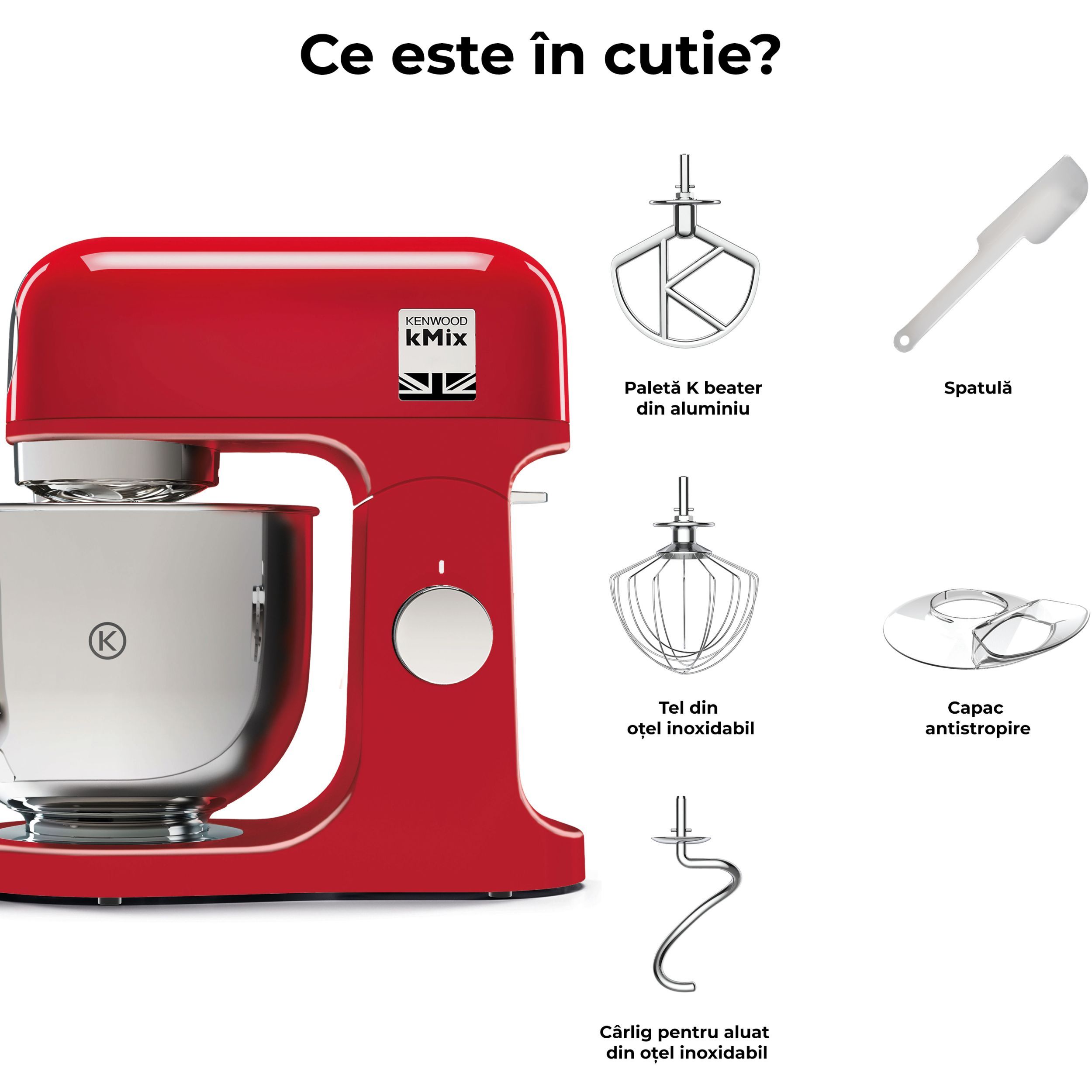 Robot de bucătărie planetar KENWOOD kMix KMX751ARD - 0W20011525, 1000W (6 trepte și Turbo), Vas inox 5l, Corp aluminiu turnat, Set patiserie (tel 16 brațe, cârlig, paletă K), G8.86kg, Bold Red