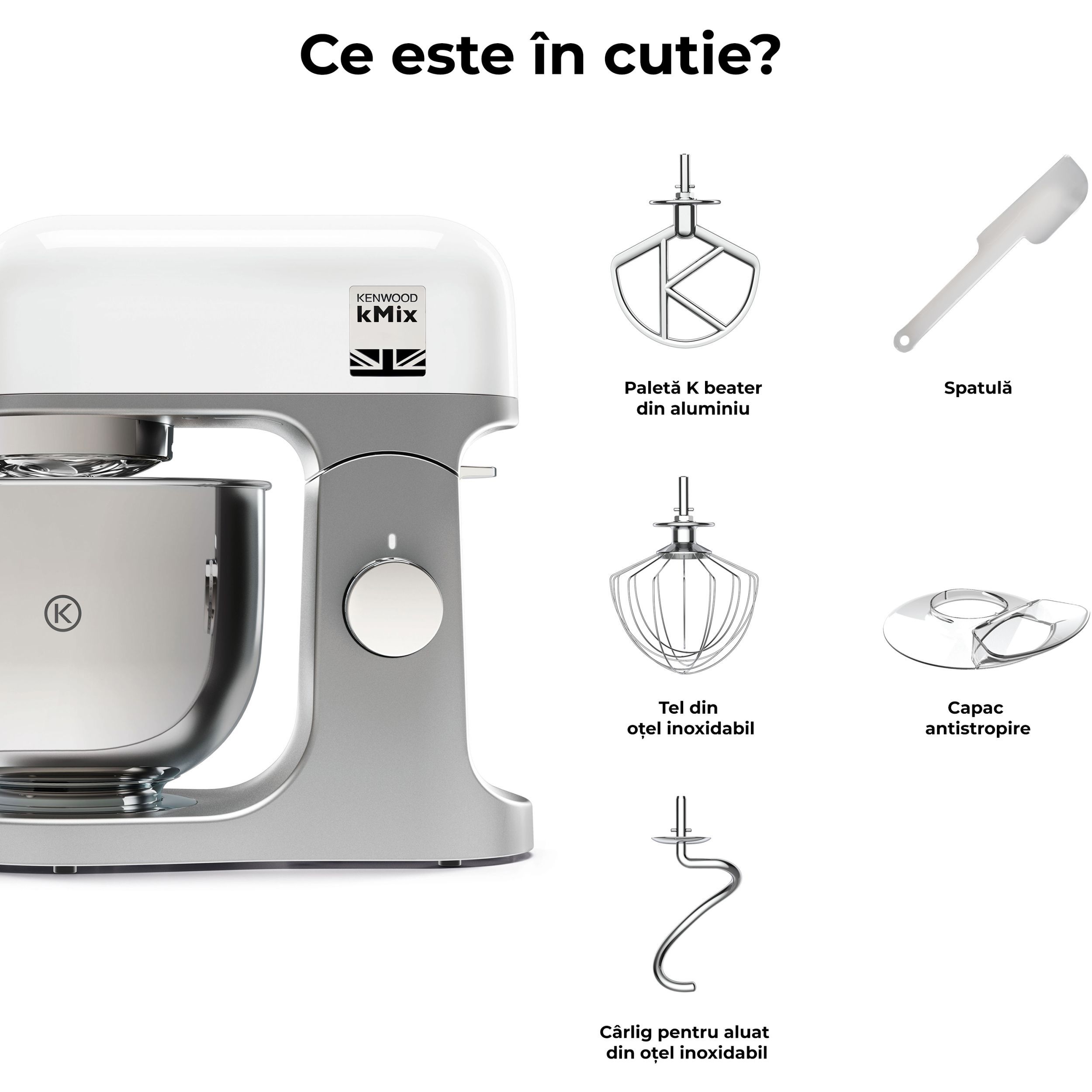 Robot de bucătărie planetar KENWOOD kMix KMX751AWH - 0W20011523, 1000W (6 trepte și Turbo), Vas inox 5l, Corp aluminiu turnat, Set patiserie (tel 16 brațe, cârlig, paletă K), G8.86kg, Pure White