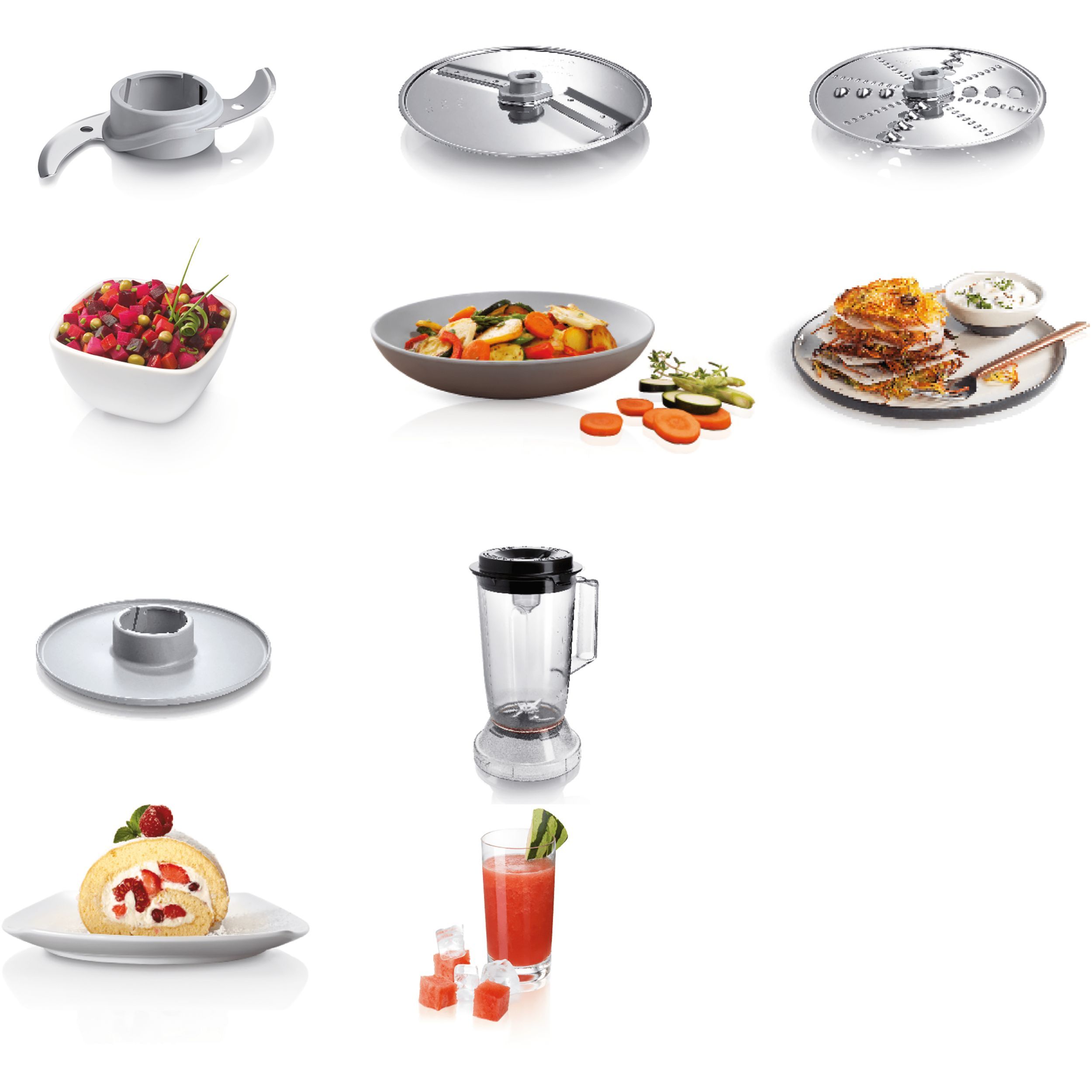 De obicei, ai nevoie de diferite dispozitive atunci prepari diferite compoziții. Indiferent că toci ceapă sau fructe, răzuiești legume sau amesteci smoothie-uri, datorită accesoriilor incluse compoziția ta va fi pregătită rapid.