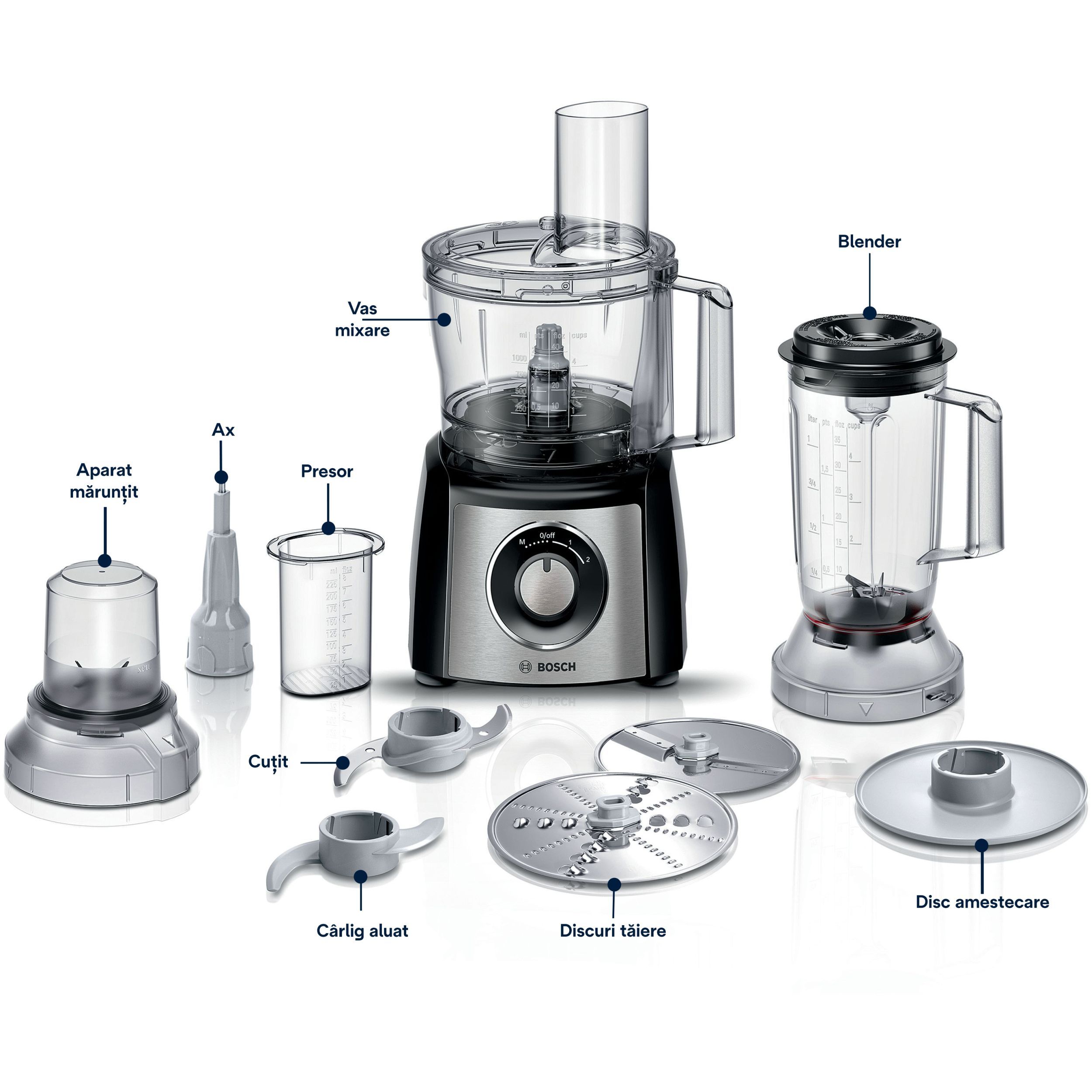 - Peste 50 de funcţii: răzuire, tăiere, măcinare, tocare, mixare şi multe altele datorită gamei variate de accesorii;
