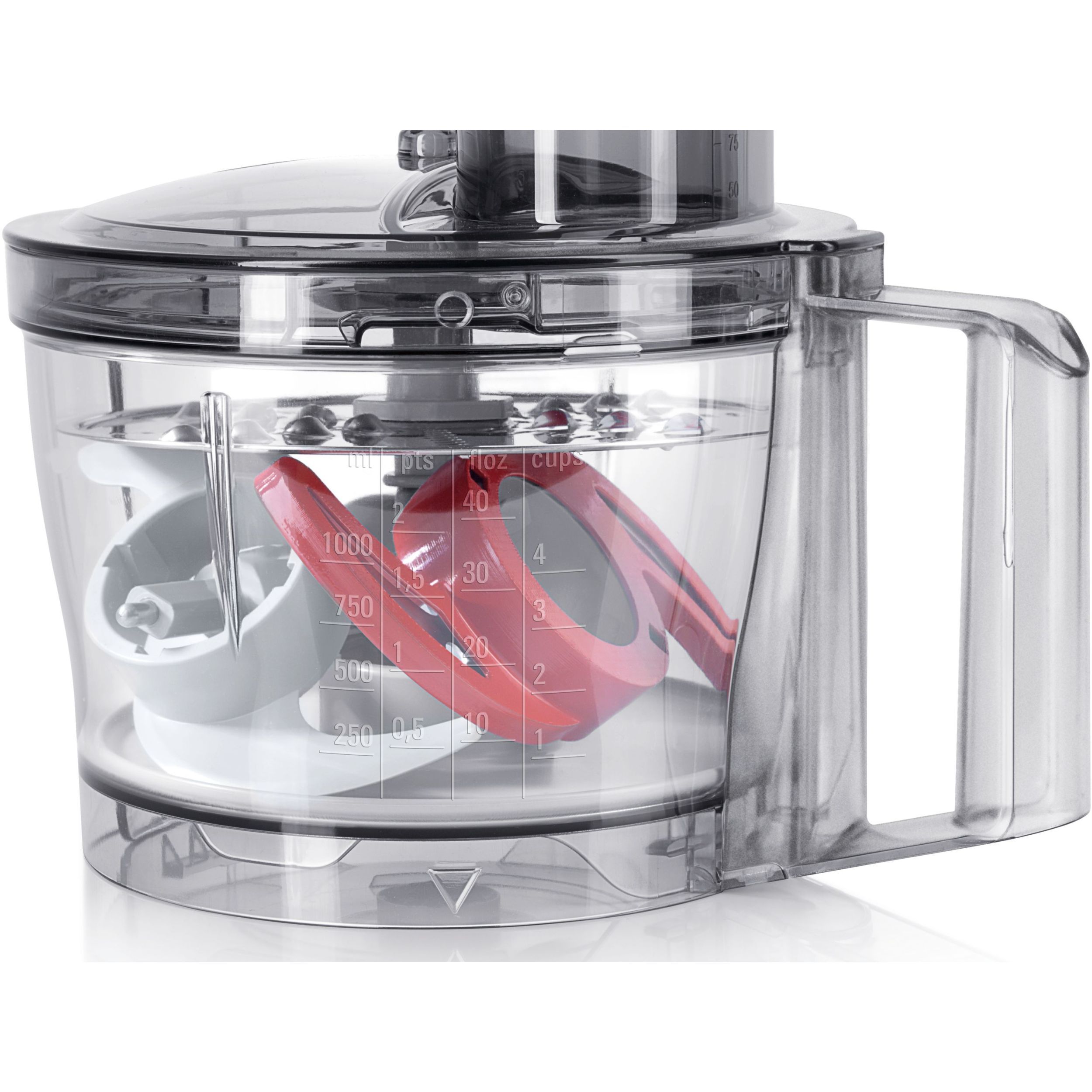 Vas de mixare din plastic transparent (2.3 l) pentru o cantitate de 500 g de făină + ingrediente (maximum0.8 kgde compoziţie pentru aluat), cu capac dotat cu pâlnie şi împingător