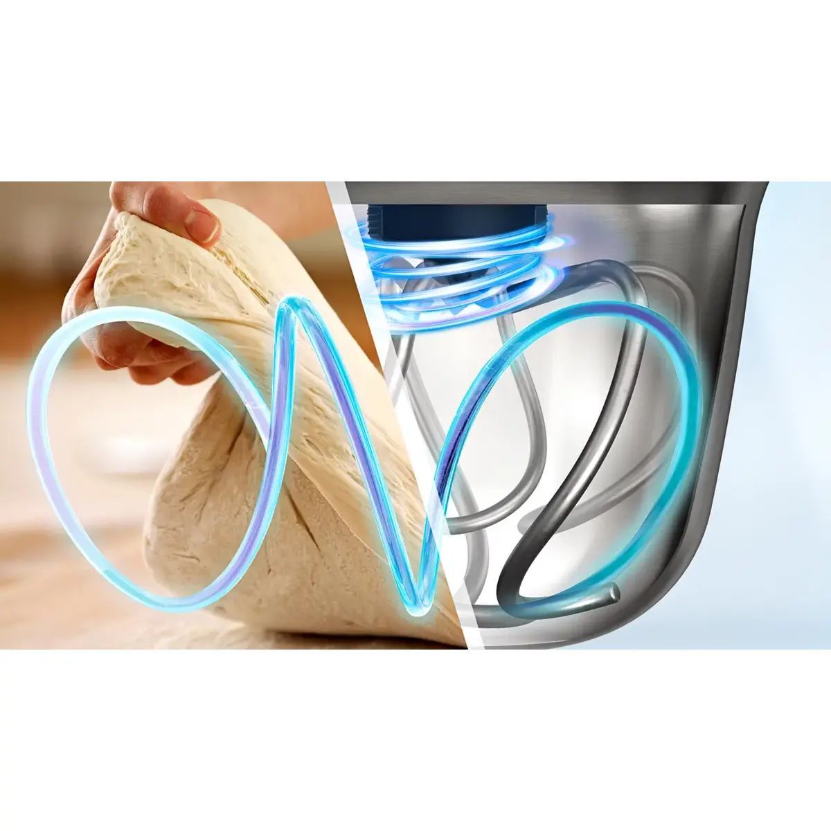 Nu lăsa aluaturile dificile să îți strice buna dispoziție. Dimensiunile mici și compacte ale robotului îți asigură mai mult spațiu în bucătărie, iar înclinarea accesoriilor de mixare a compozițiilor către partea din spate a bolului permite adăugarea ușoară a ingredientelor. Poziția de repaus este utilă pentru umplerea ușoară a bolului prin partea din față.