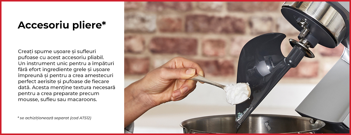 K-Beater semnătura noastră, însoțește încă două unelte de gătit din oțel inoxidabil, un instrument pentru aluat și tel. În plus, un bătător pentru cremă. Abordați cu încredere orice sarcină. Toate pot fi spălate în maşina de spălat vase pentru o curăţare uşoară.