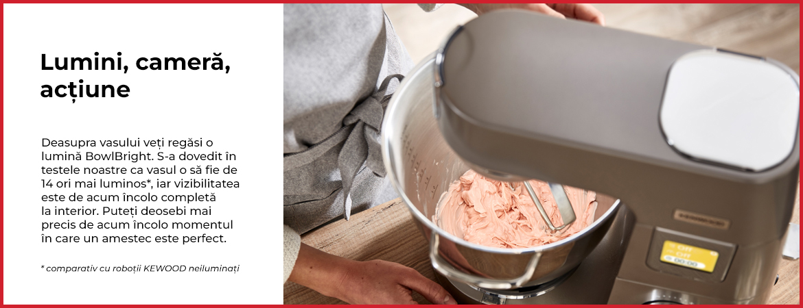 * aluat cu 33% mai rapid decât un vas de mixare KENWOOD standard și 33% mai rapid în topirea ciocolății față de tehnica bain marie. Testare internă cu 500g de aluat și topirea a 100g de ciocolată.