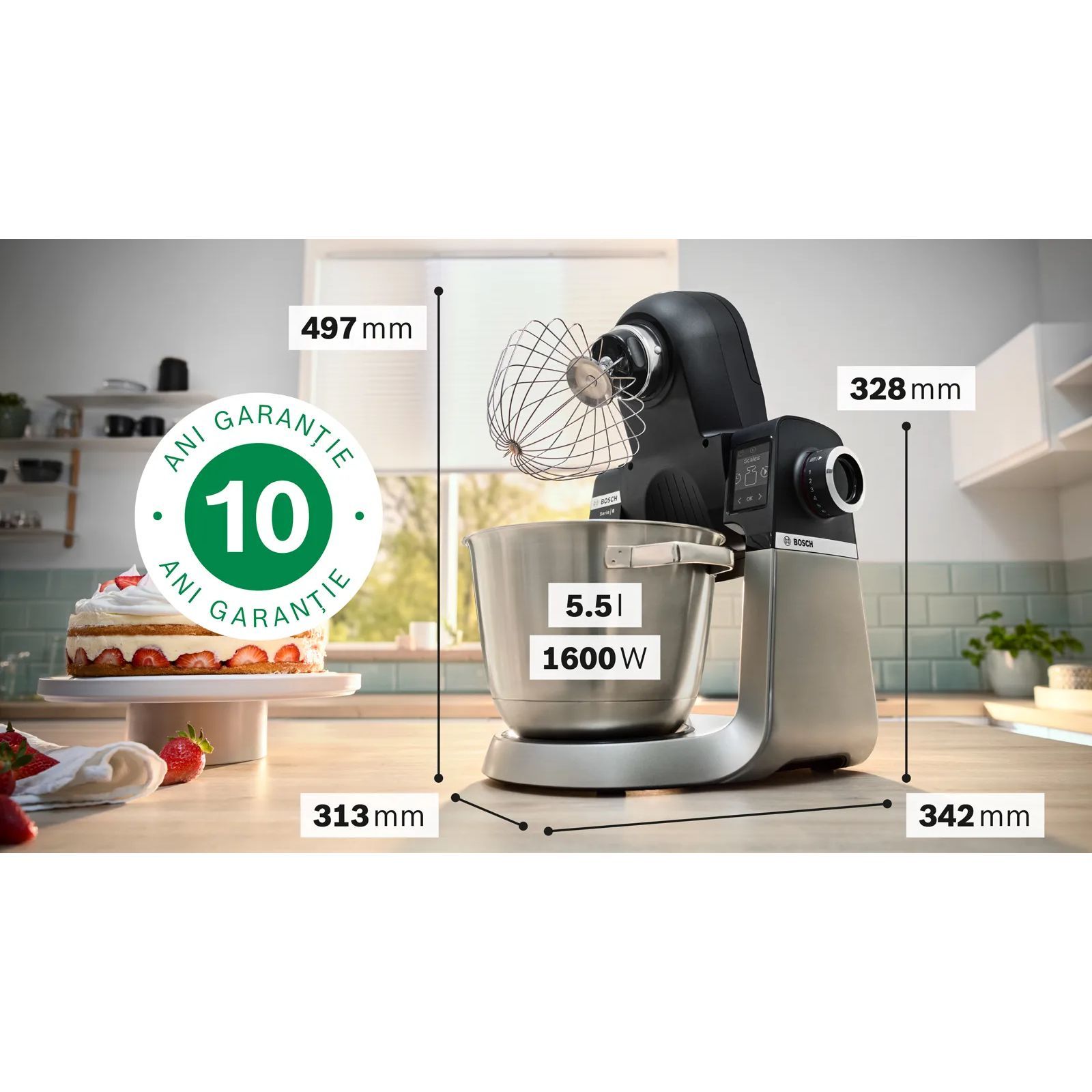 Bol de 5,5l - Pentru prepararea unei cantități mari de aluat. Petreceri de ziua de naștere a copiilor, sărbători sau ocazii când trebuie să prepari mult aluat deodată. Aici te ajută bolul cu capacitate de 5,5 l, din oțel inoxidabil șlefuit. O cantitate mare de aluat preparat într-o singură etapă te va ajuta să economisești timp și necesită mai puțin efort de curățare. Bolul este ideal pentru a pregăti până la 3,5 kg de amestec pentru prăjituri.