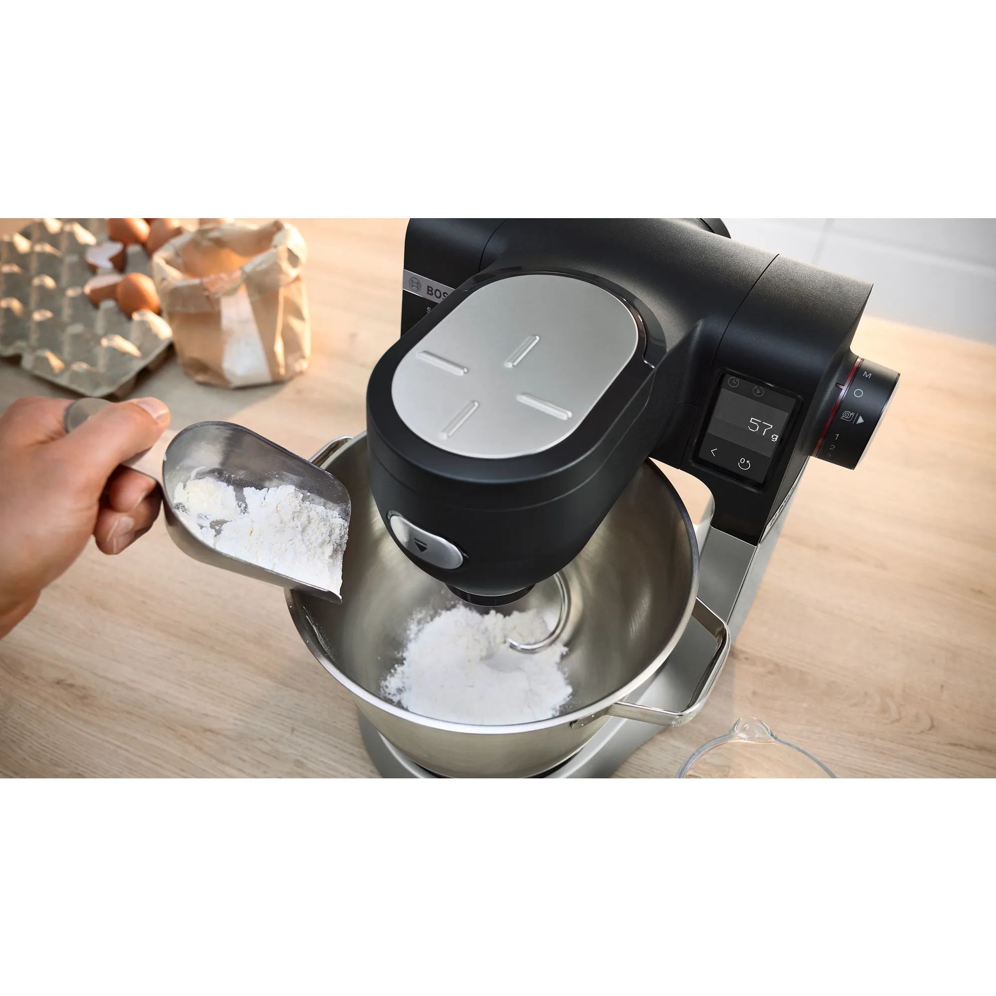 Urmărește cu atenție pașii din rețetă și folosește doar cantitățile de care ai nevoie. Robotul de bucătărie Serie 6 cântărește cu precizie, în trepte de 1 gram. Poți și alte ingrediente, folosind unități de măsură precum ml de ulei, lapte. Poți să cântărești direct în bol sau acesoriile robotului. Cantitățile mici pot fi cântărite pe bratul de mixare, în partea de sus a robotului.