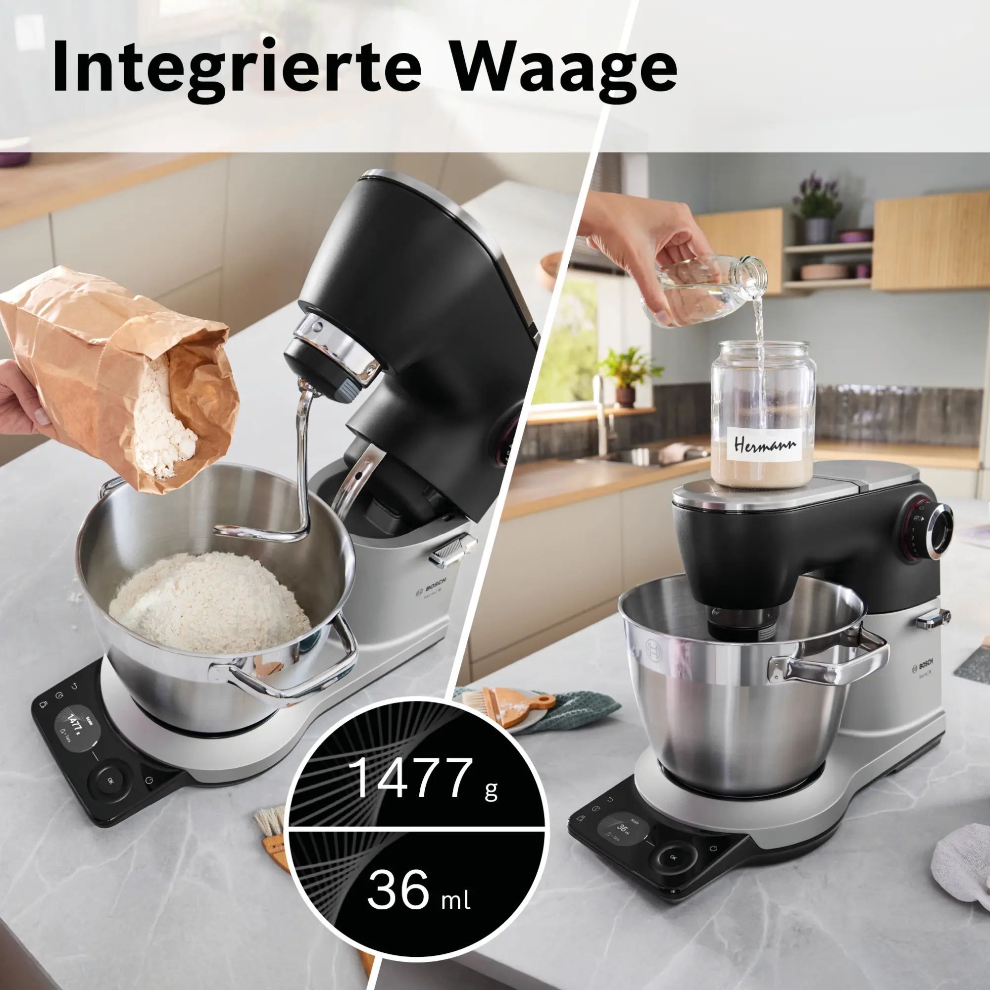 Robot de bucătărie planetar BOSCH Serie 8 MUMS8 Scale MUMS8ZS00, 1800W (7 trepte), Bol inox șlefuit 6l cu mânere, Set patiserie, Cântar, Cronometru, SoftStart, AirCooling, Carcasă metalică, Pearl Silver