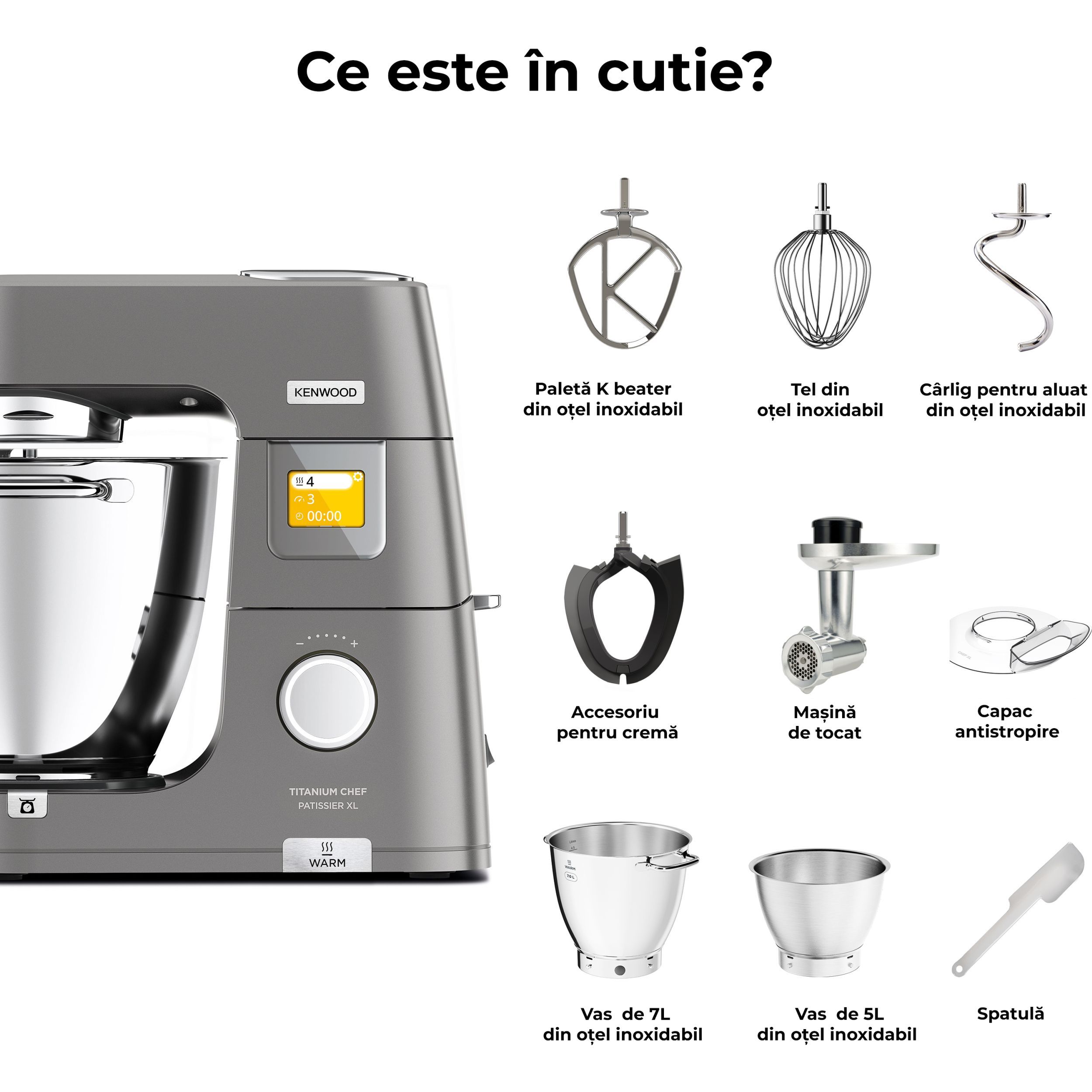 În lumea bucătăriei, inspirația și creativitatea sunt la fel de importante precum este și preparatul obținut. Astfel, robotul de bucătărie Titanium Chef Patissier XL reprezint un ajutor de nădejde în bucătărie, oferind versatilitate mâncărurilor. Chef Patissier XL este conceput pentru entuziaștii culinari care caută profesionalism și perfecțiune în bucătăria proprie. Robotul eficient, ergonomic și versatil este rezultatul anilor de cercetare în inginerie, deschizând noi orizonturi culinare în crearea unei game largi de preparate. Conectați-vă la aplicația mobilă KENWOOD World pentru inspirație culinară pas cu pas, topiți rapid ciocolata cu ajutorul sistemului de încălzire și măsurați ingredientele direct în vasul robotului cu cântarul EasyWeigh încorporat. Robust și rezistent, Titanium Chef Patissier XL va sta în siguranță pe blatul de lucru chiar și atunci cand framântați cele mai mari cantități de aluat, iar sistemul de iluminare al vasului vă ajuta să aveți 100% control asupra preparatelor.