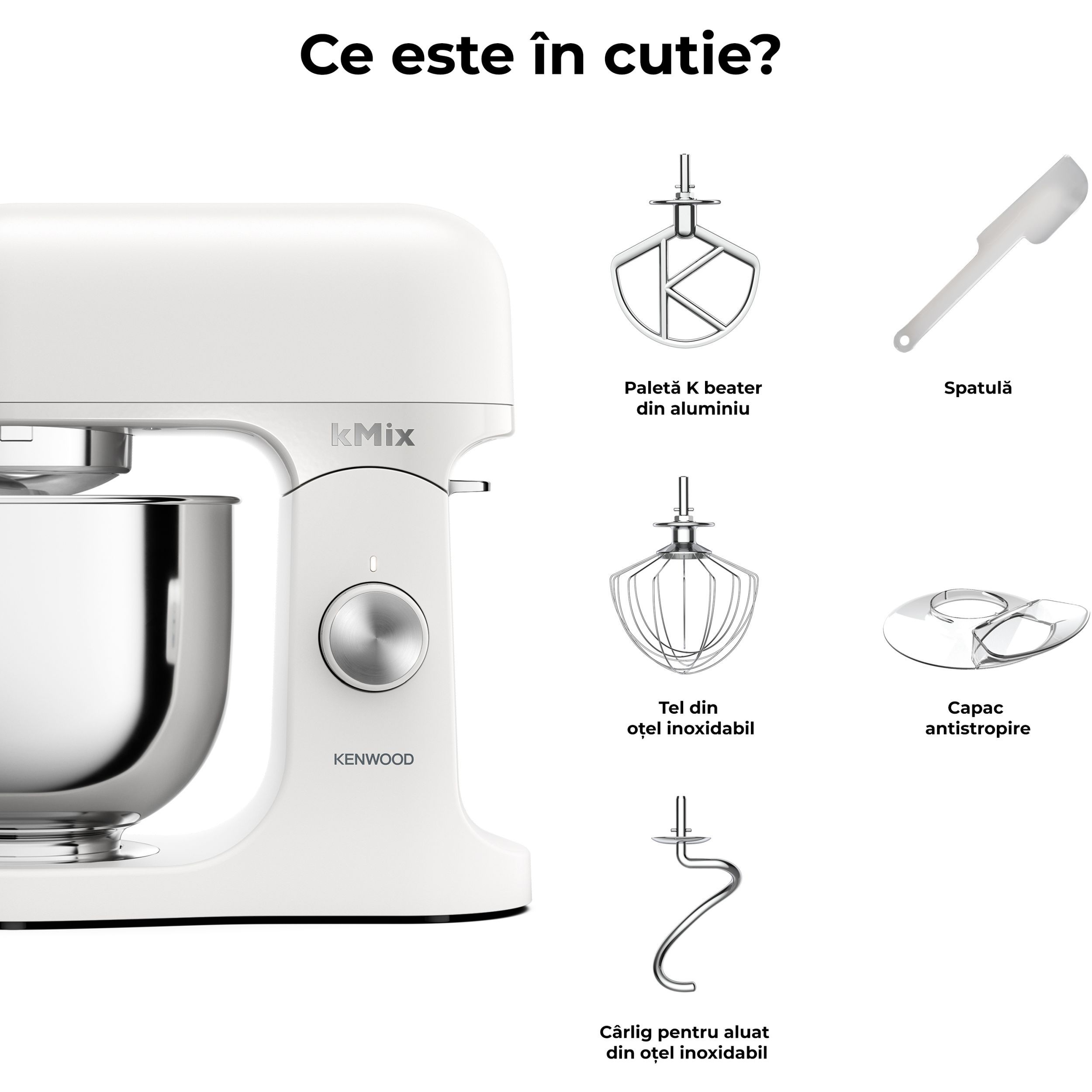 Robot de bucătărie planetar KENWOOD kMix KMX751AWH - 0W20011523, 1000W (6 trepte și Turbo), Vas inox 5l, Corp aluminiu turnat, Set patiserie (tel 16 brațe, cârlig, paletă K), G8.86kg, Pure White