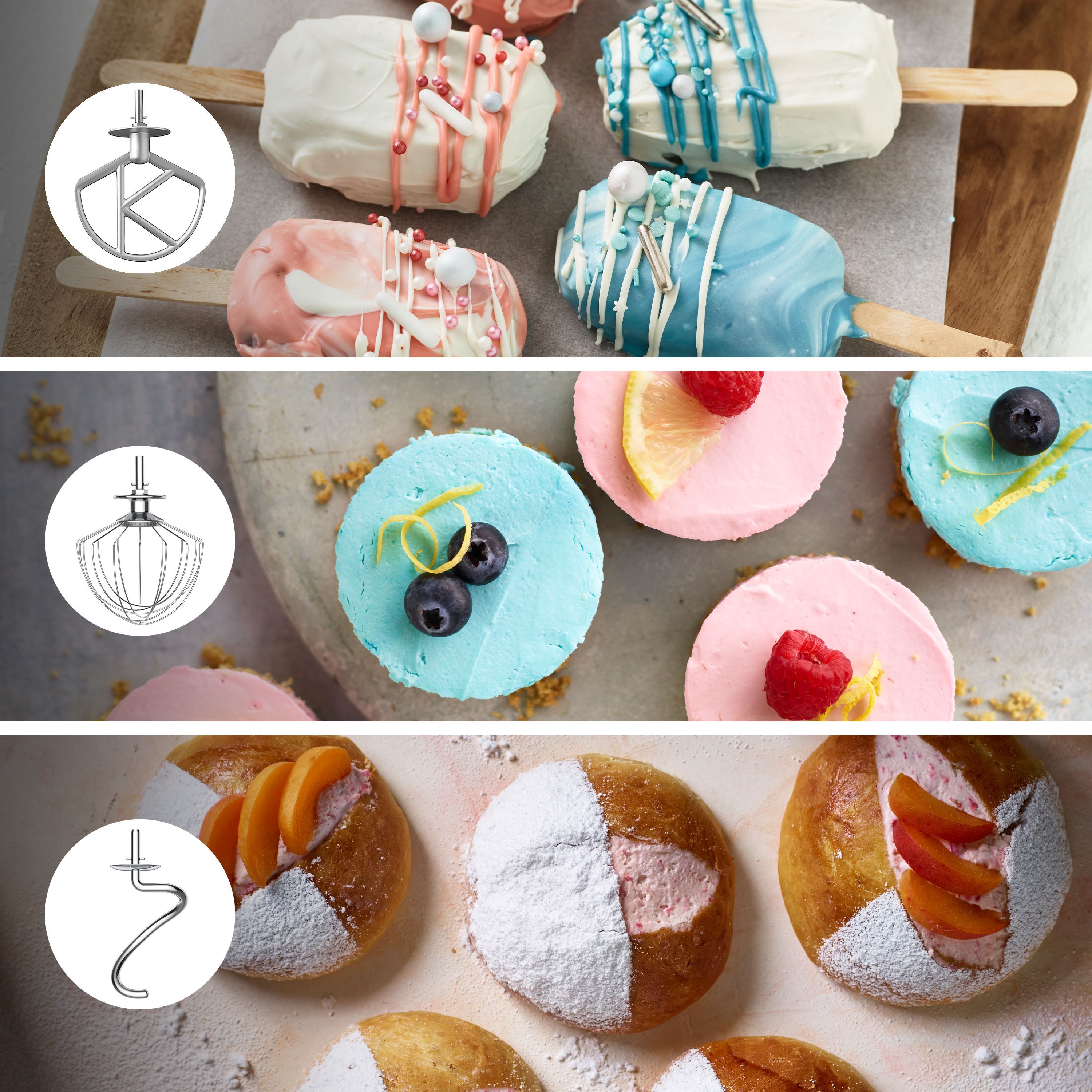 Sunteți întotdeauna pregătiți cu un set de trei instrumente robuste. Fiecare kMix este livrat cu un tel, un cârlig de aluat și paleta nostră K-Beater, o adevărată unealtă pentru gătit. Serviţi pâine și prăjituri delicioase în cel mai scurt timp.