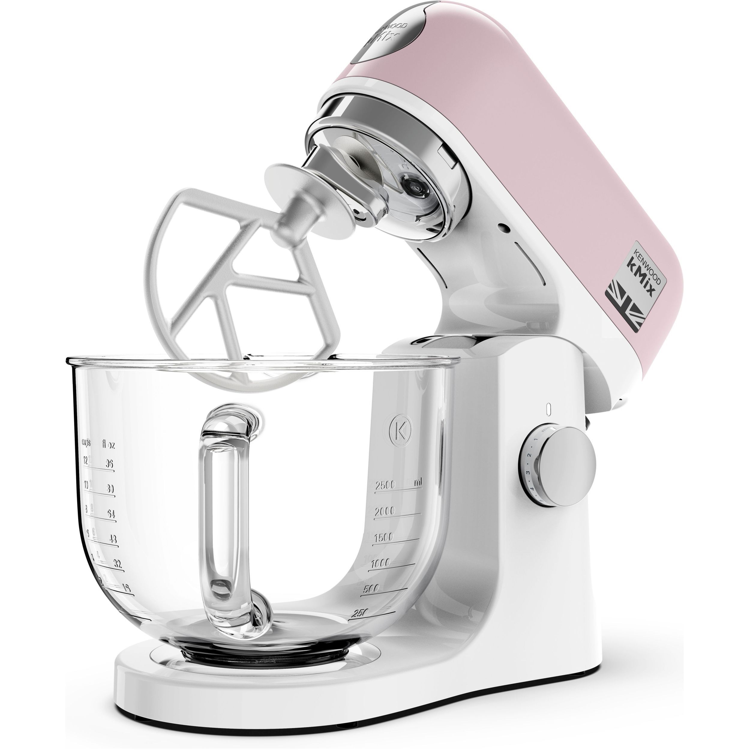 Robot de bucătărie planetar KENWOOD kMix KMX754APP - 0W20011489, 1000W (6 trepte și Turbo), Vas sticlă 5l, Set patiserie (tel 16 brațe, cârlig, paletă K), Soft Start, G11.19kg, Pastel Pink