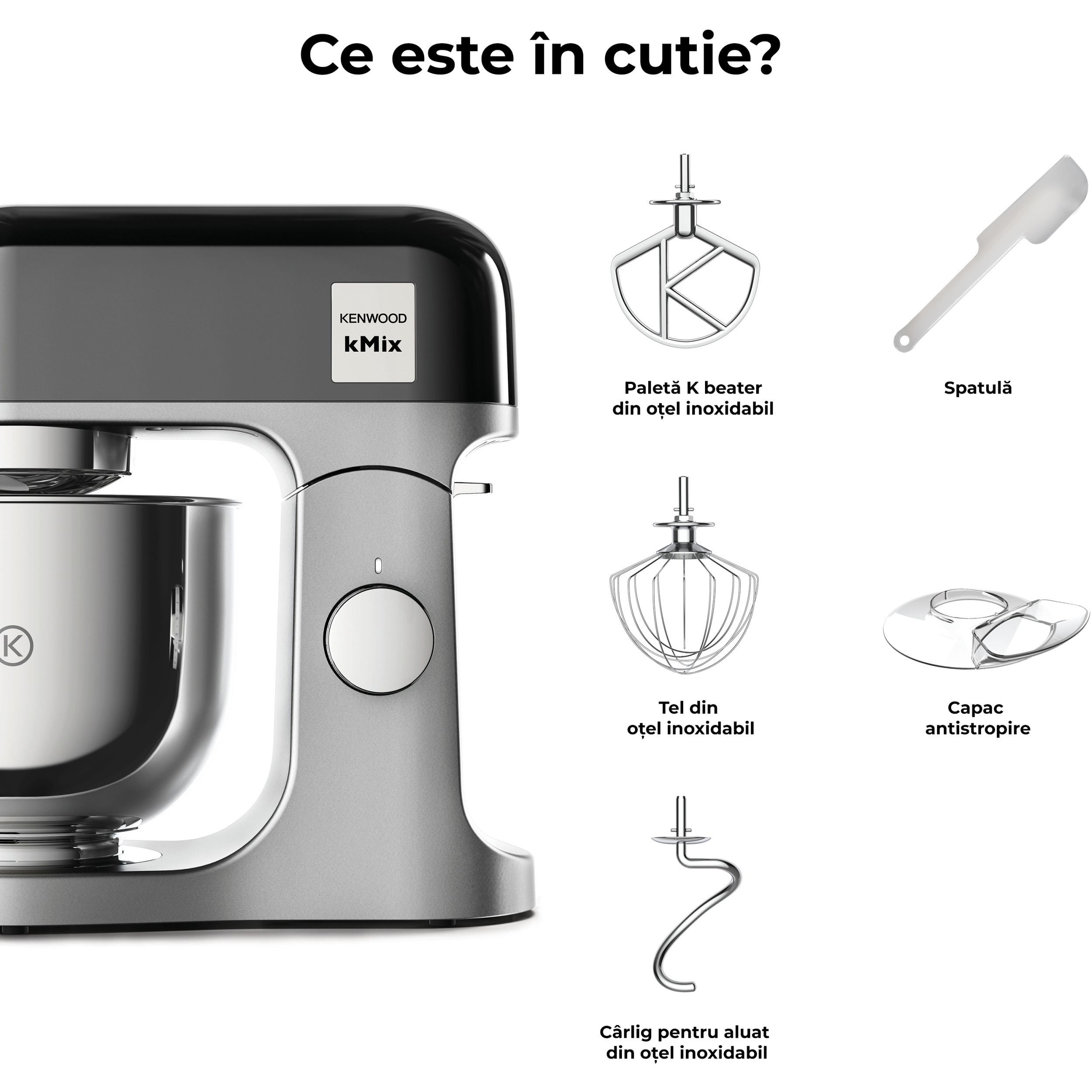 Robot de bucătărie planetar KENWOOD kMix KMX751ABK - 0W20011524, 1000W (6 trepte și Turbo), Vas inox 5l, Corp aluminiu turnat, Set patiserie (tel 16 brațe, cârlig, paletă K), G8.86kg, Sleek Black