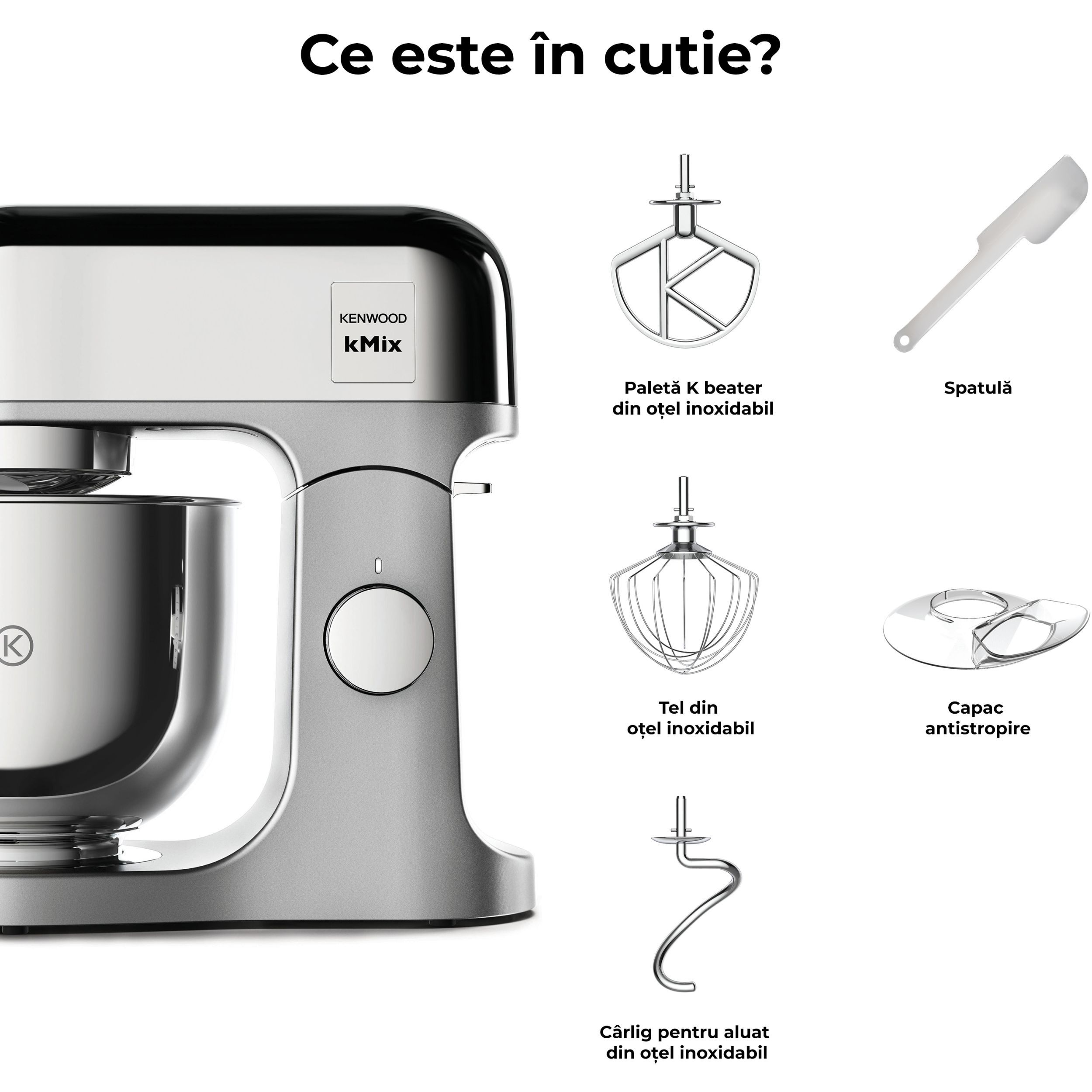 Robot de bucătărie planetar KENWOOD kMix Special Edition KMX760ACH - 0W20011397, 1000W (6 trepte și Turbo), Vas inox 5l, Set patiserie (tel 16 brațe, cârlig, paletă K), G9.3kg, Chrome