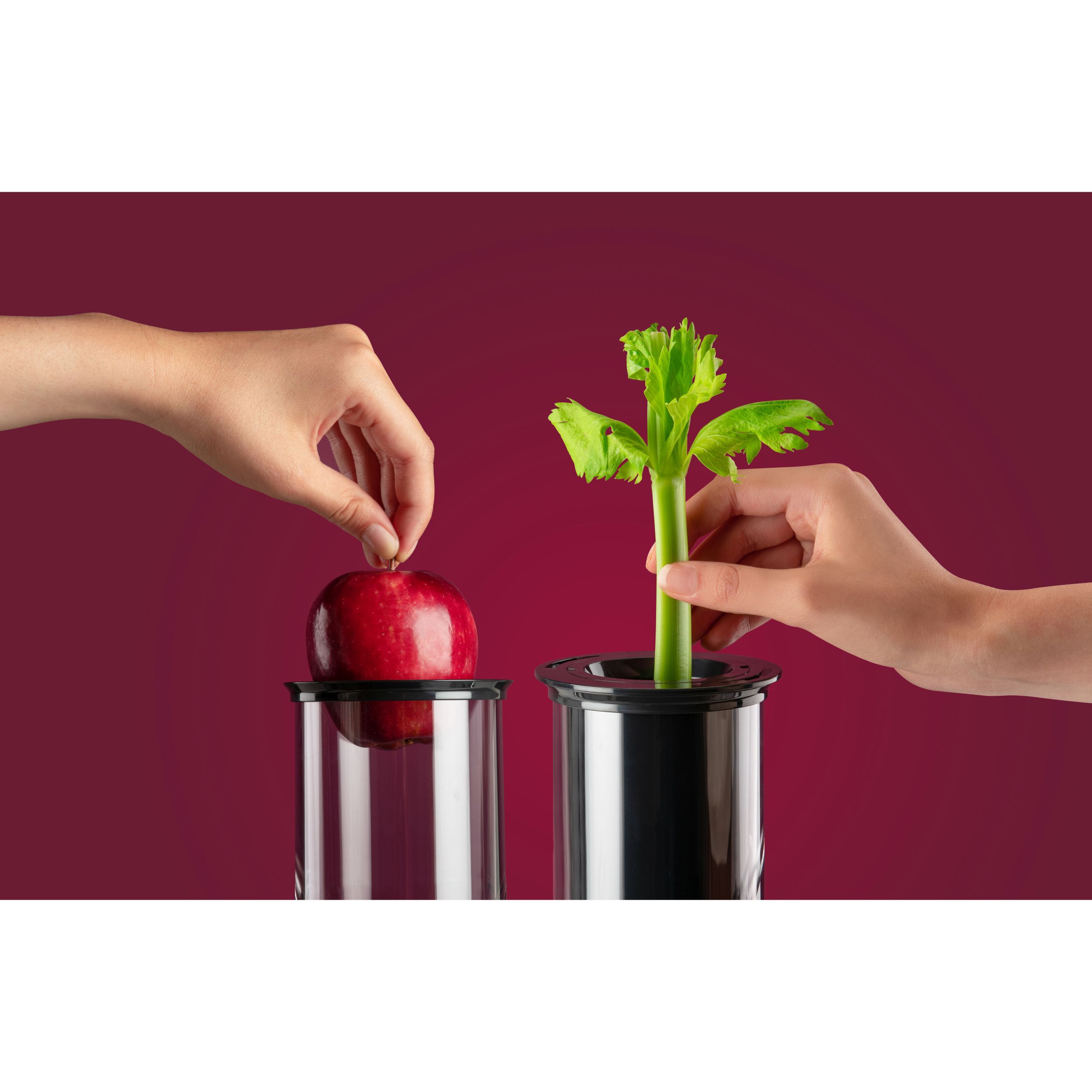 Trei viteze de precizie vă ajută să profitați la maximum de fiecare ingredient. Alegeți viteză mică pentru fructele de pădure moi și kiwi, viteză mare pentru ananas și castraveți, sau viteză Turbo pentru morcovi și sfeclă.