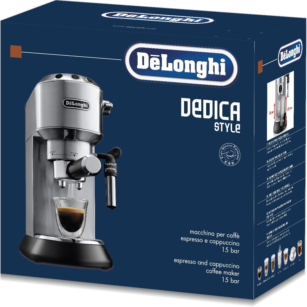 Cu o lățime de doar 15cm și un design unic, espressorul Dedica este cel mai compact espressor De’Longhi, adăugând o notă de rafinament minimalist bucătăriei tale, prin dimensiunile sale. Designul său elegant și compact este completat de un panou de control ușor de utilizat, cu butoane iluminate.