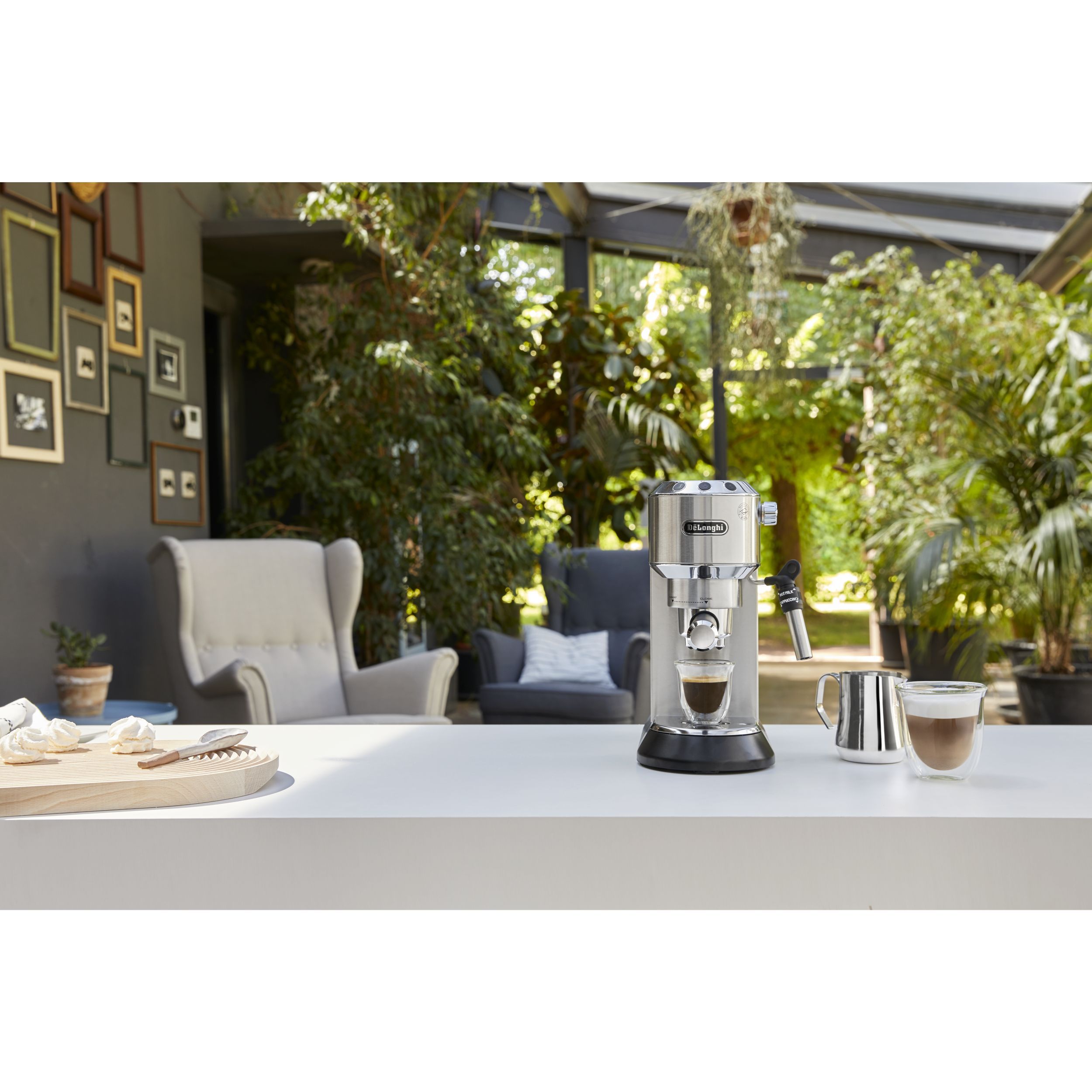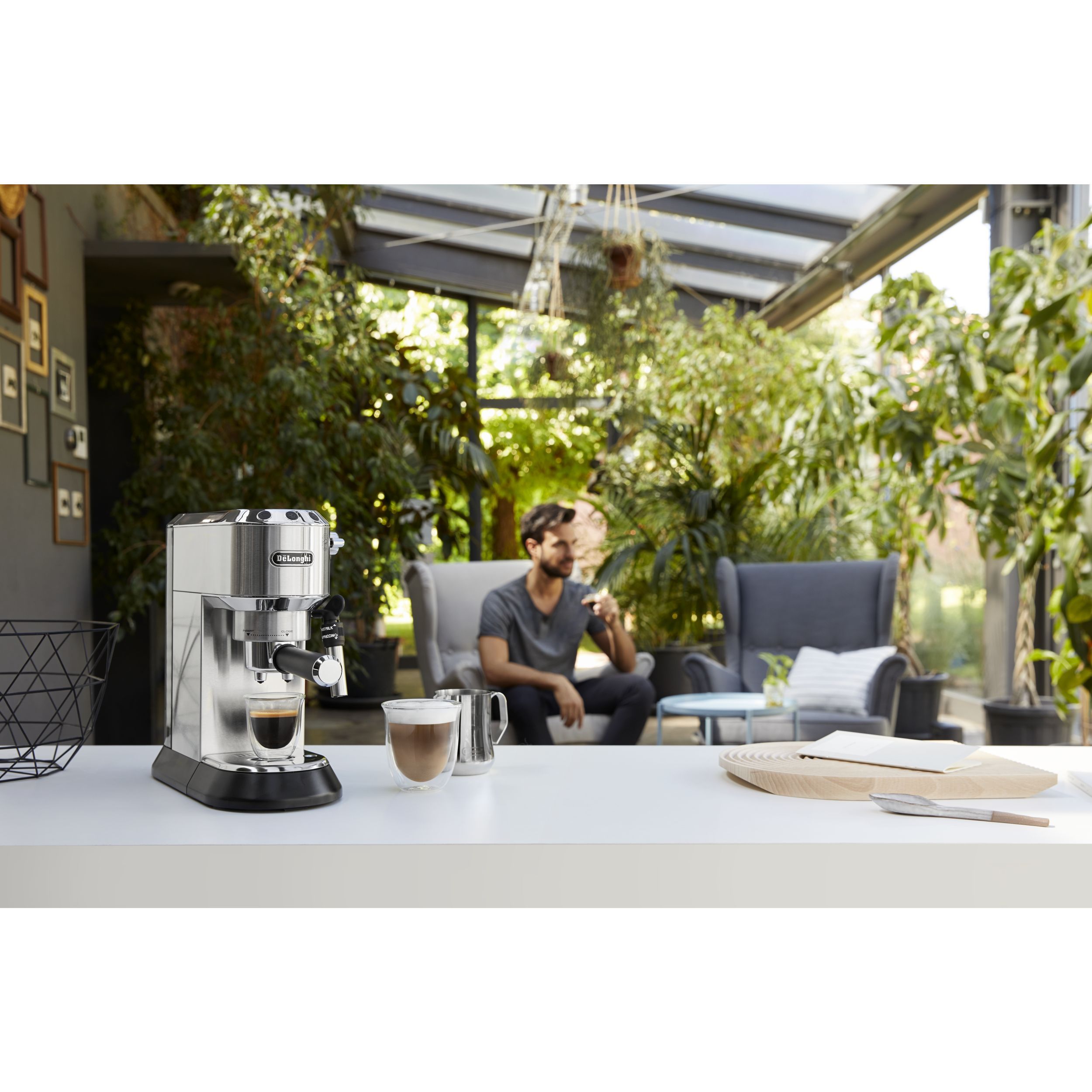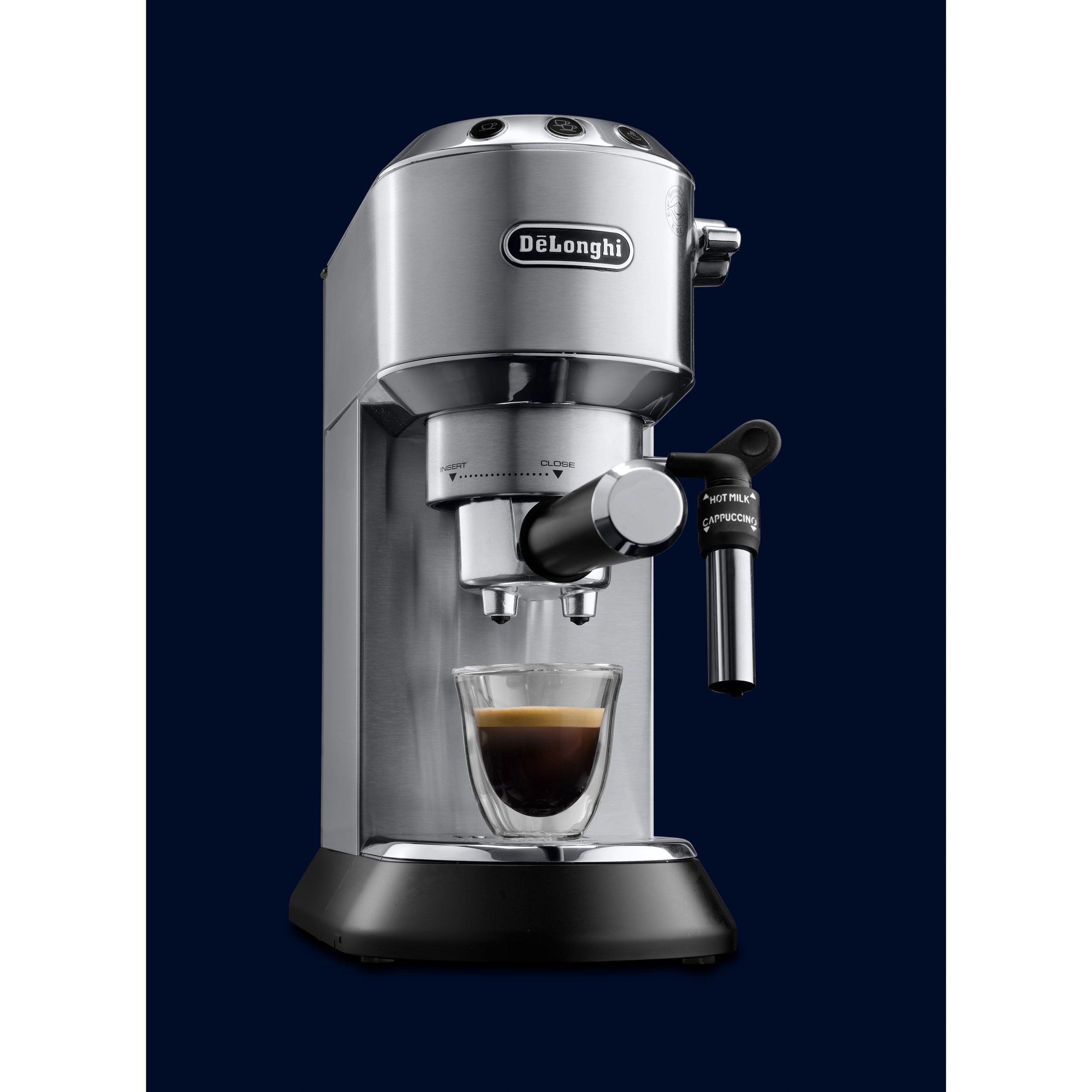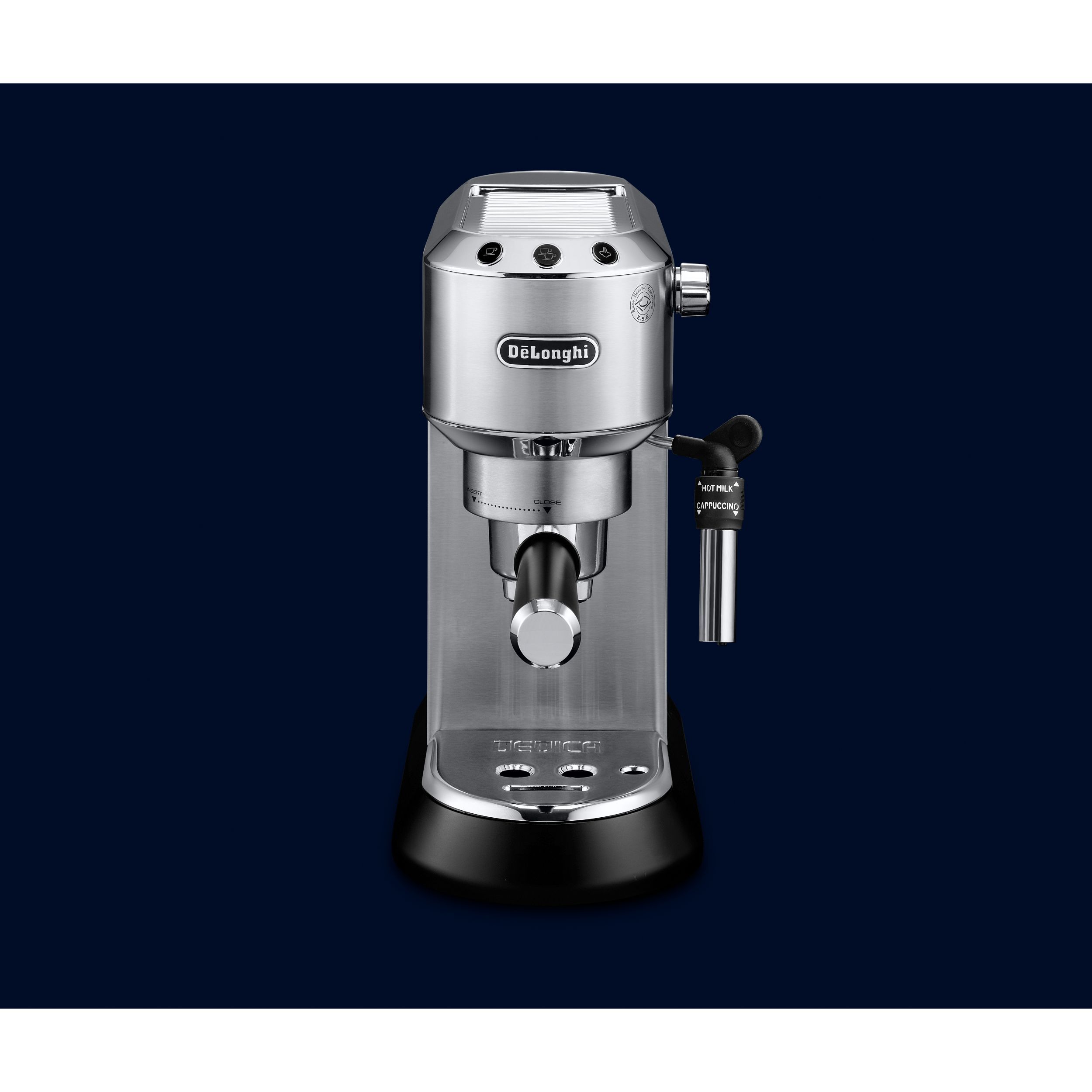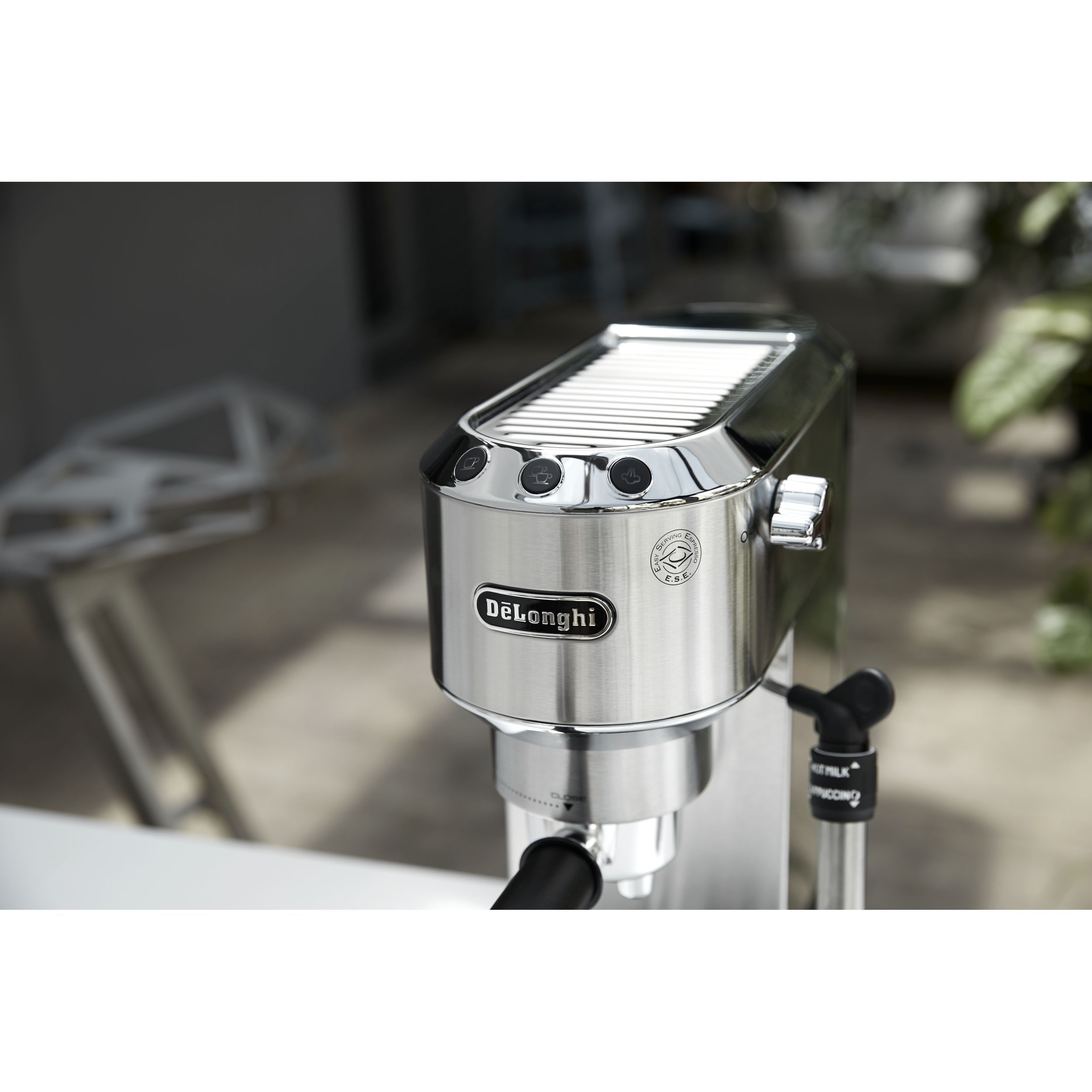 Espressor elegant și compact, conceput pentru a completa blatul de lucru din bucătărie. Datorită corpului său lucios din oțel inoxidabil și finisajului metalic lucios, espressorul Dedica adaugă oricărei bucătării o notă din designul italian autentic. Cu ajutorul espressorului manual Dedica, te poți bucura de un espresso dens și catifelat, precum și de o spumă de lapte cremoasă, datorită sistemului Cappuccino reglabil.