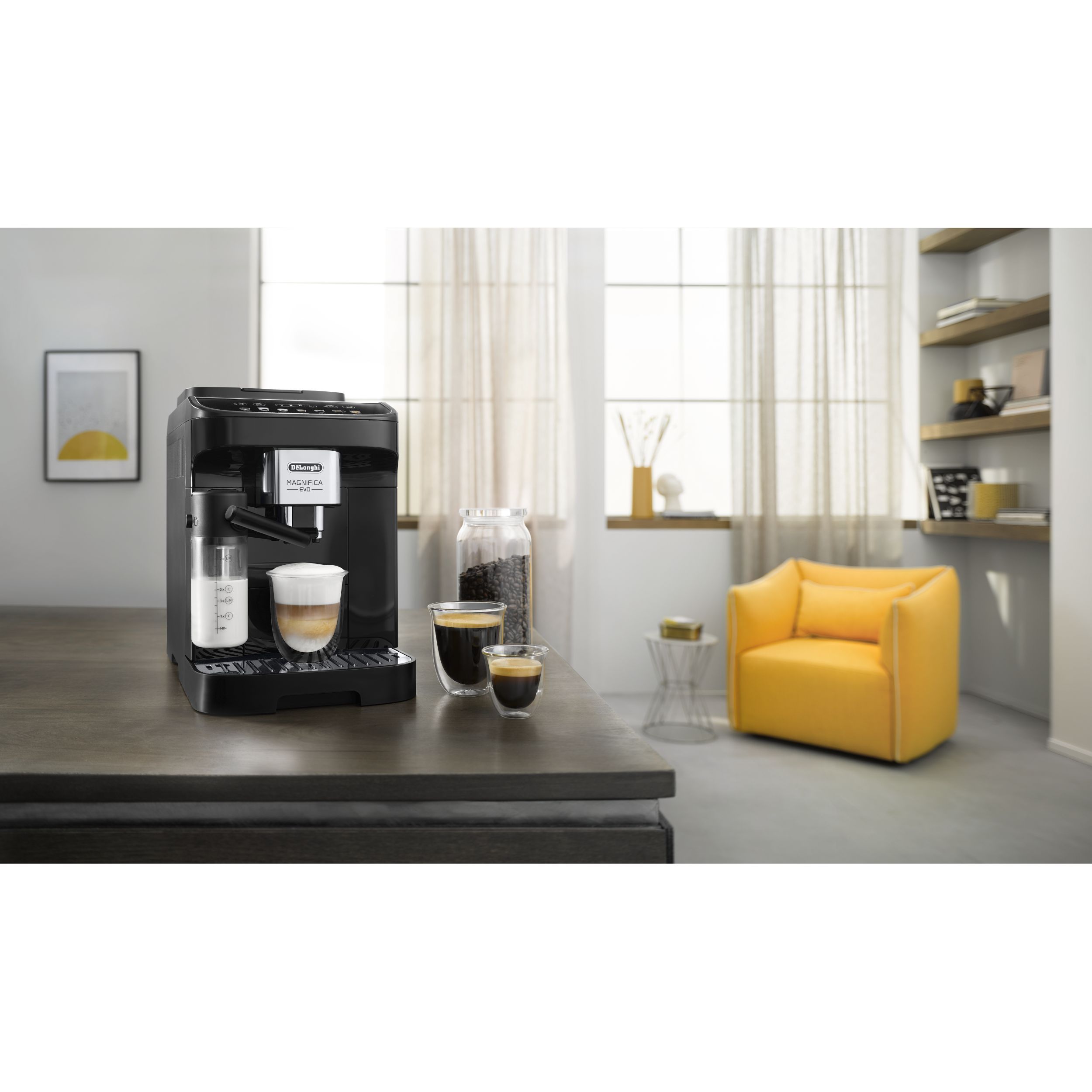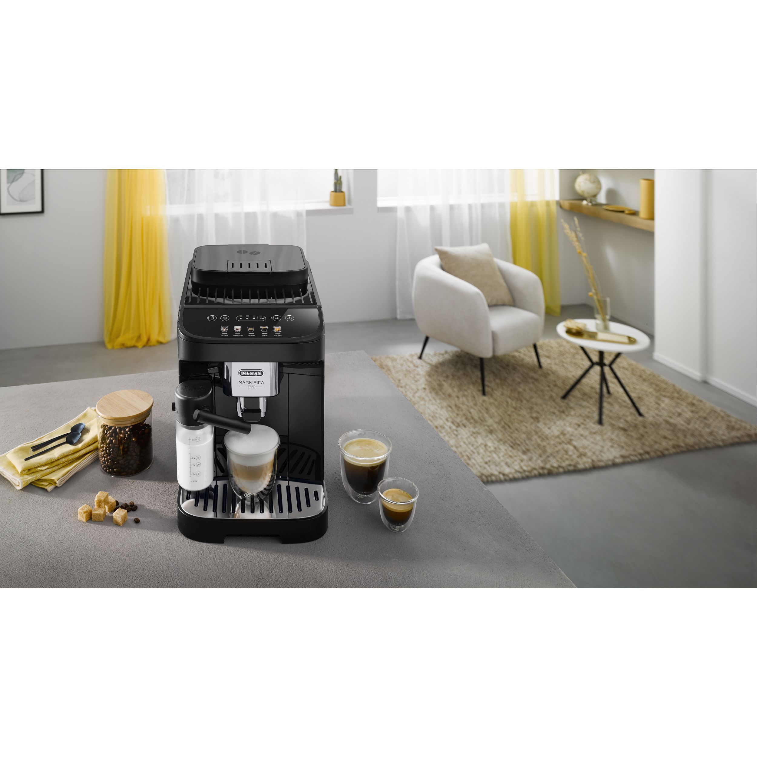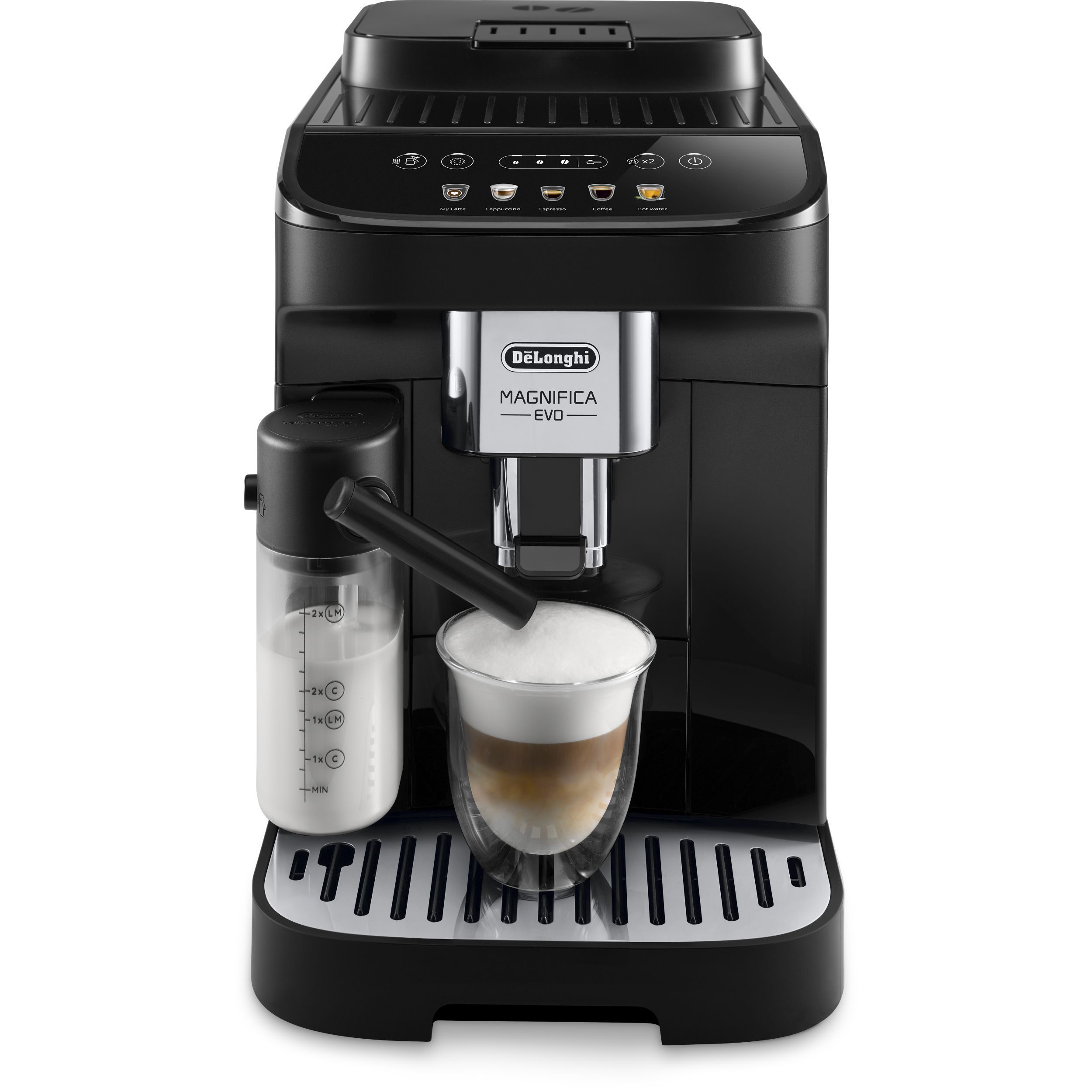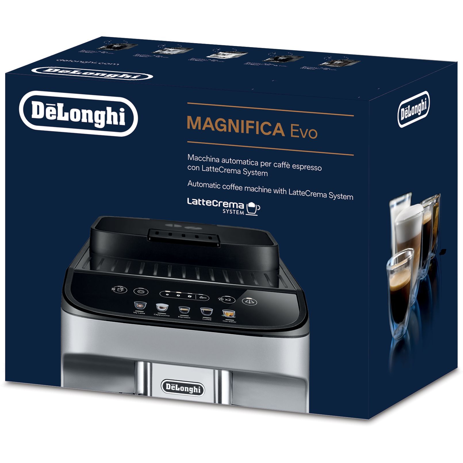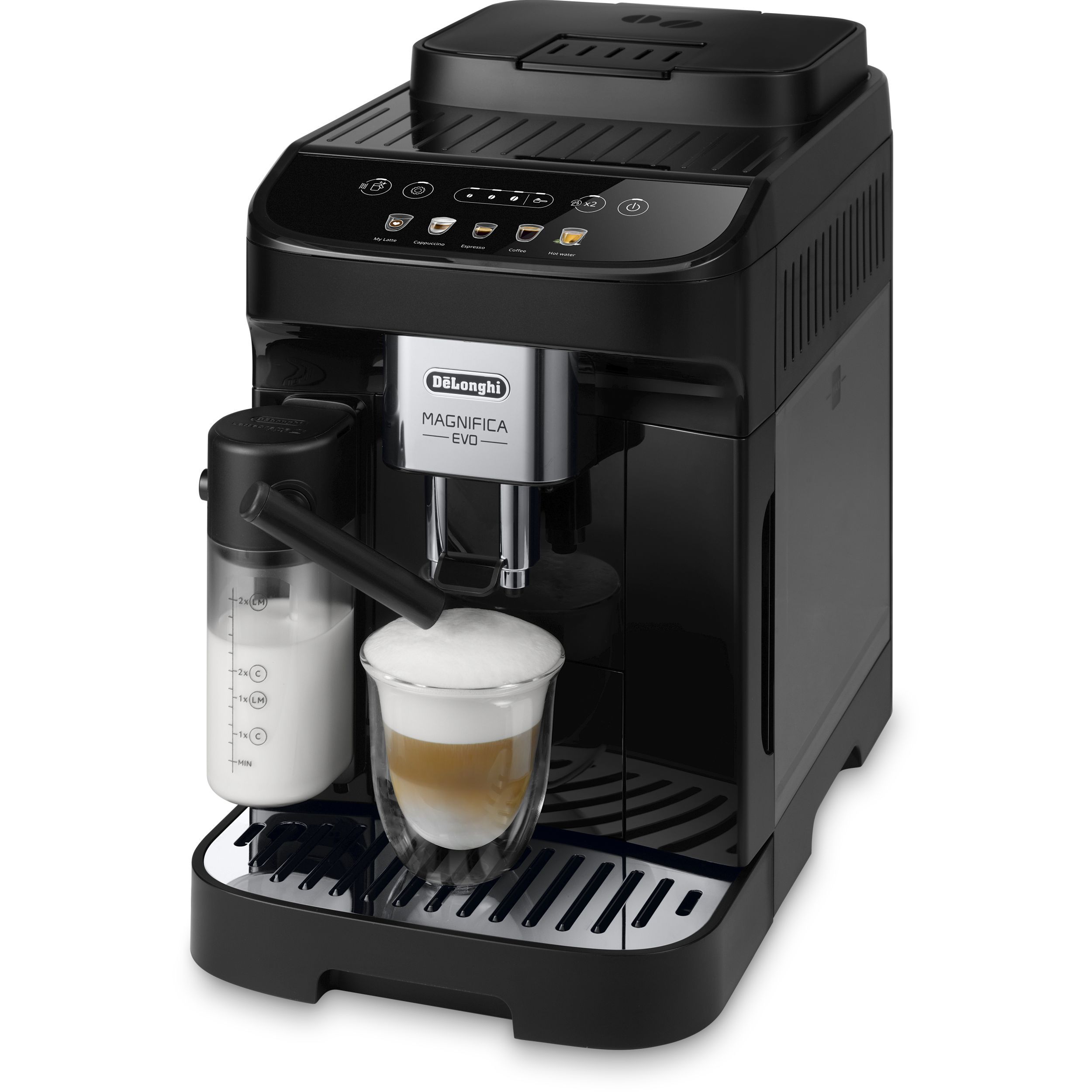 Magnifica Evo întruchipează experiența De'Longhi cu tehnologia sa avansată, băuturile autentice și designul elegant, negru, modern. Alegeți espresso-ul italian perfect dintr-un meniu variat de alte băuturi pe bază de cafea și lapte, cu 5 rețete preparate cu o singură atingere, disponibile prin intermediul afișajului color intuitiv. Bucurați-vă de textura mătăsoasă și catifelată a spumei de lapte dense și cremoase, grație Sistemului LatteCrema exclusivist.