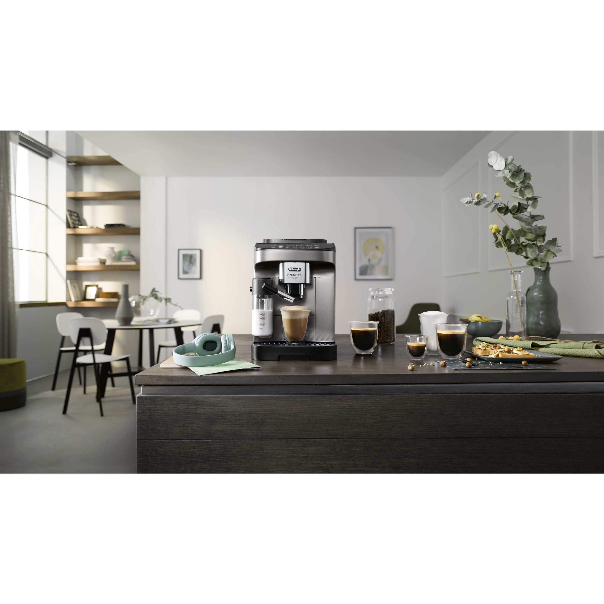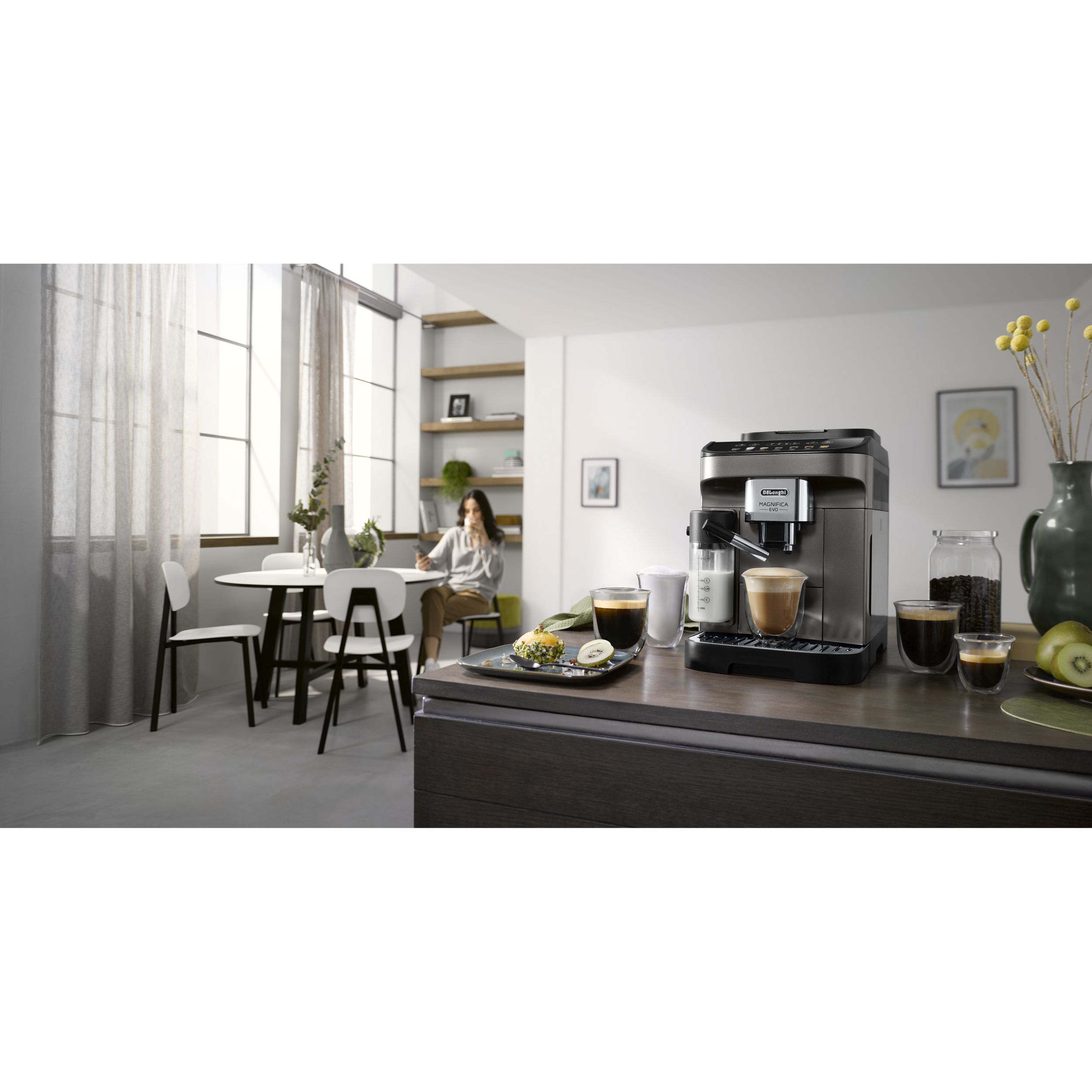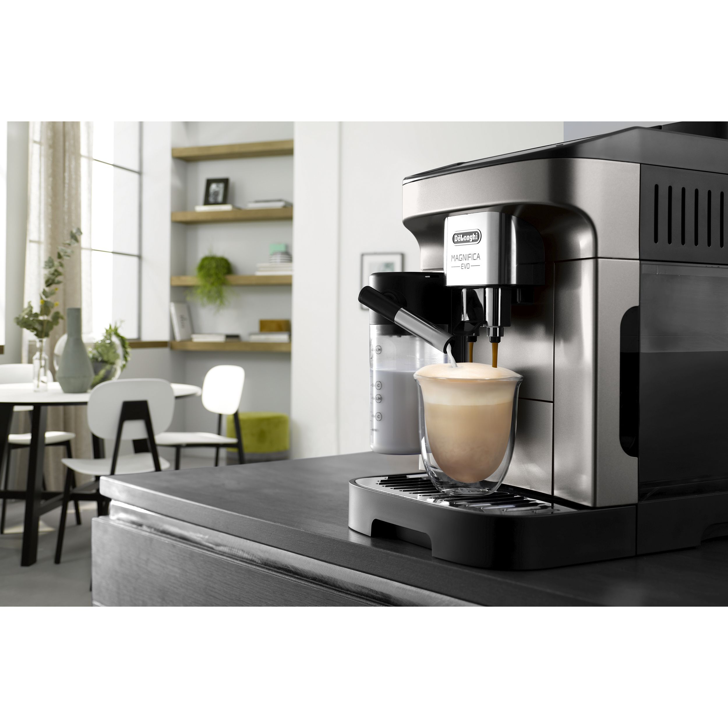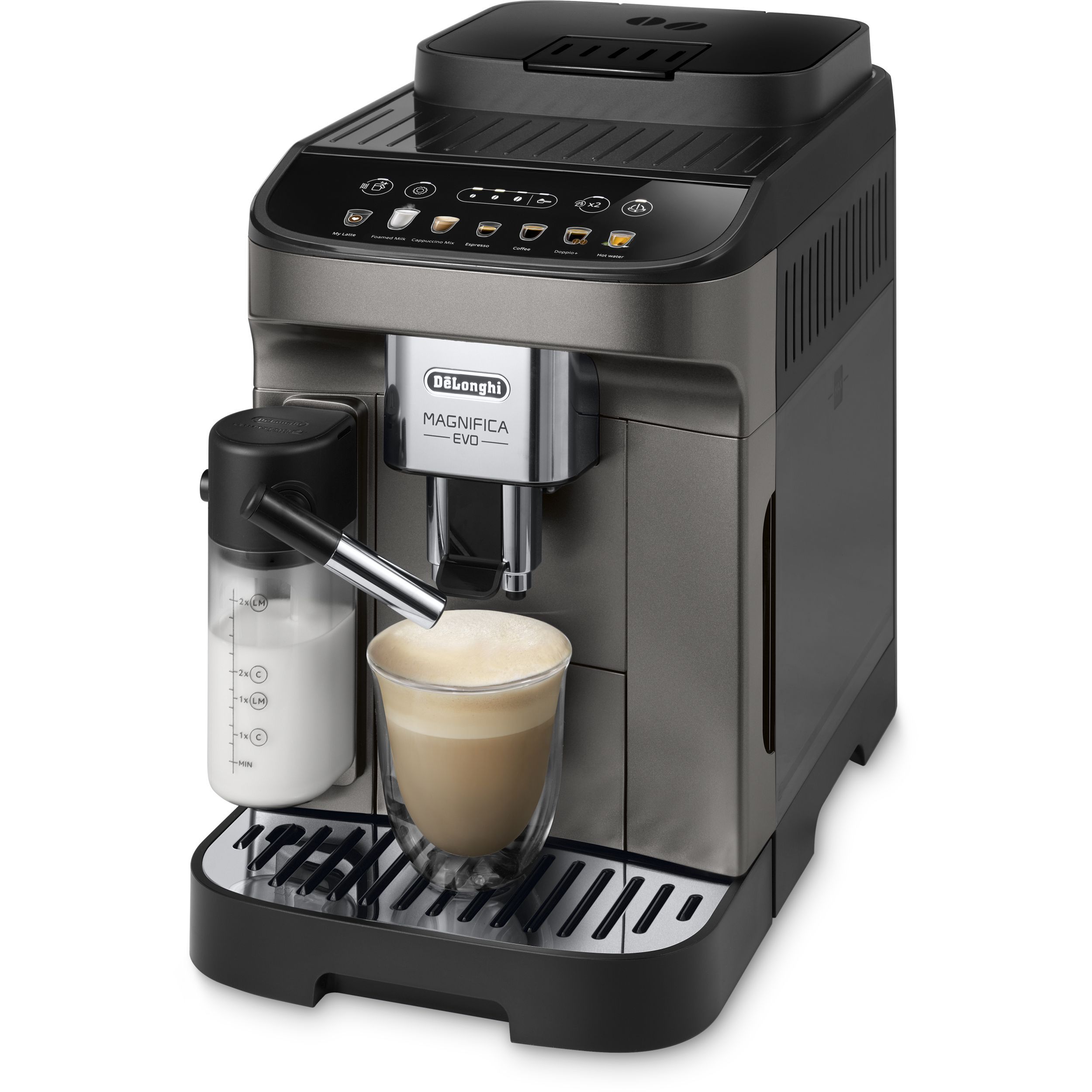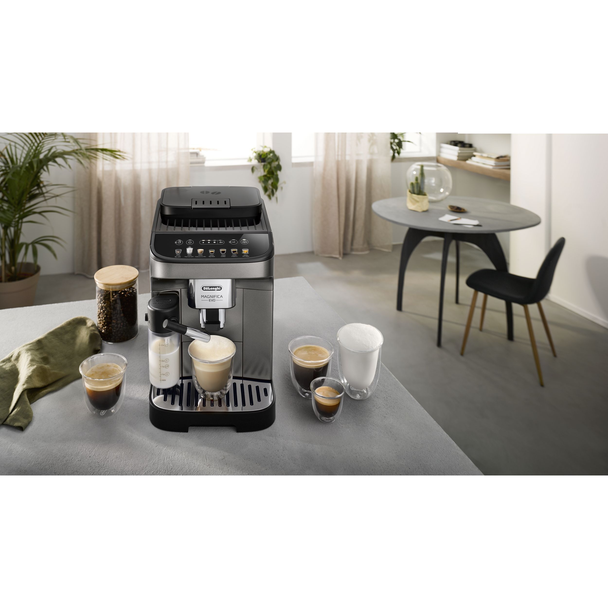 Magnifica Evo întruchipează experiența De'Longhi cu tehnologia sa avansată, băuturile autentice și designul modern elegant. Savurați espressoul italian perfect și o varietate de alte băuturi, completate cu spumă de lapte cremoasă datorită tehnologiei LatteCrema Hot și fără risipă de lapte, folosind funcția MyLatte. Puteți alege dintre 7 băuturi, cu o singură atingere, prin intermediul interfeței simple de utilizare.