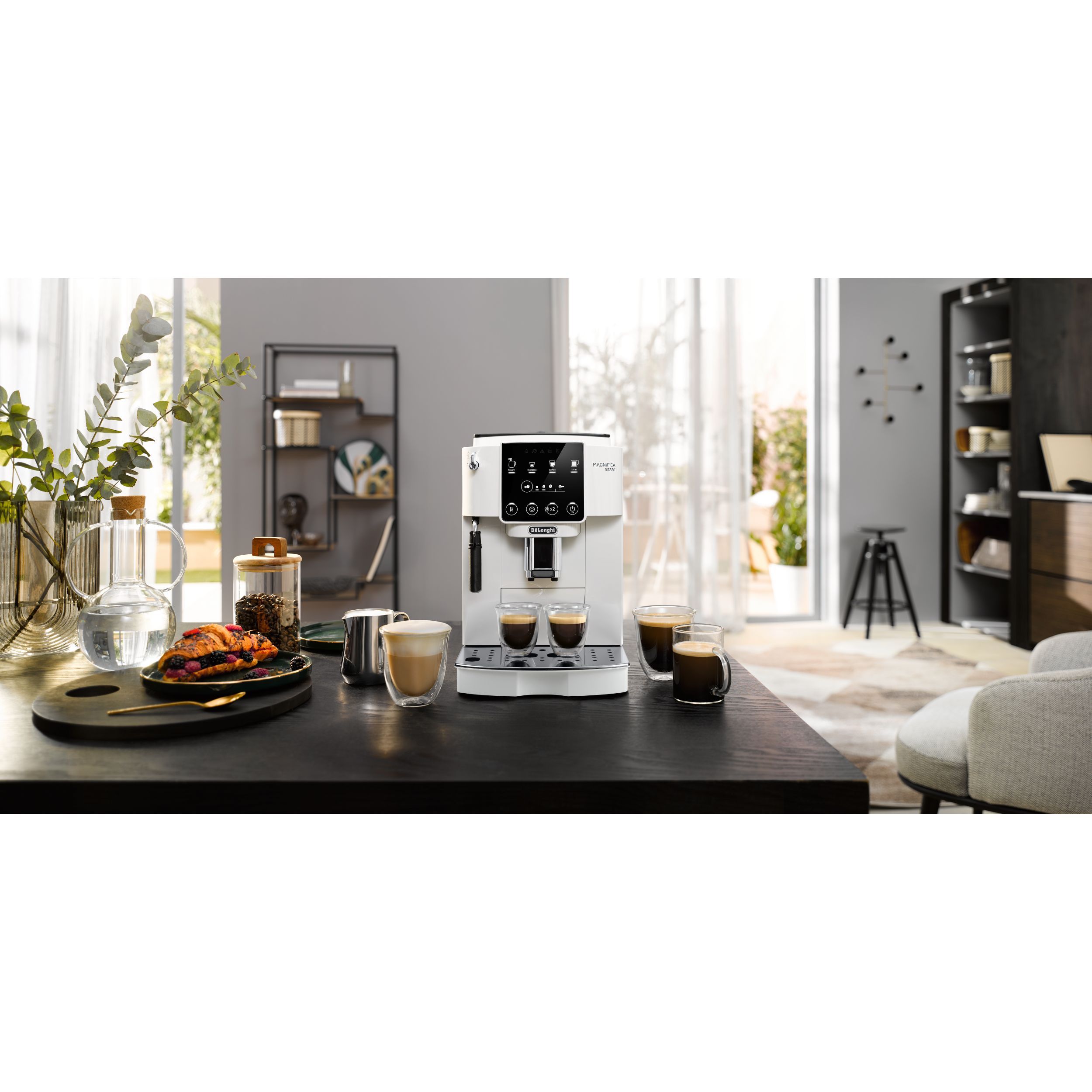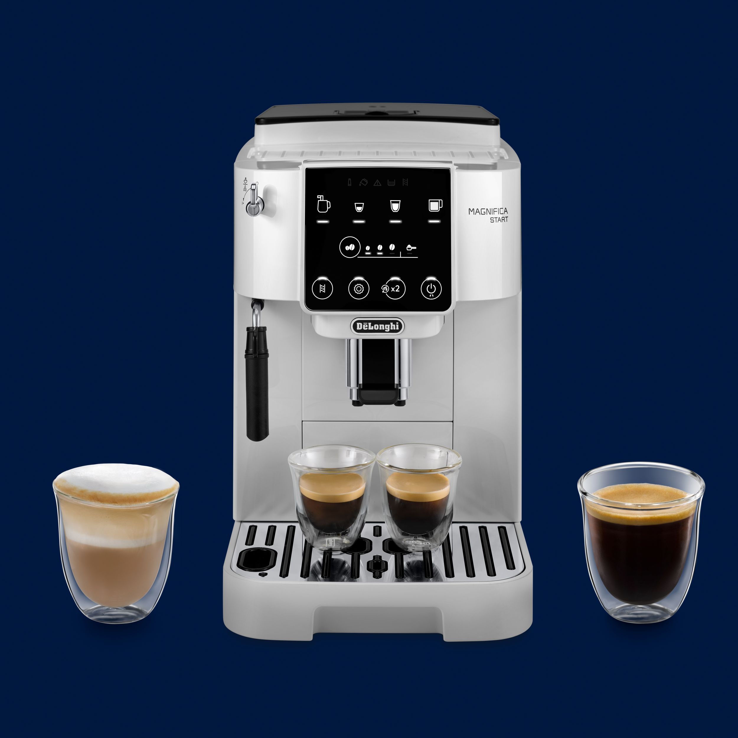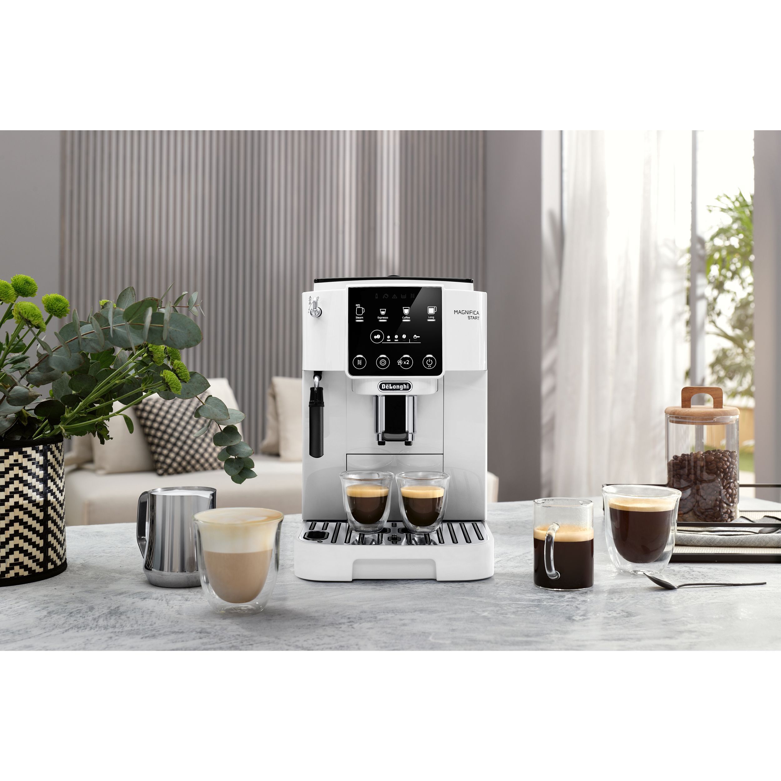 Espressorul automat De’Longhi Magnifica Start îți oferă tot ce ai nevoie pentru a pătrunde în lumea cafelei, la tine acasă, preparând băuturile tale preferate pe bază de espresso. Echipat cu o interfață prietenoasă și având un finisaj alb atrăgător, pune la dispoziție o selecție personalizată de băuturi preparate cu o simplă atingere de buton.