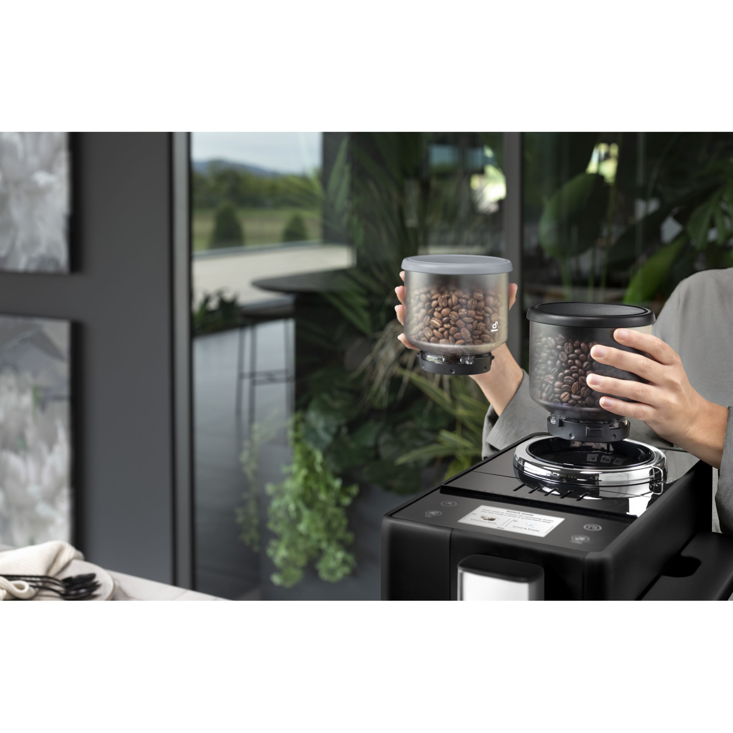 Espressorul este echipat cu 2 recipiente interschimbabile pentru boabele de cafea, fiecare cu capacitate de 250g.