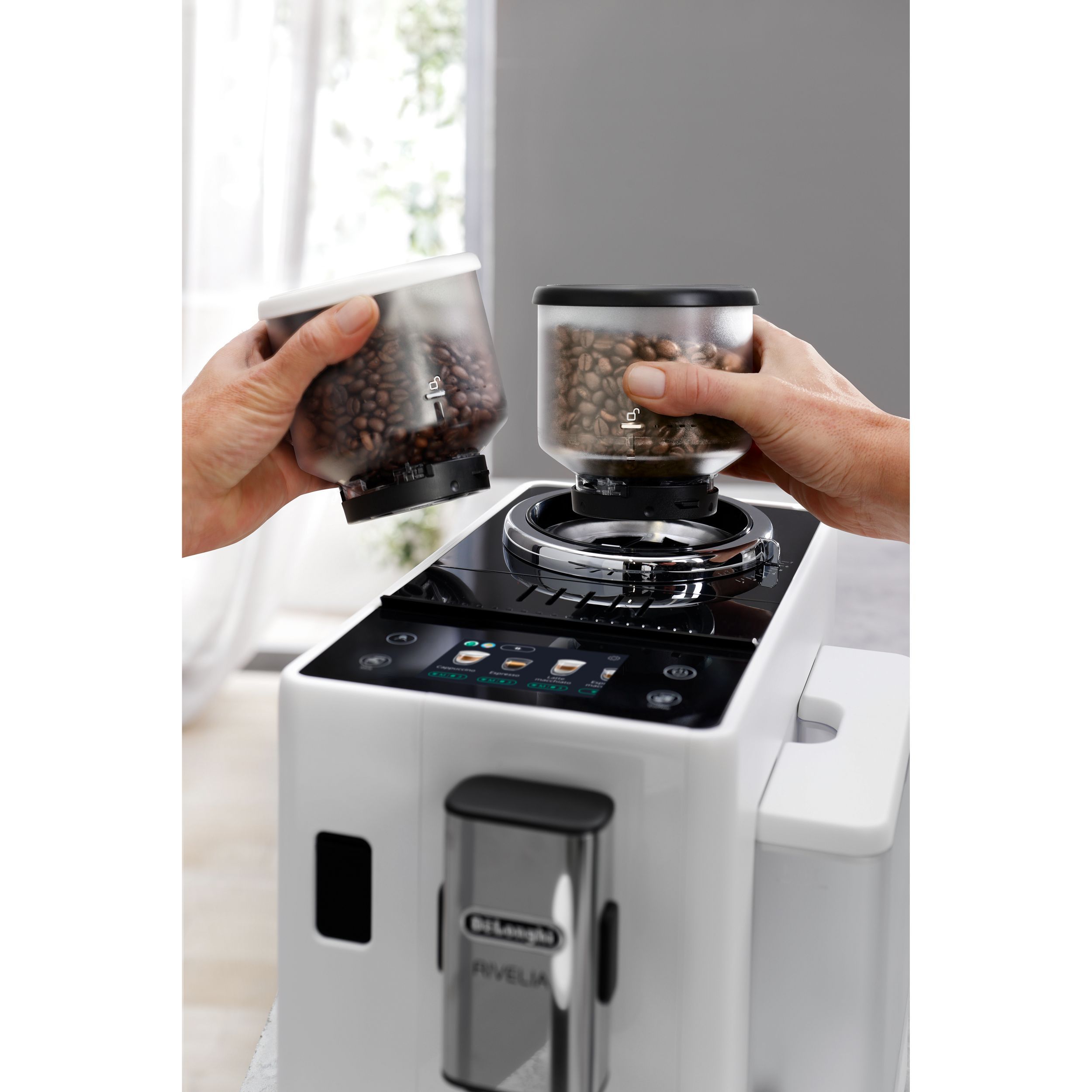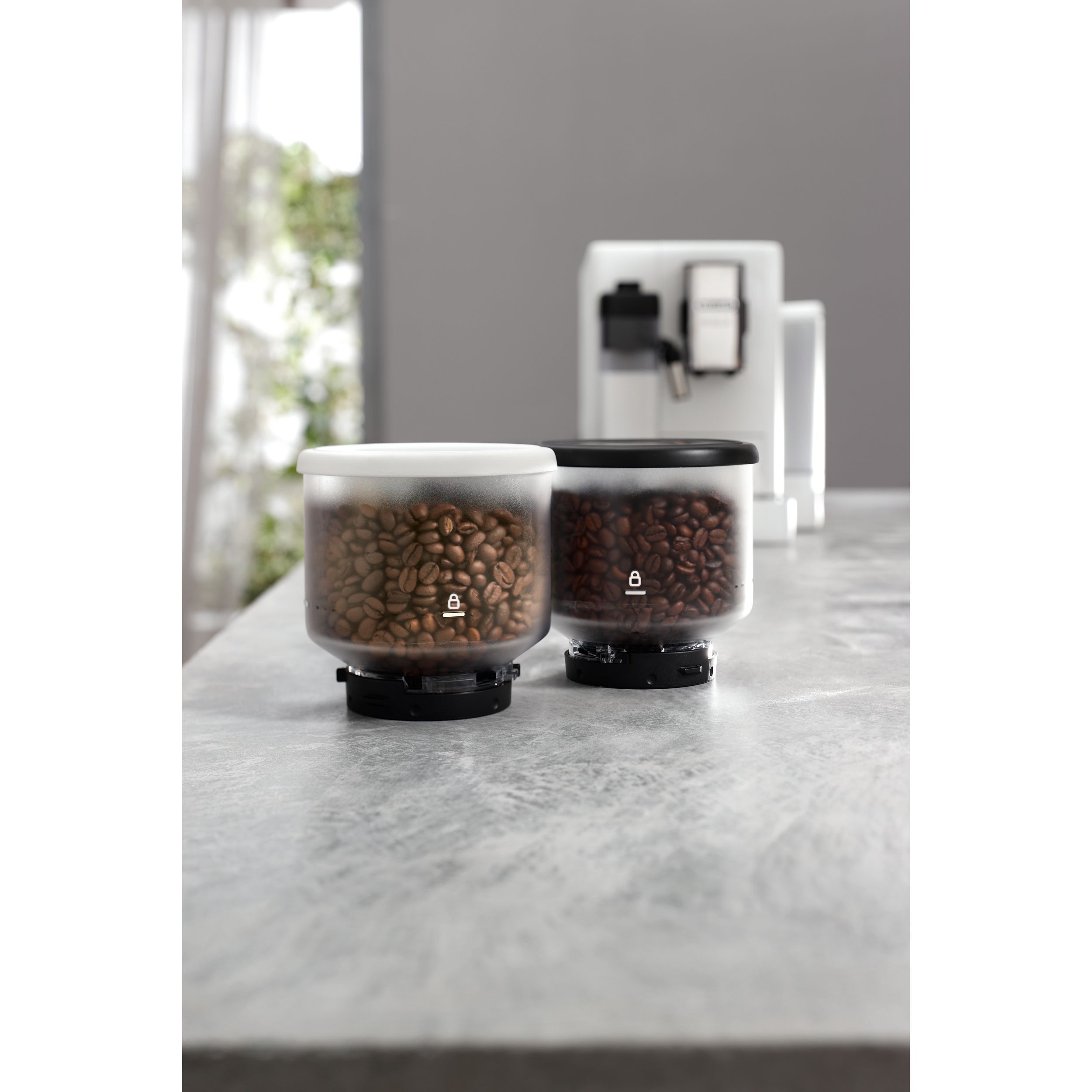 Espressorul este echipat cu 2 recipiente interschimbabile pentru boabele de cafea, fiecare cu capacitate de 250g.