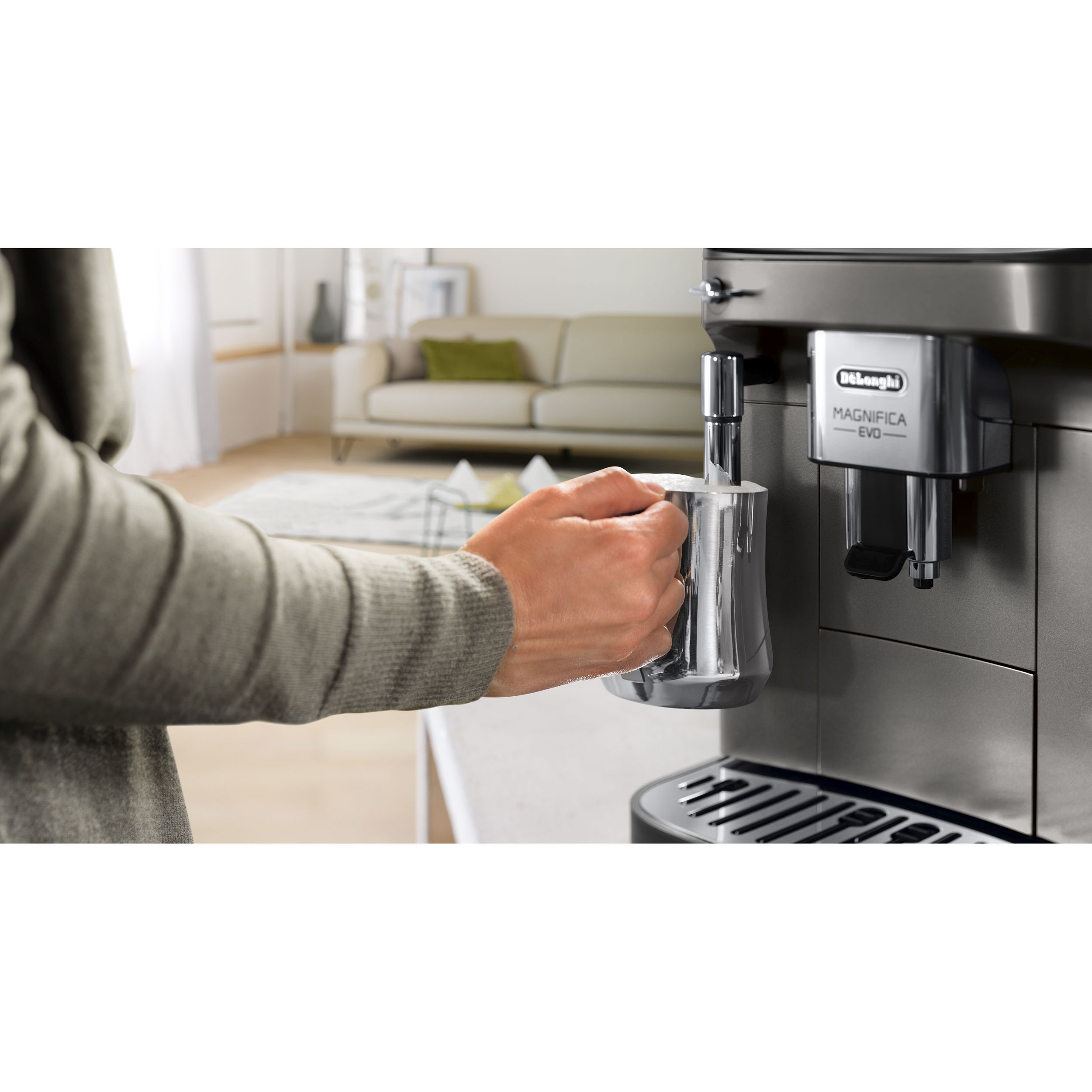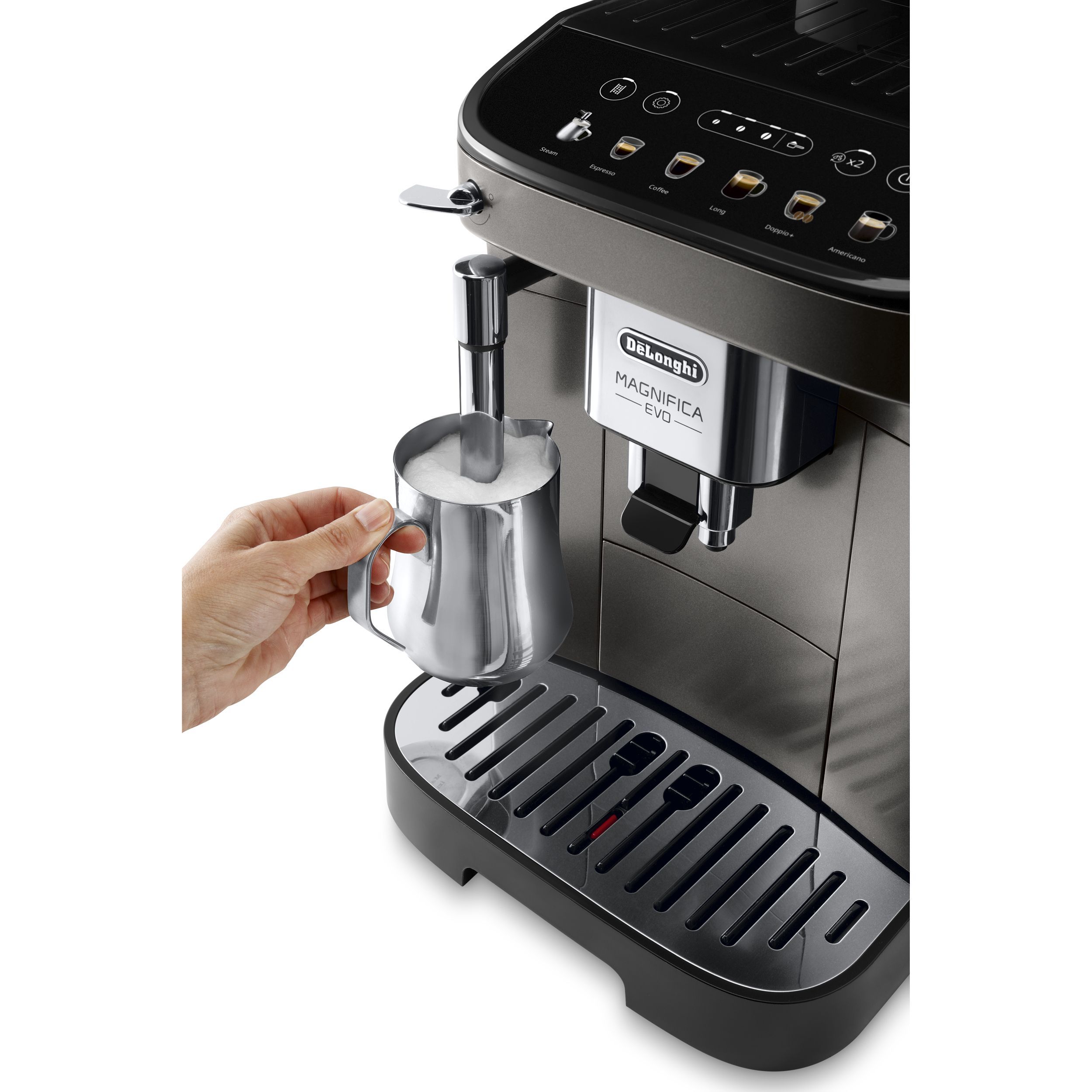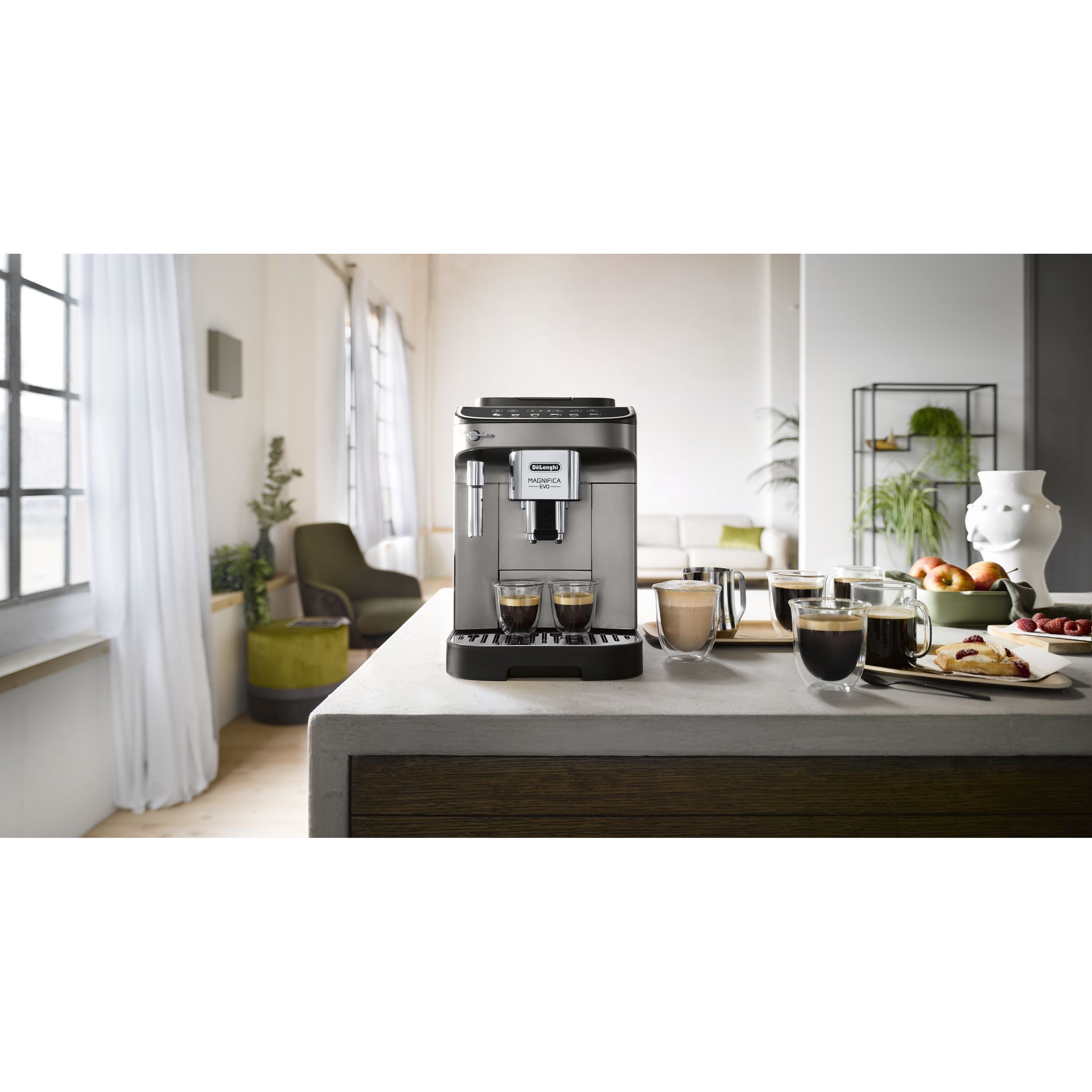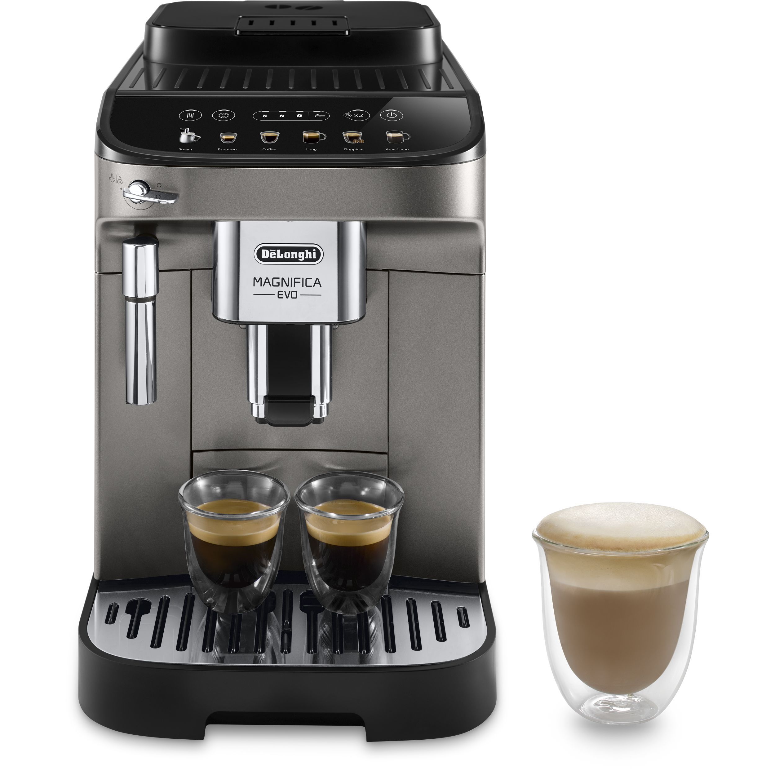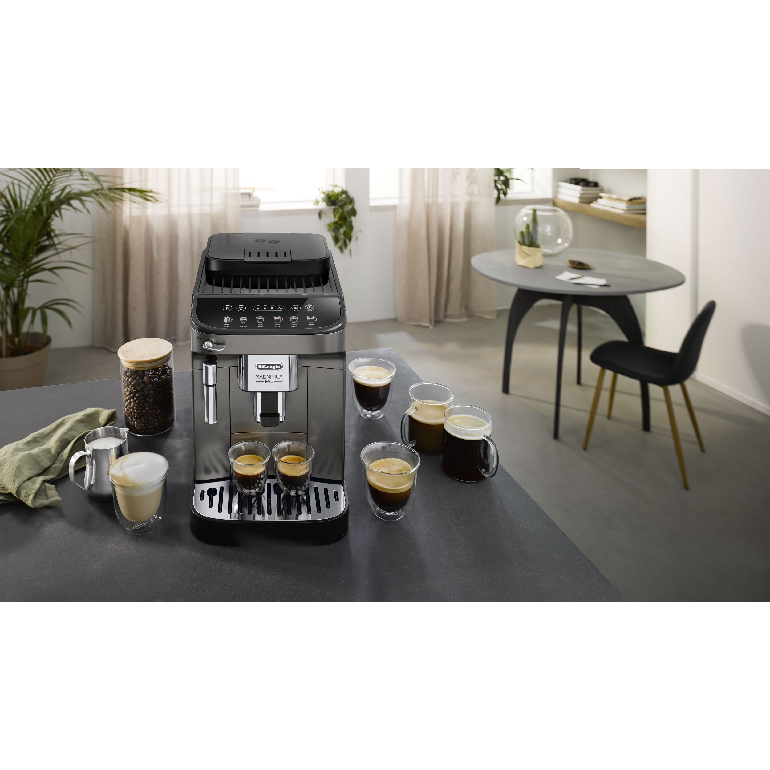Bucură-te de experiența supremă a cafelei în confortul propriei locuințe cu De’Longhi Magnifica Evo! Prepară un espresso perfect din boabe de cafea proaspăt râșnite, cu o simplă atingere de buton, alegând una dintre cele 5 rețete disponibile. Ecranul este intuitiv, cu funcție tactilă și pictograme color. Finisajul elegant titanium negru completează perfect orice bucătărie.