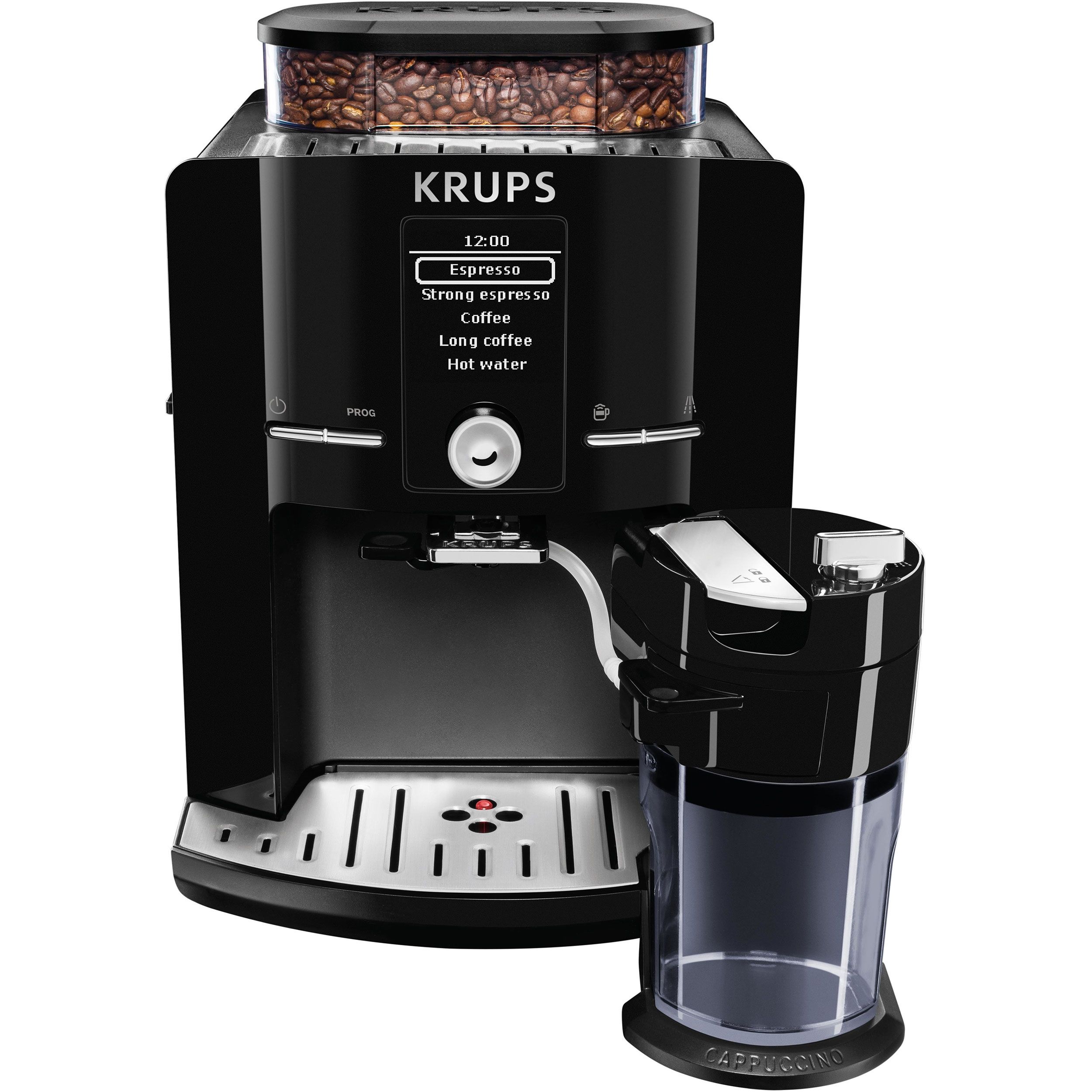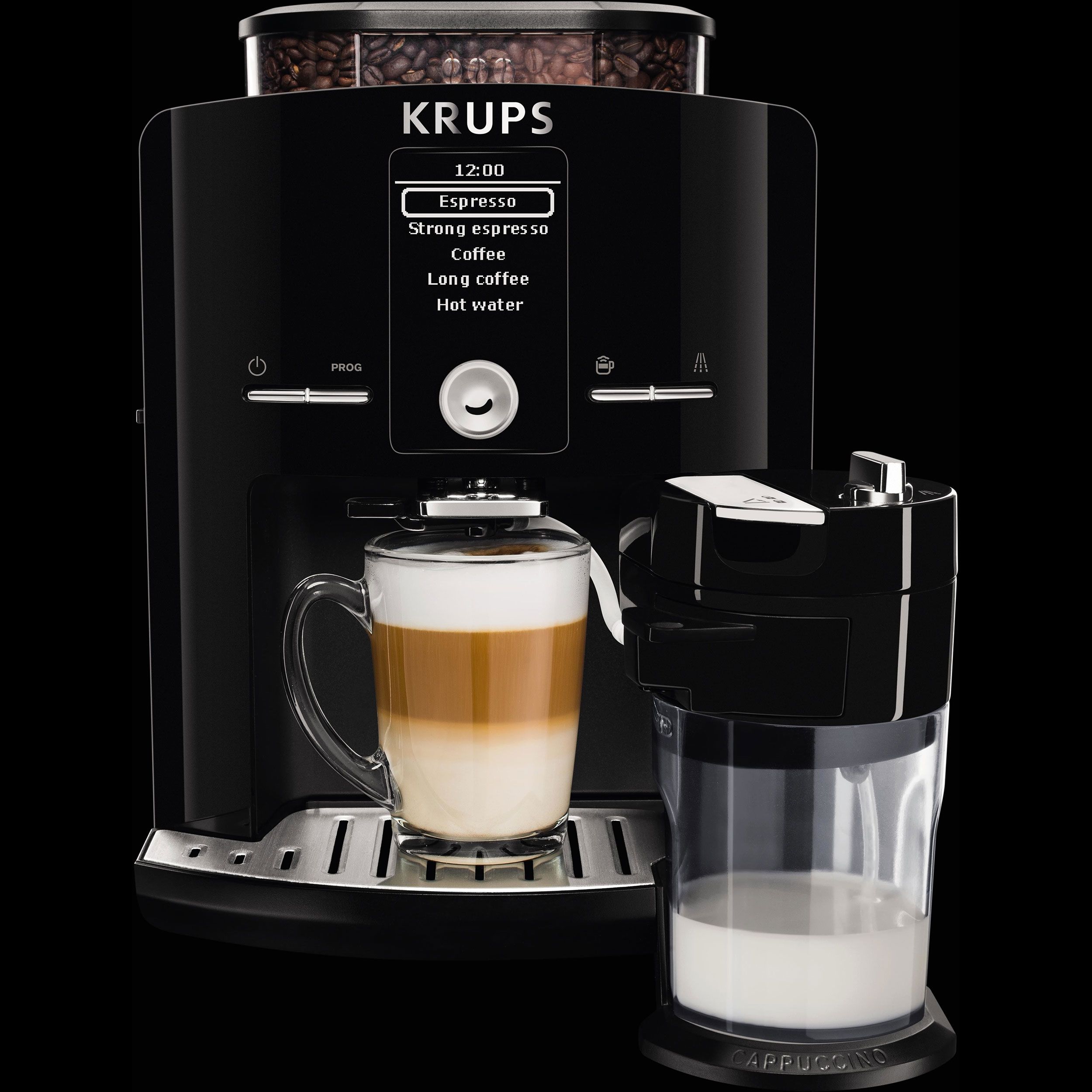 Cu espressorul automat KRUPS Latt`Espress prevăzut cu sistemul One-Touch-Cappuccino te bucuri de un cappuccino aromat și perfect echilibrat obținut din ingrediente proaspete, cu o singură atingere. Savurează gustul și calitatea deosebită datorită unei game mari de băuturi preparate perfect, pornind de la boabele de cafea direct în ceașcă. Mulțumită ecranului LCD intuitiv prepari cu ușurință băuturile tale preferate. Designul compact îl face să se potrivească perfect în orice bucătărie. Mai mult, acesta este prevăzut cu un recipient pentru 260 g de boabe de cafea și un rezervor pentru apă de 1.7 L. Espressorul automat vine la pachet cu un recipient pentru lapte dedicat conceput pentru a se potrivi perfect pe ușa frigiderului. Sistemul Patentat Thermoblock Compact oferă băuturi excepționale, o adevărată explozie de gust și savoare.