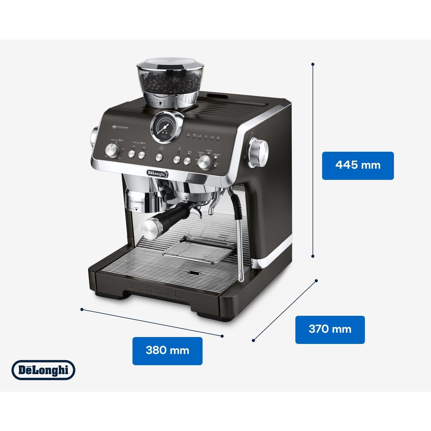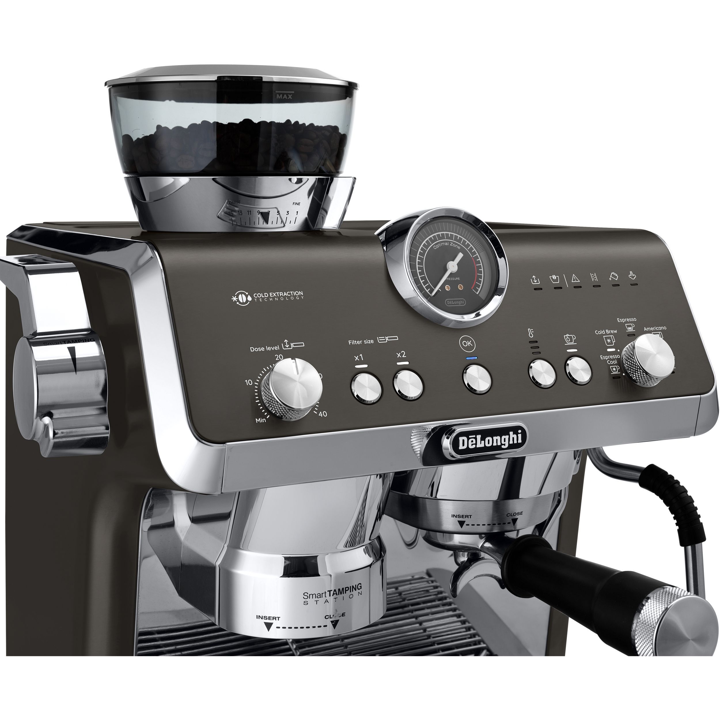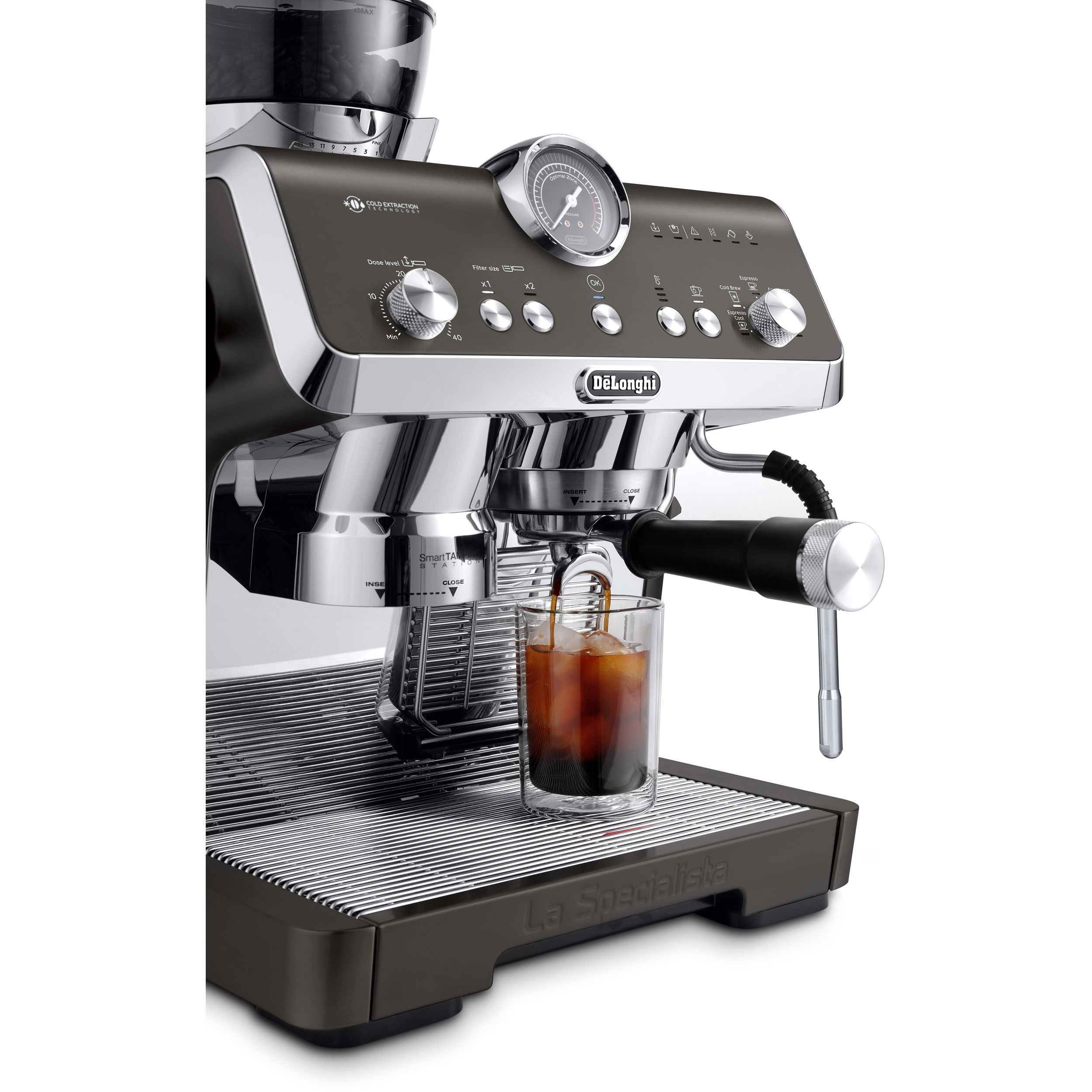 Stația de presare inteligentă reduce murdăria și asigură o presare precisă și consecventă în puc, aplicând până la 20 kg de presiune uniformă pe un portafiltru de tip profesionist.
