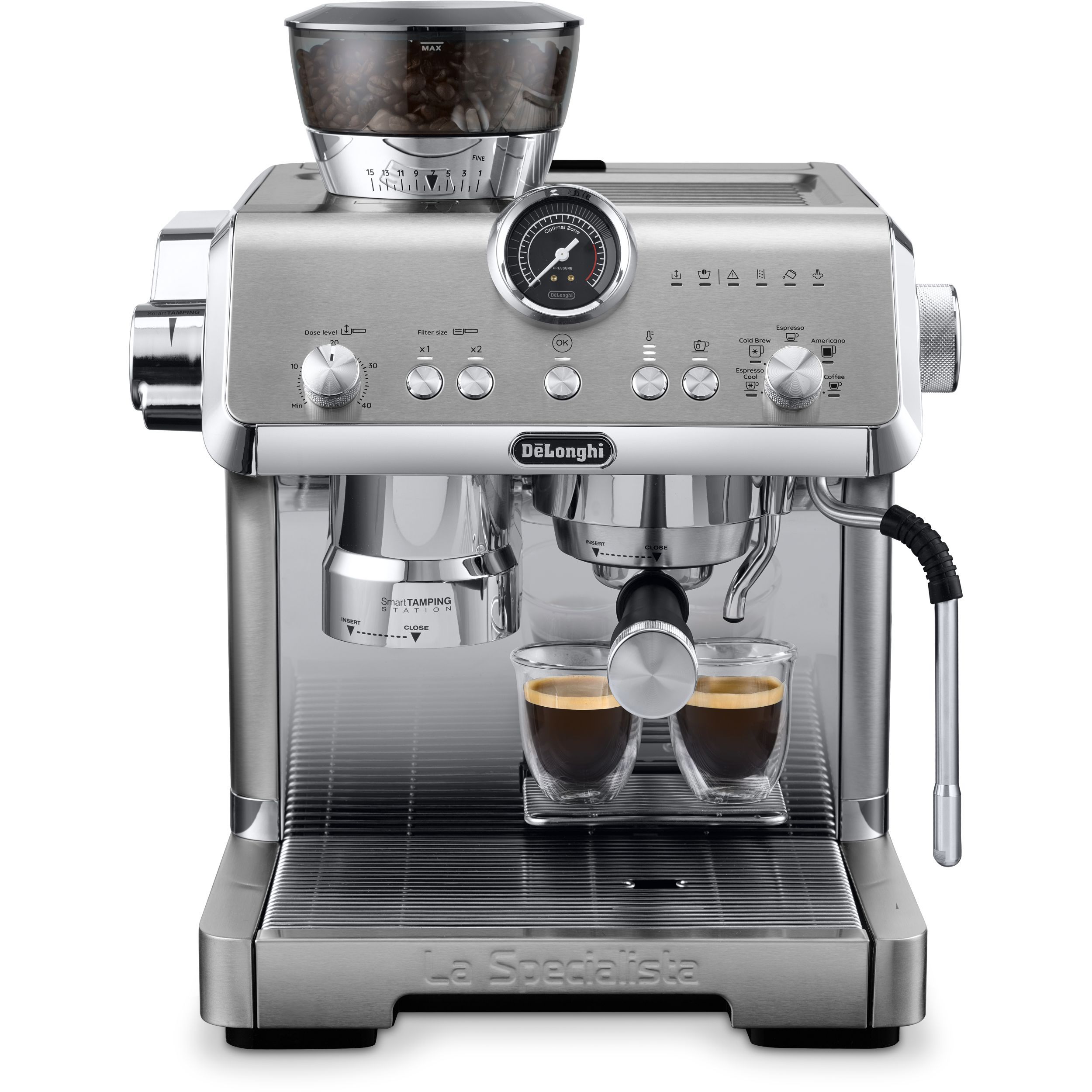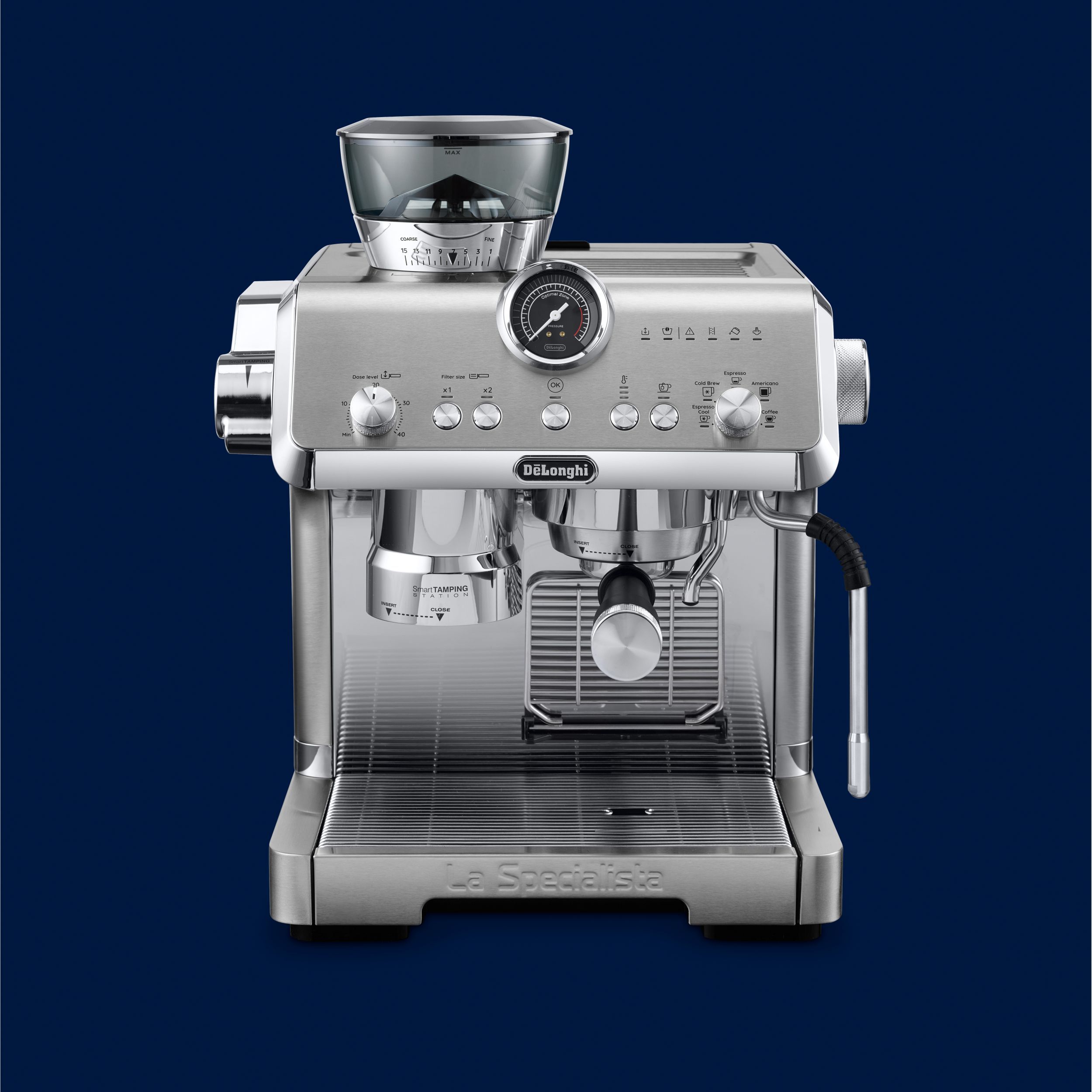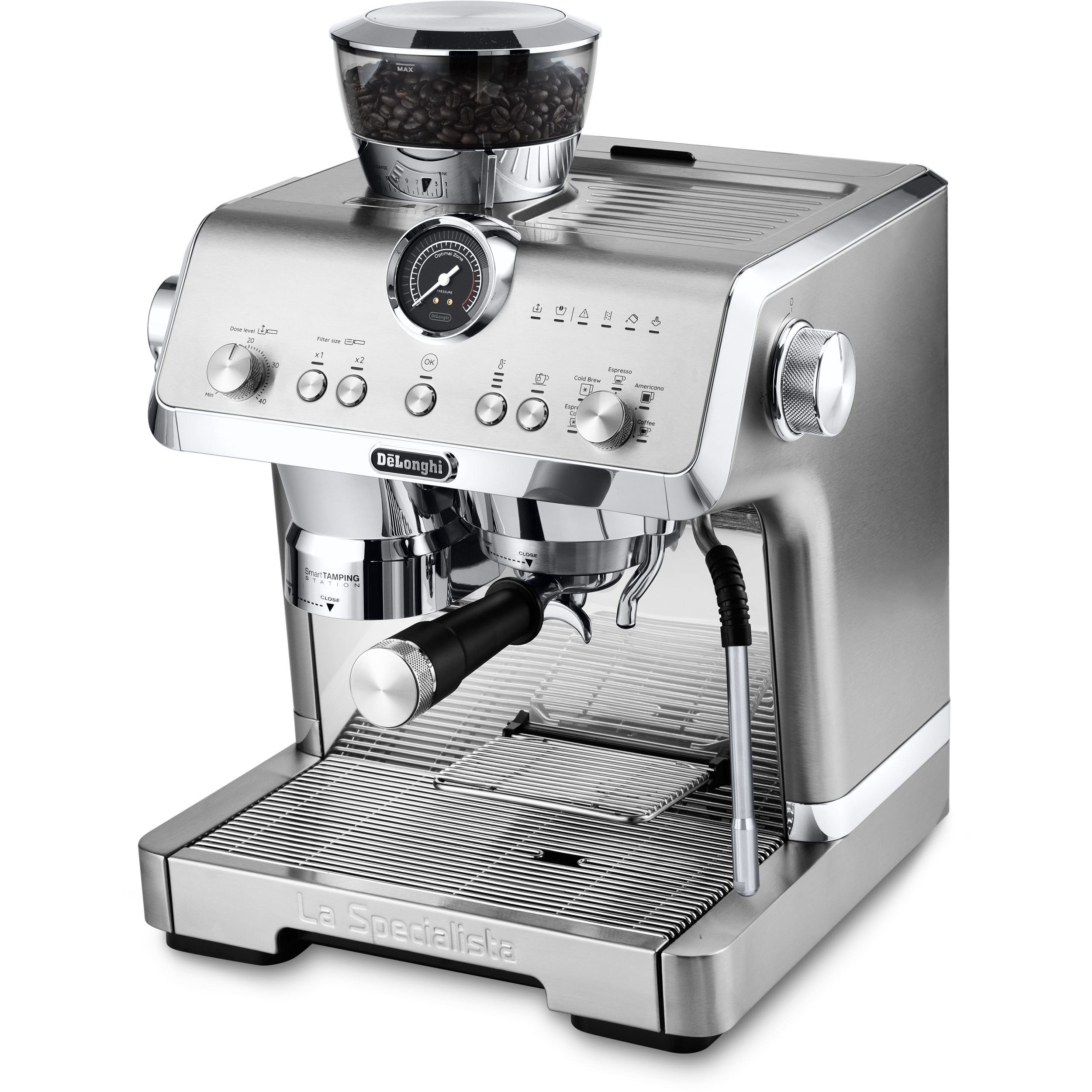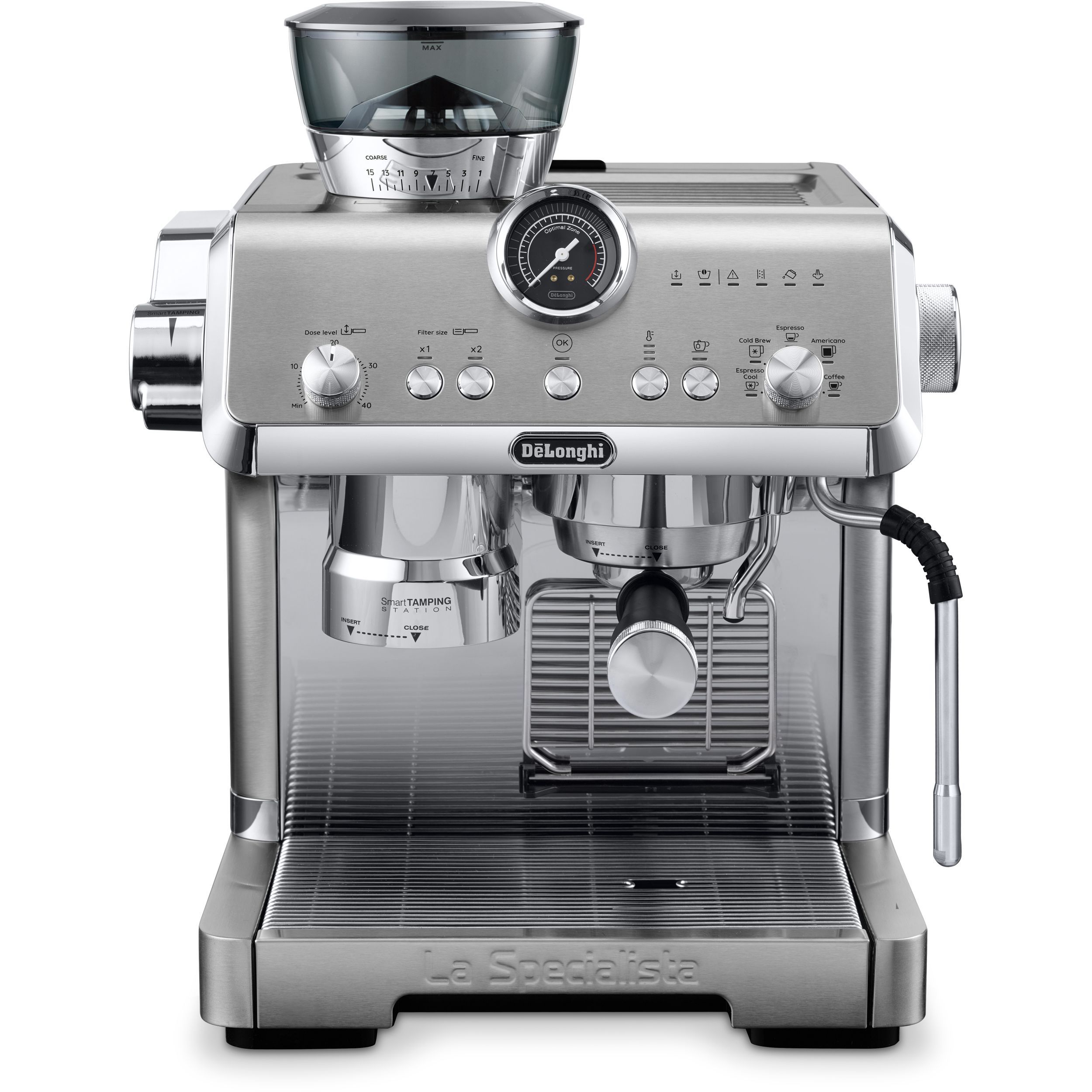 Stația de presare inteligentă reduce murdăria și asigură o presare precisă și consecventă în puc, aplicând până la 20 kg de presiune uniformă pe un portafiltru de tip profesionist.