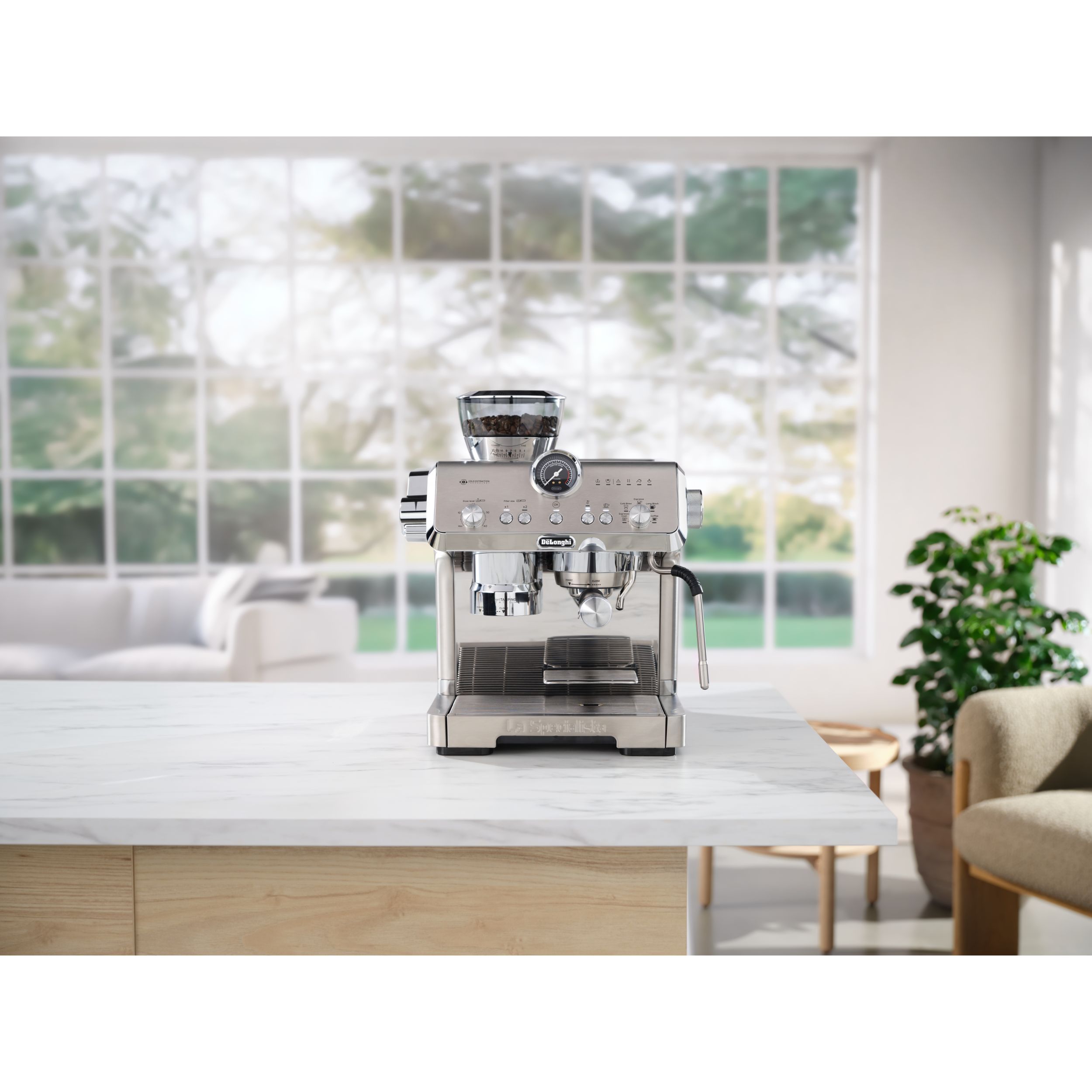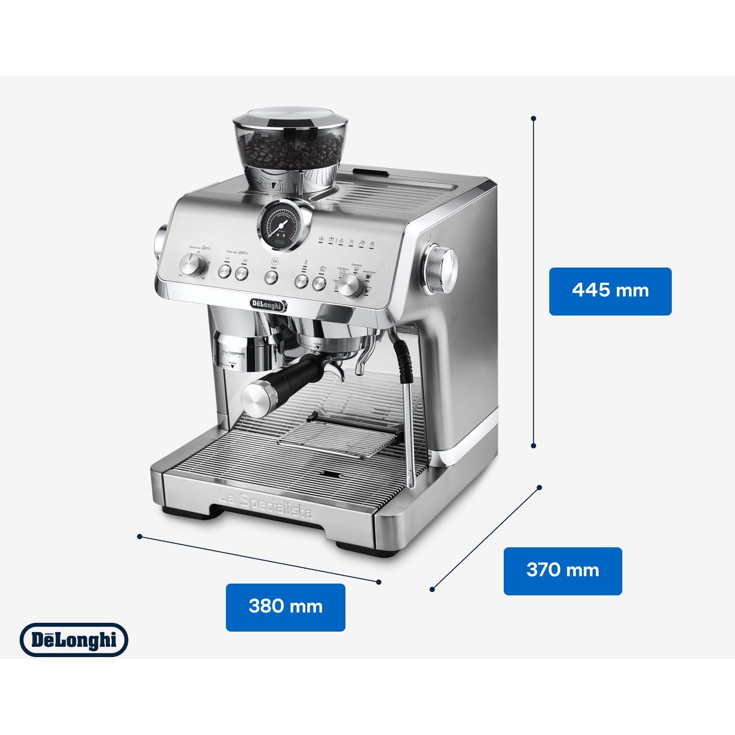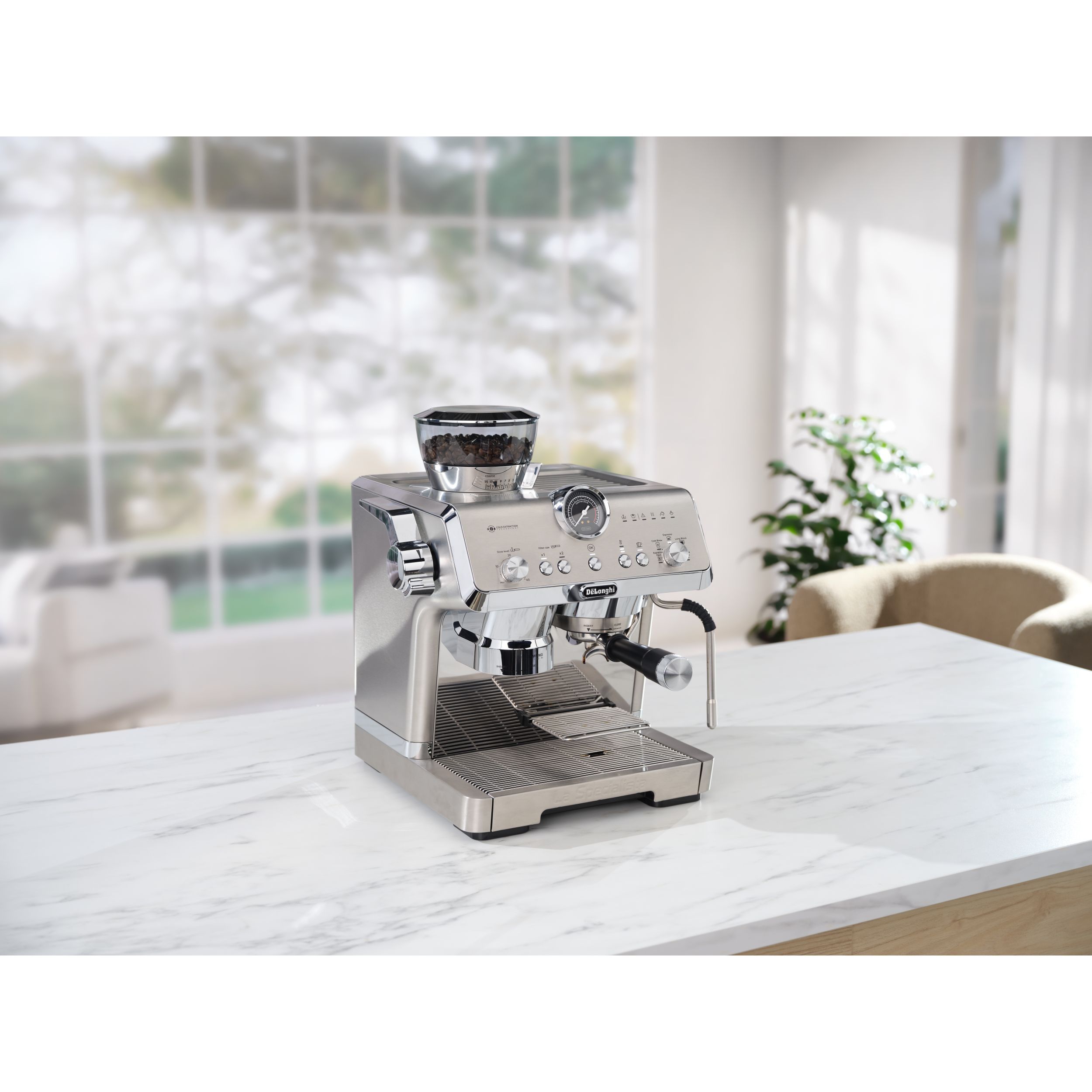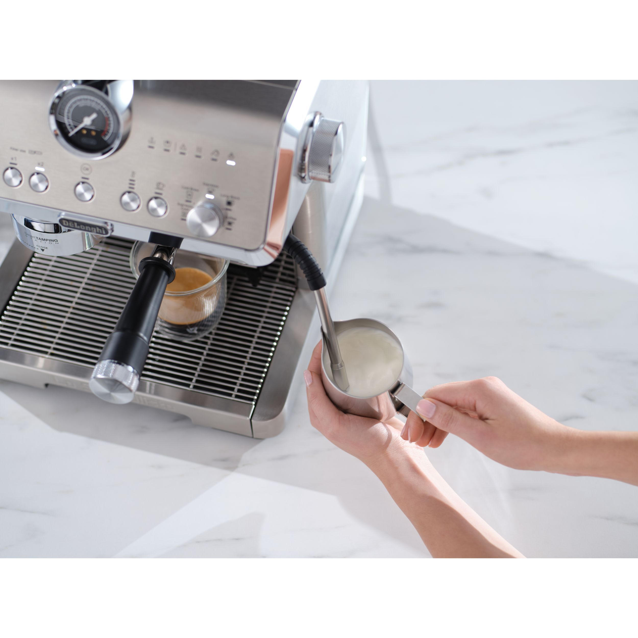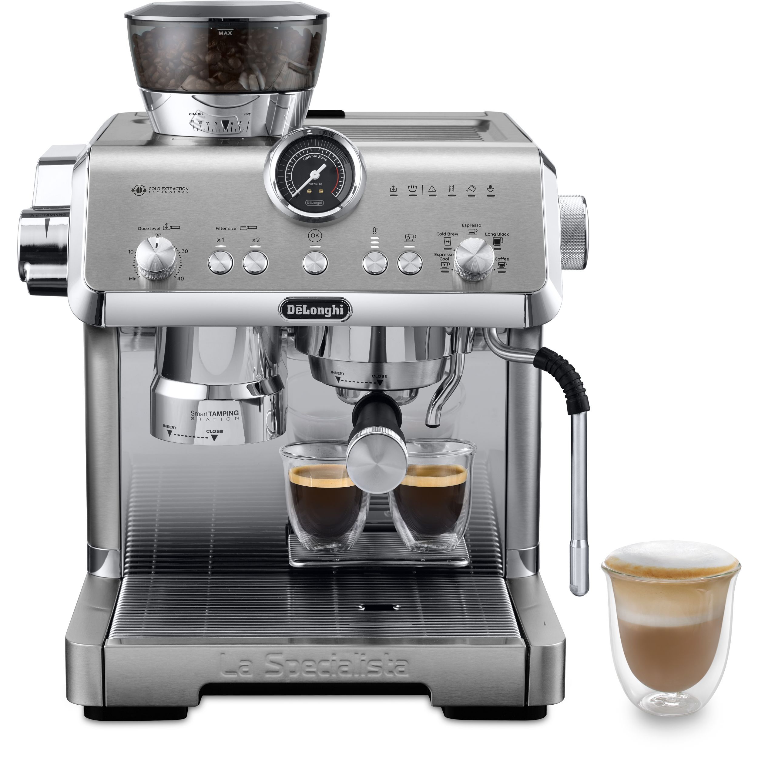 Stația de presare inteligentă reduce murdăria și asigură o presare precisă și consecventă în puc, aplicând până la 20 kg de presiune uniformă pe un portafiltru de tip profesionist.