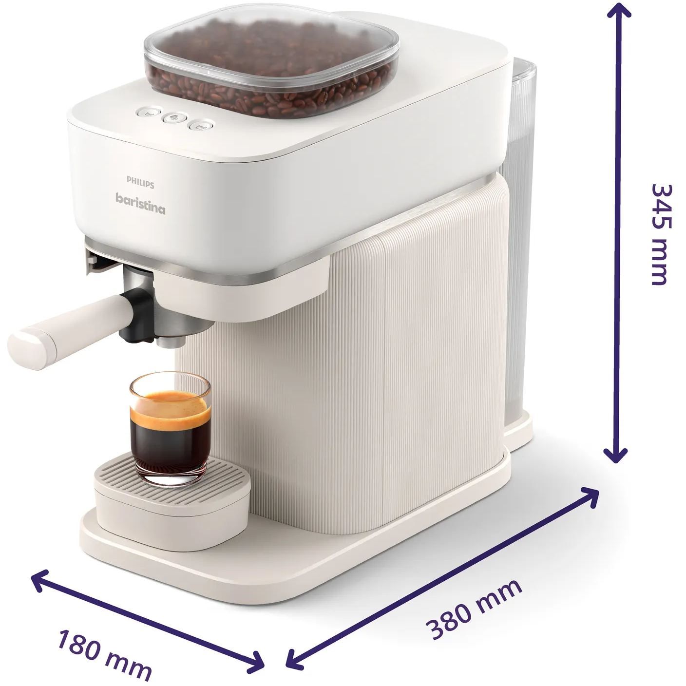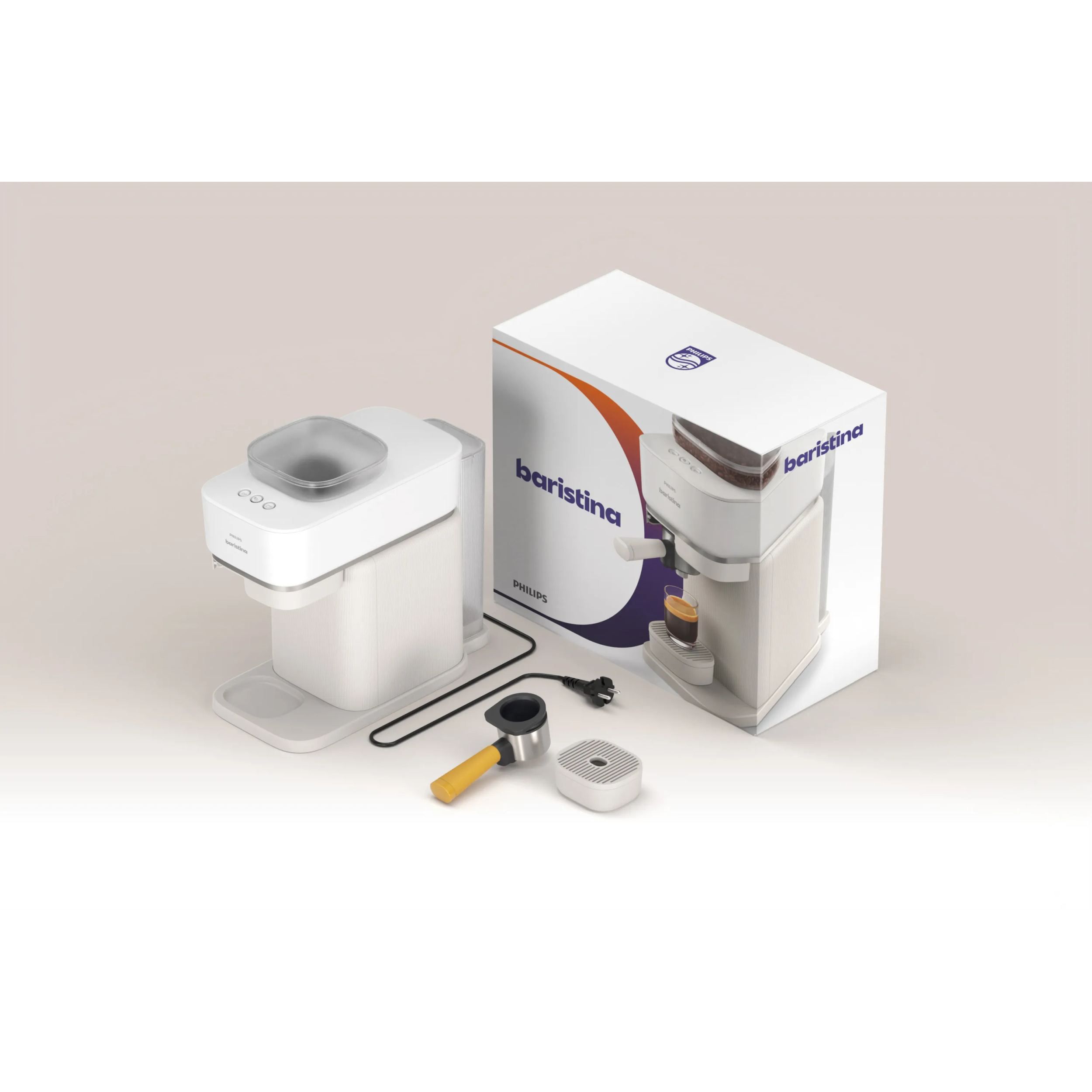 Espressor manual Philips Baristina BAR300/03, 16 bar, Râșniță ceramică, Boabe 170gr, Rezervor 1.2l, Platformă pentru cești, Oprire automată, Espresso și Lungo, Portafiltru galben, Milky White