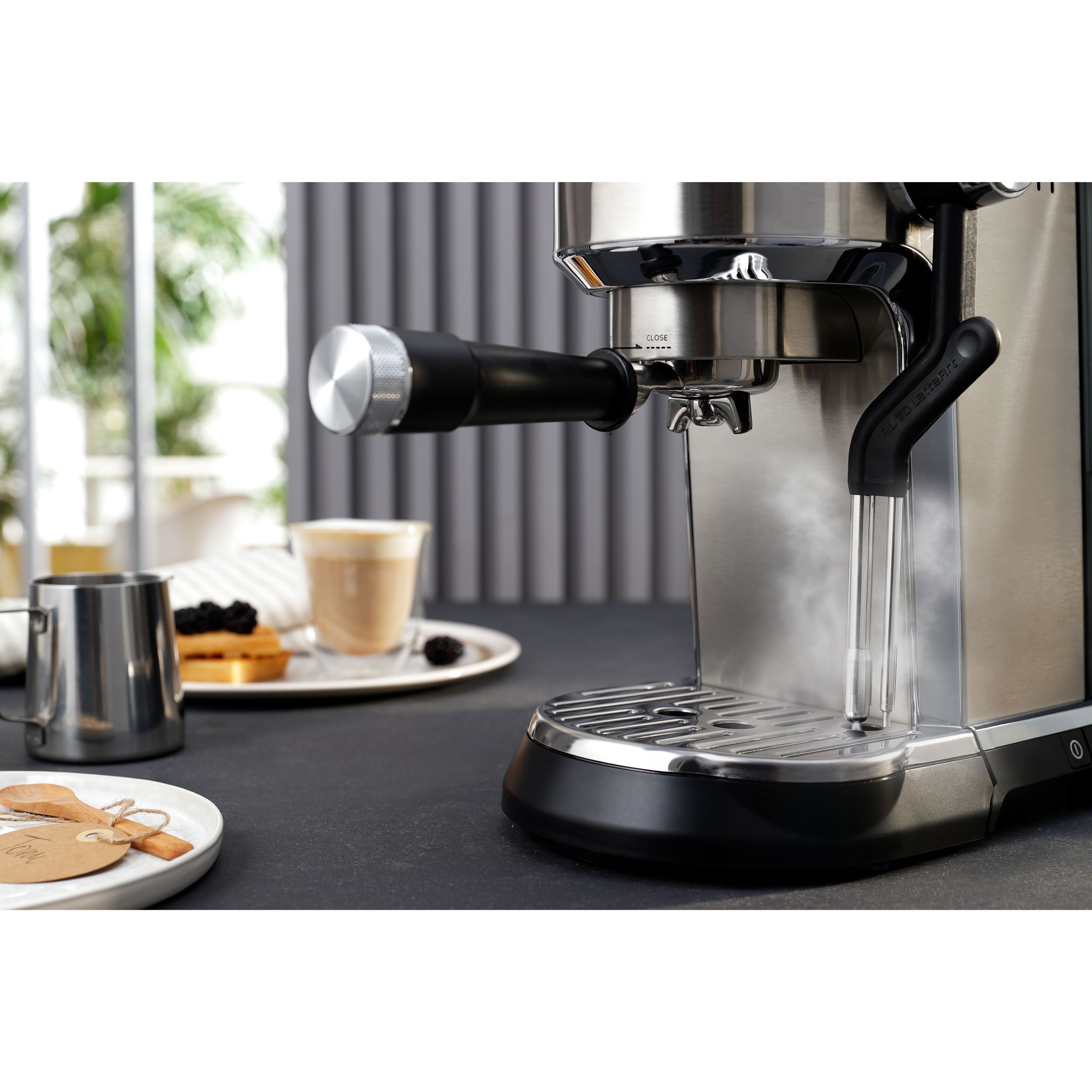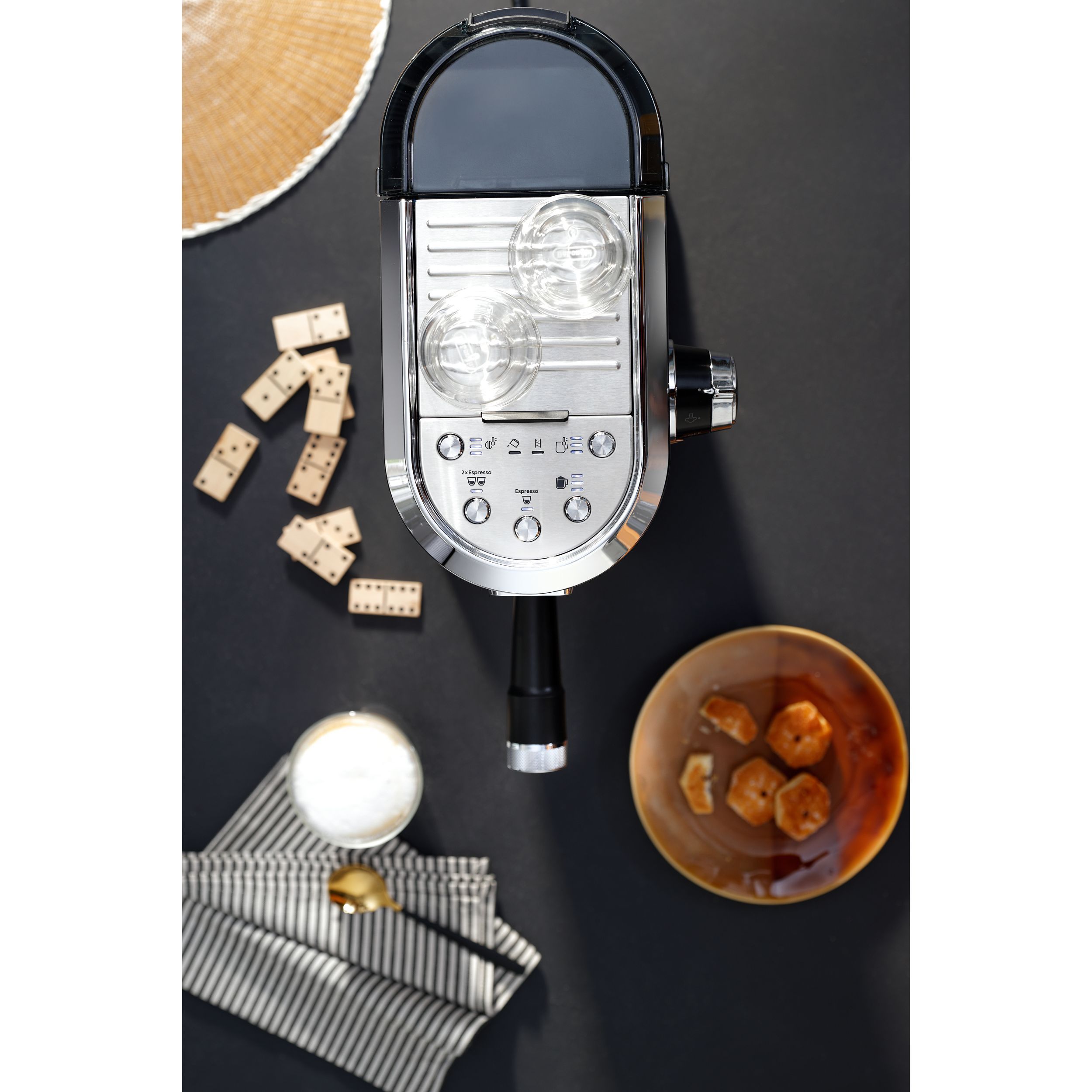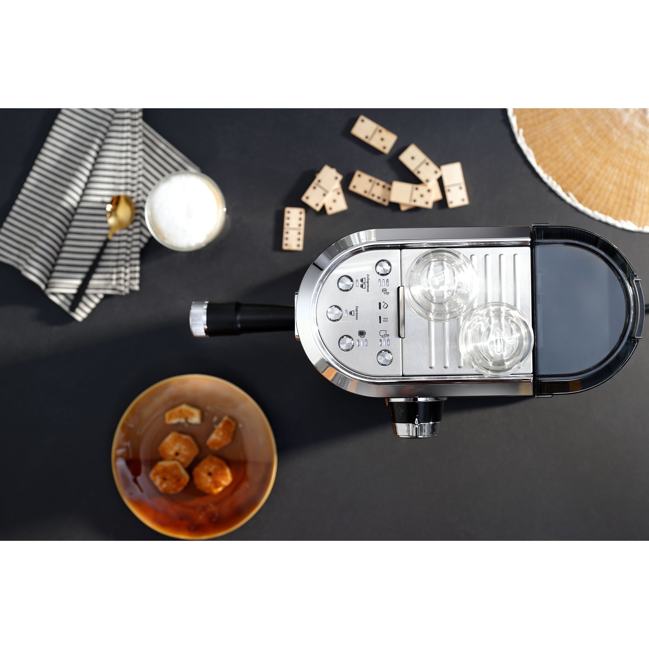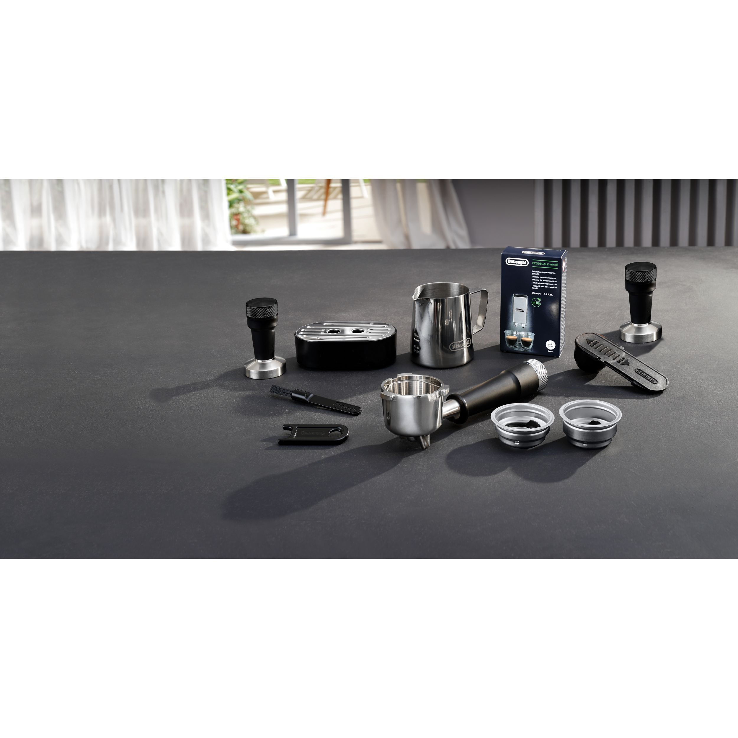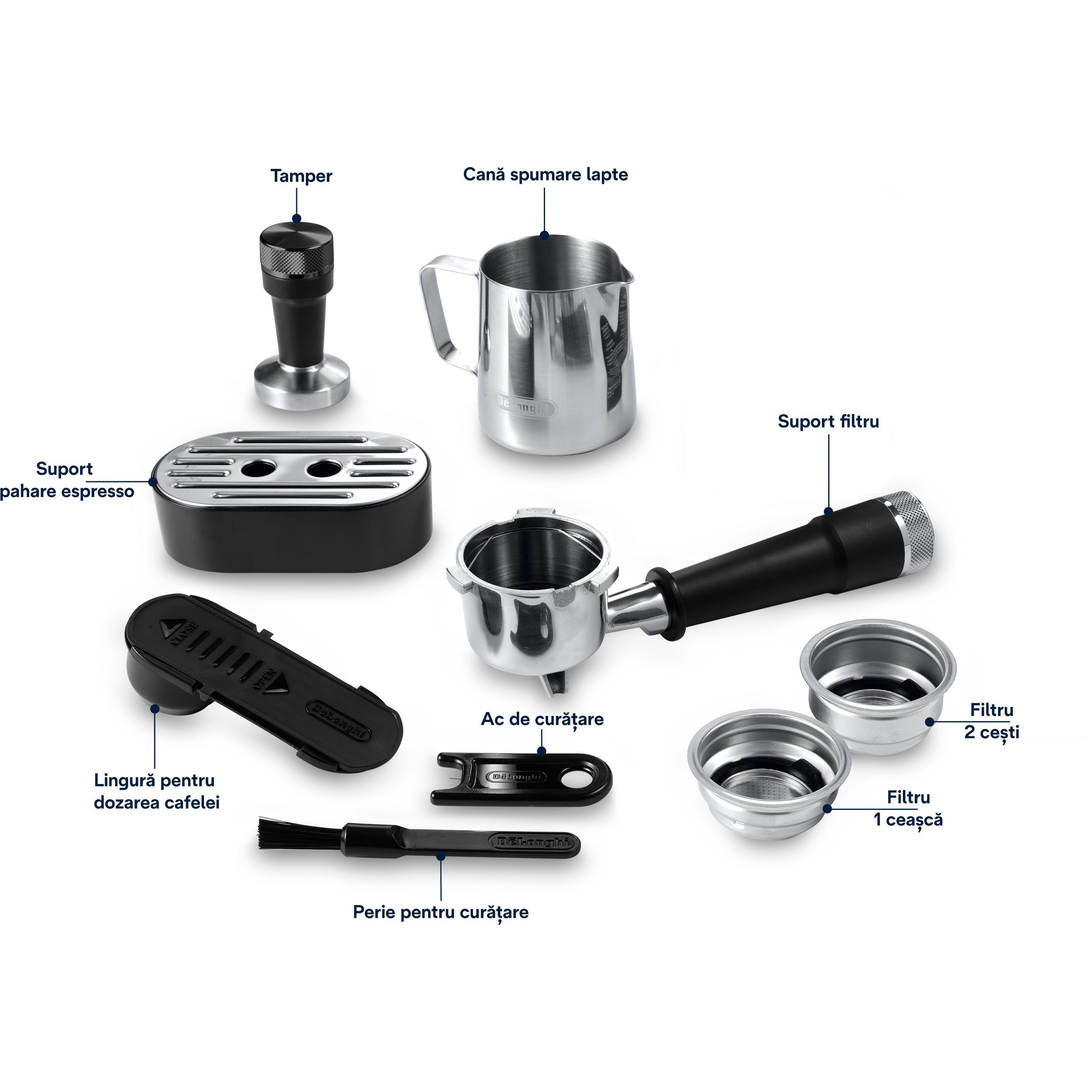 Este furnizat cu o varietate de accesorii utile incluse în pachet: tamper pentru cafea, cană pentru lapte, lingură de dozare pentru cafea și instrumente de curățare.