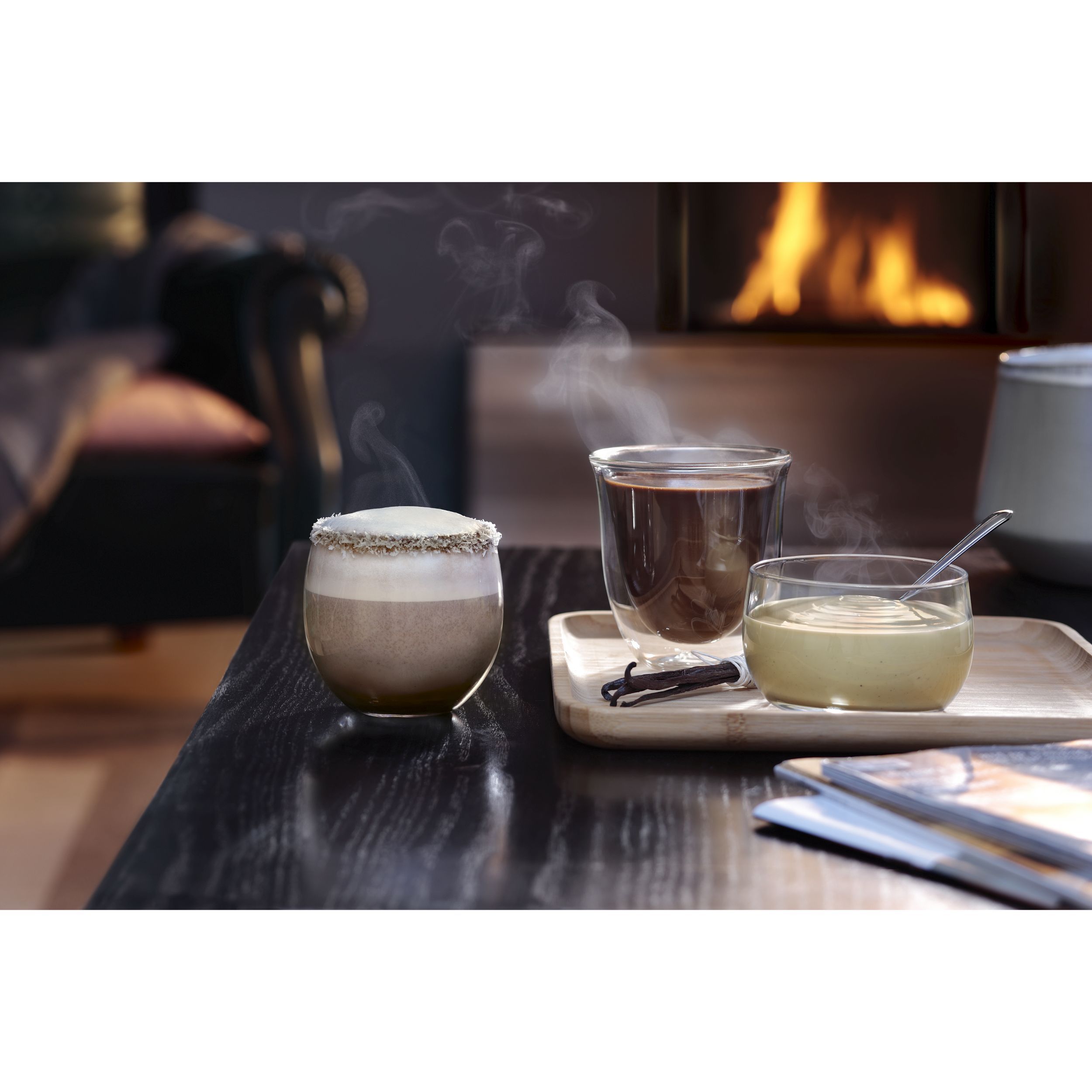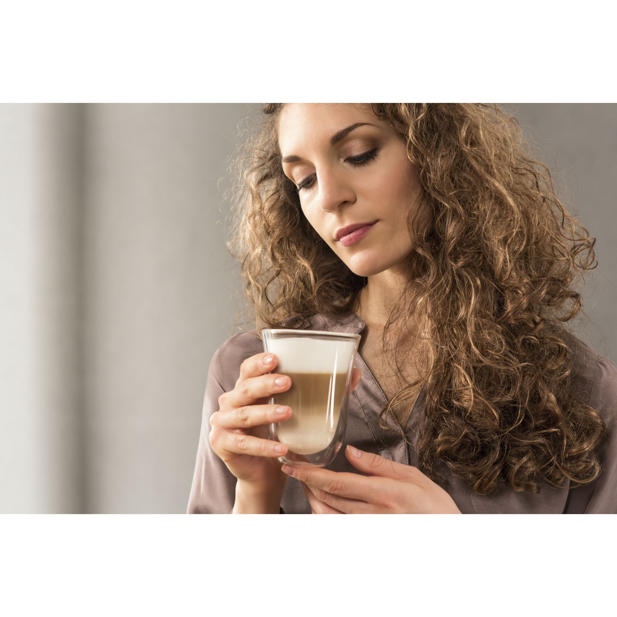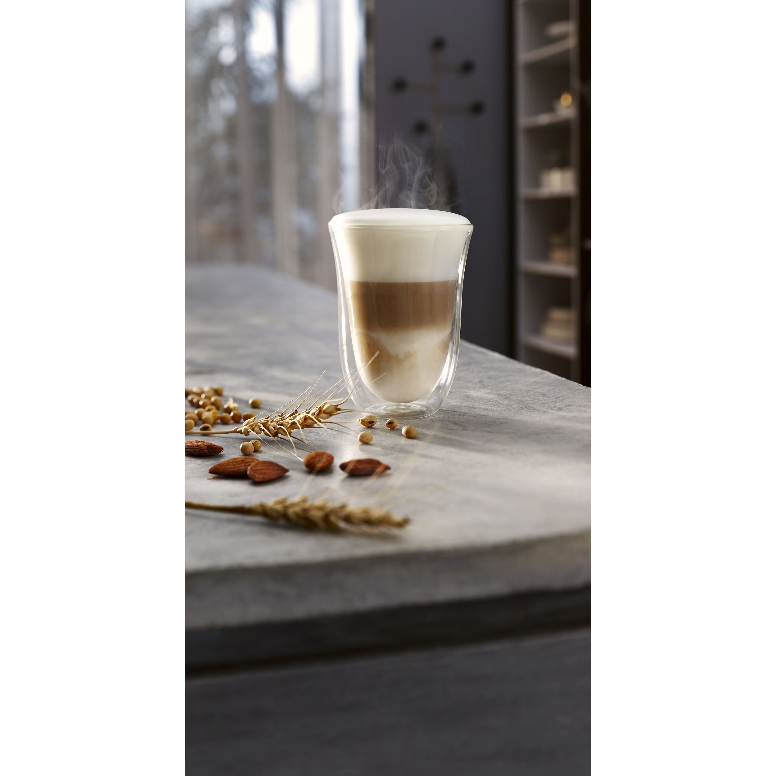 Paharele De’Longhi oferă modului de a servi cafeaua un plus de eleganță și rafinament. Paharele mențin temperatura cafelei constantă, datorită peretelui dublu din sticlă termorezistentă. Prin designul inovativ al acestora, paharele De’Longhi scot în evidență culoarea unui espresso veritabil, straturile perfecte ale unui cappuccino în stil italian și spuma de lapte densă și cremoasă a unui latte delicios.
