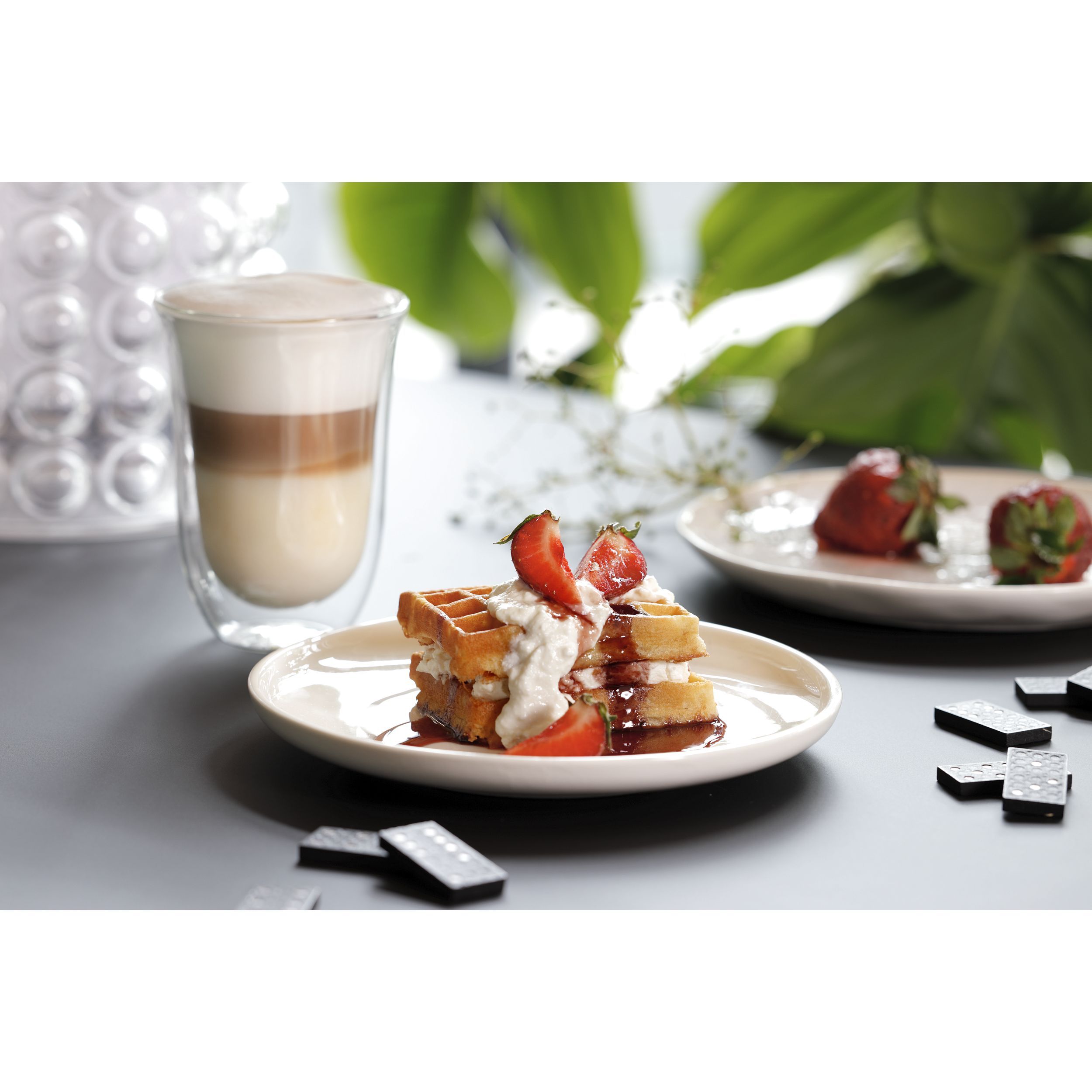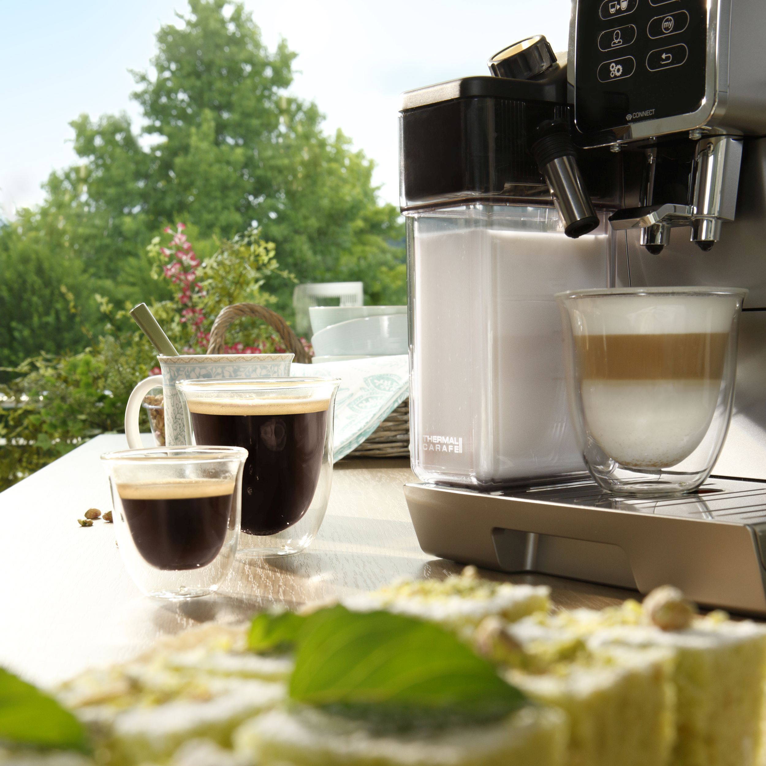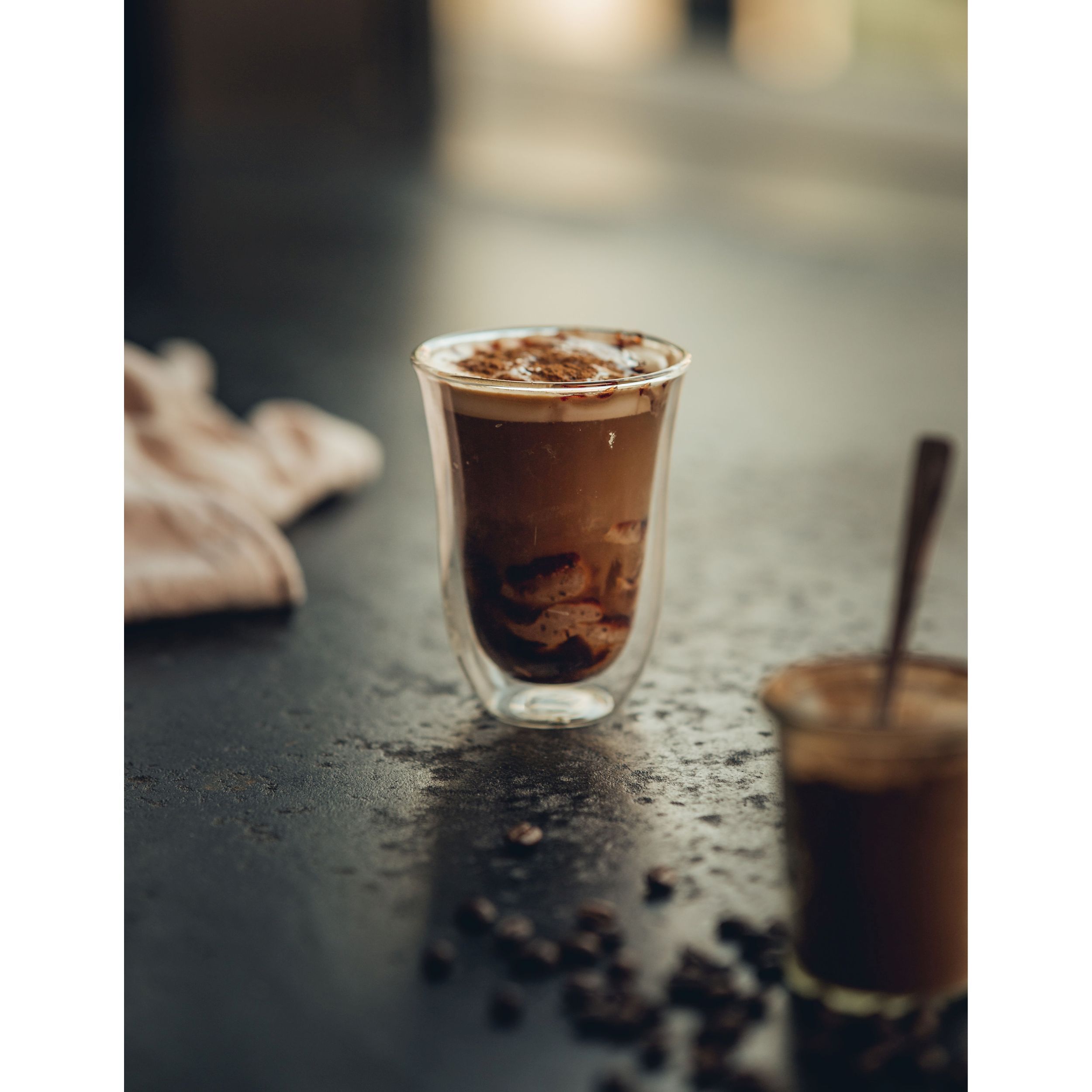 Paharele De’Longhi oferă modului de a servi cafeaua un plus de eleganță și rafinament. Paharele mențin temperatura cafelei constantă, datorită peretelui dublu din sticlă termorezistentă. Prin designul inovativ al acestora, paharele De’Longhi scot în evidență culoarea unui espresso veritabil, straturile perfecte ale unui cappuccino în stil italian și spuma de lapte densă și cremoasă a unui latte delicios.