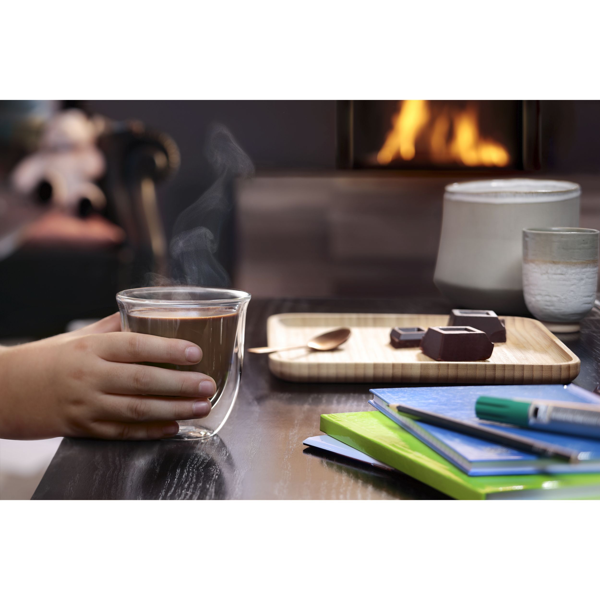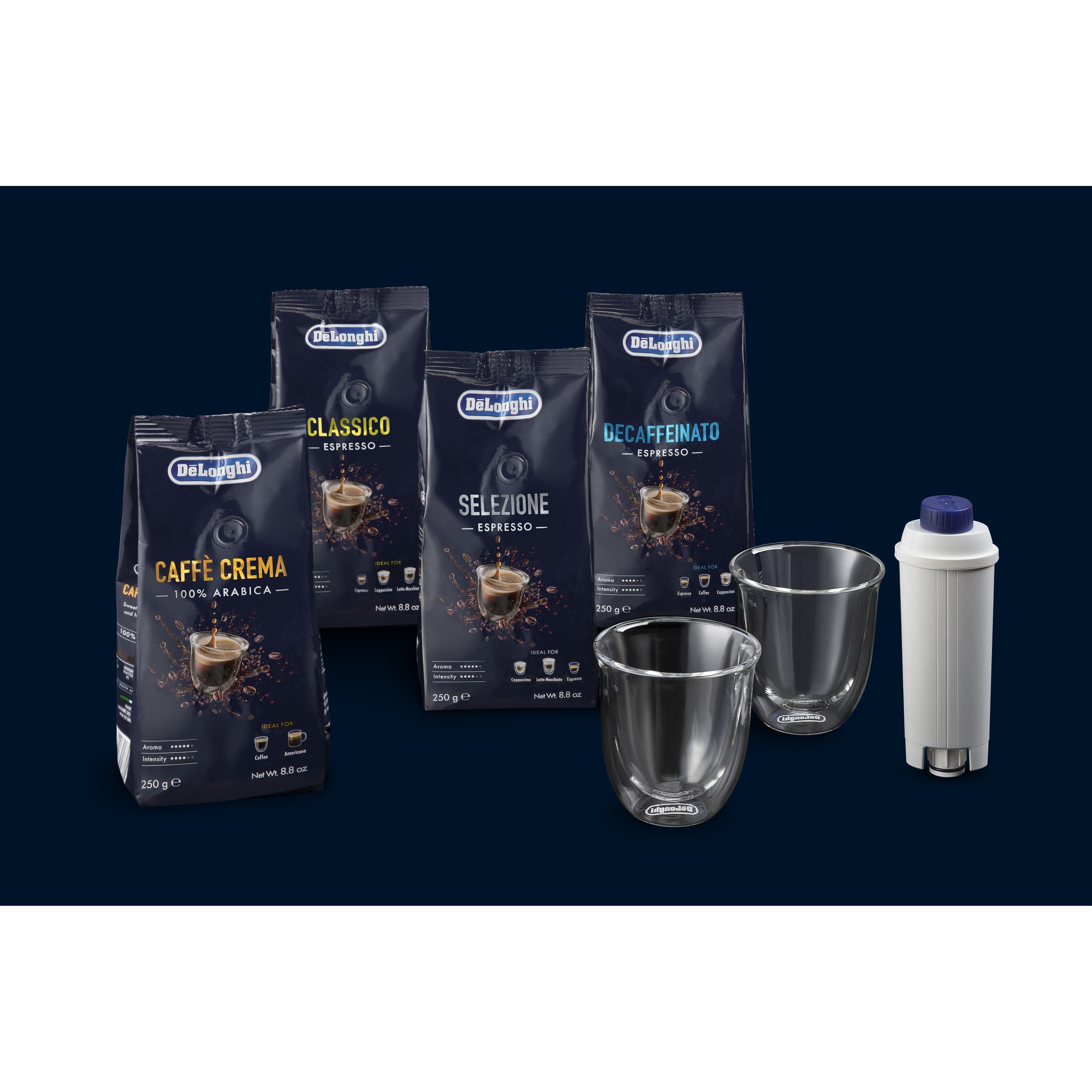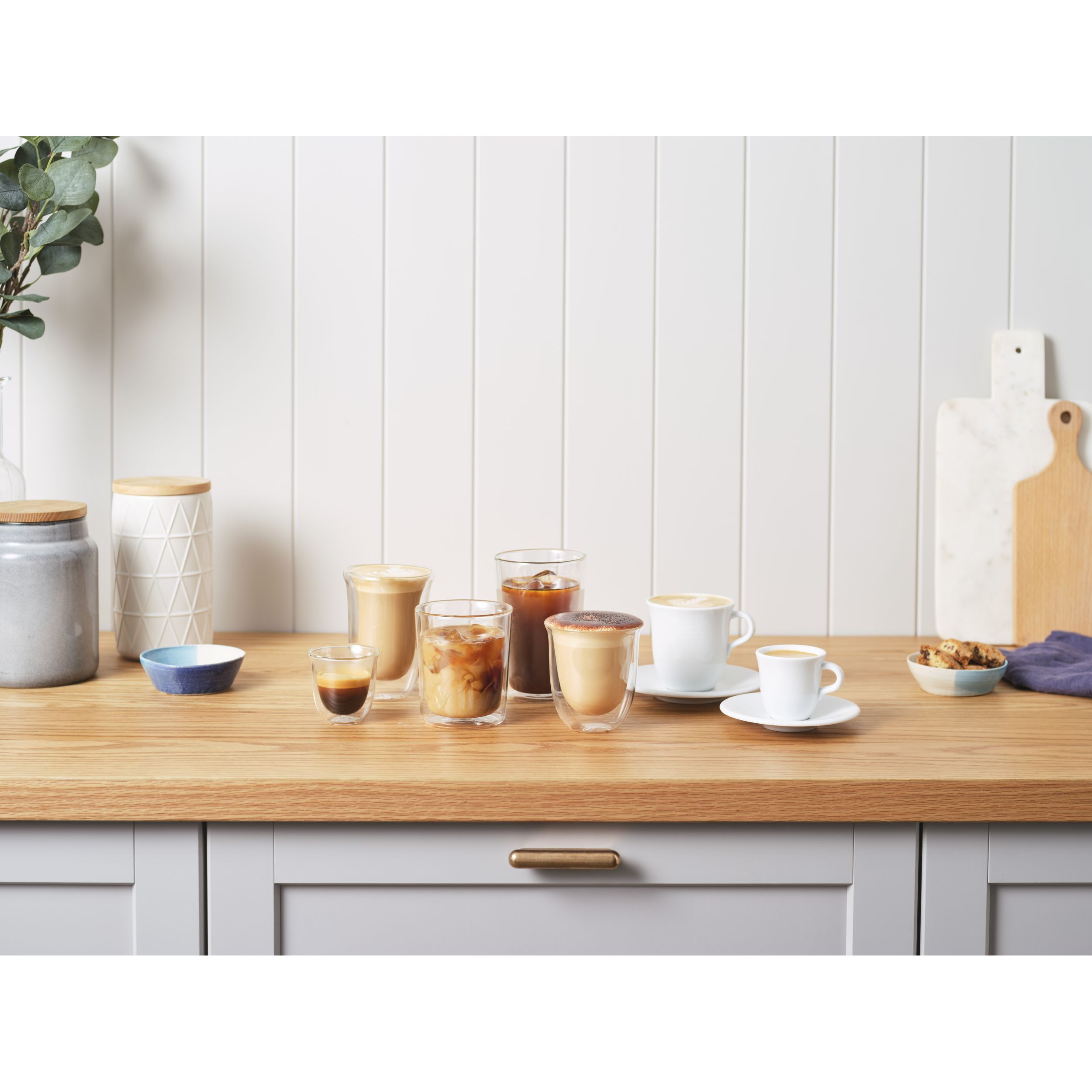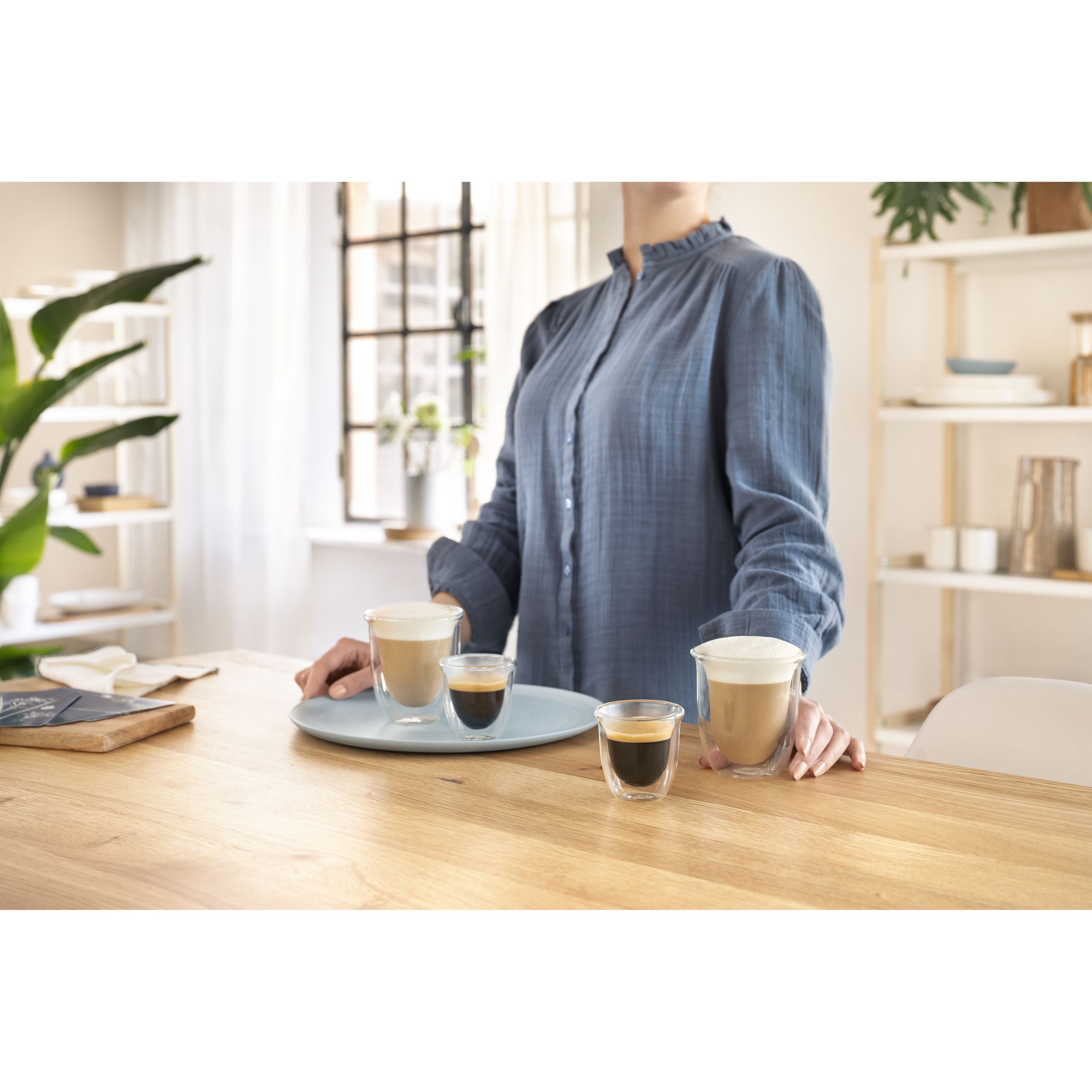 Paharele De’Longhi oferă modului de a servi cafeaua un plus de eleganță și rafinament. Paharele mențin temperatura cafelei constantă, datorită peretelui dublu din sticlă termorezistentă. Prin designul inovativ al acestora, paharele De’Longhi scot în evidență straturile perfecte ale unui cappuccino veritabil, în stil italian. Setul De’Longhi este un cadou perfect pentru iubitorii de cafea cu lapte. Setul conține două pahare De’Longhi pentru cappuccino, fiecare cu capacitatea de 270ml. Paharele pot fi introduse în mașina de spălat vase, pentru un proces de curățare complet.
