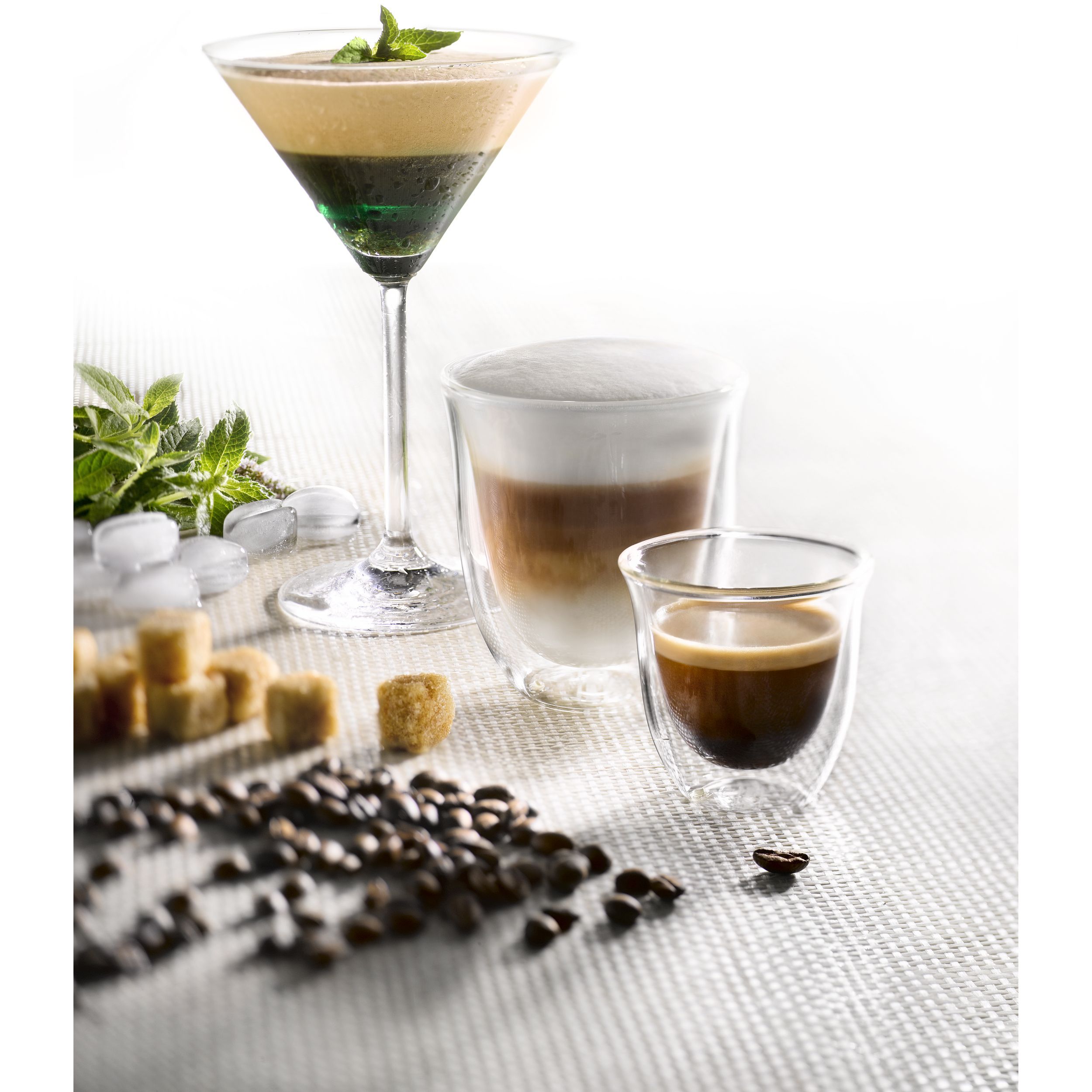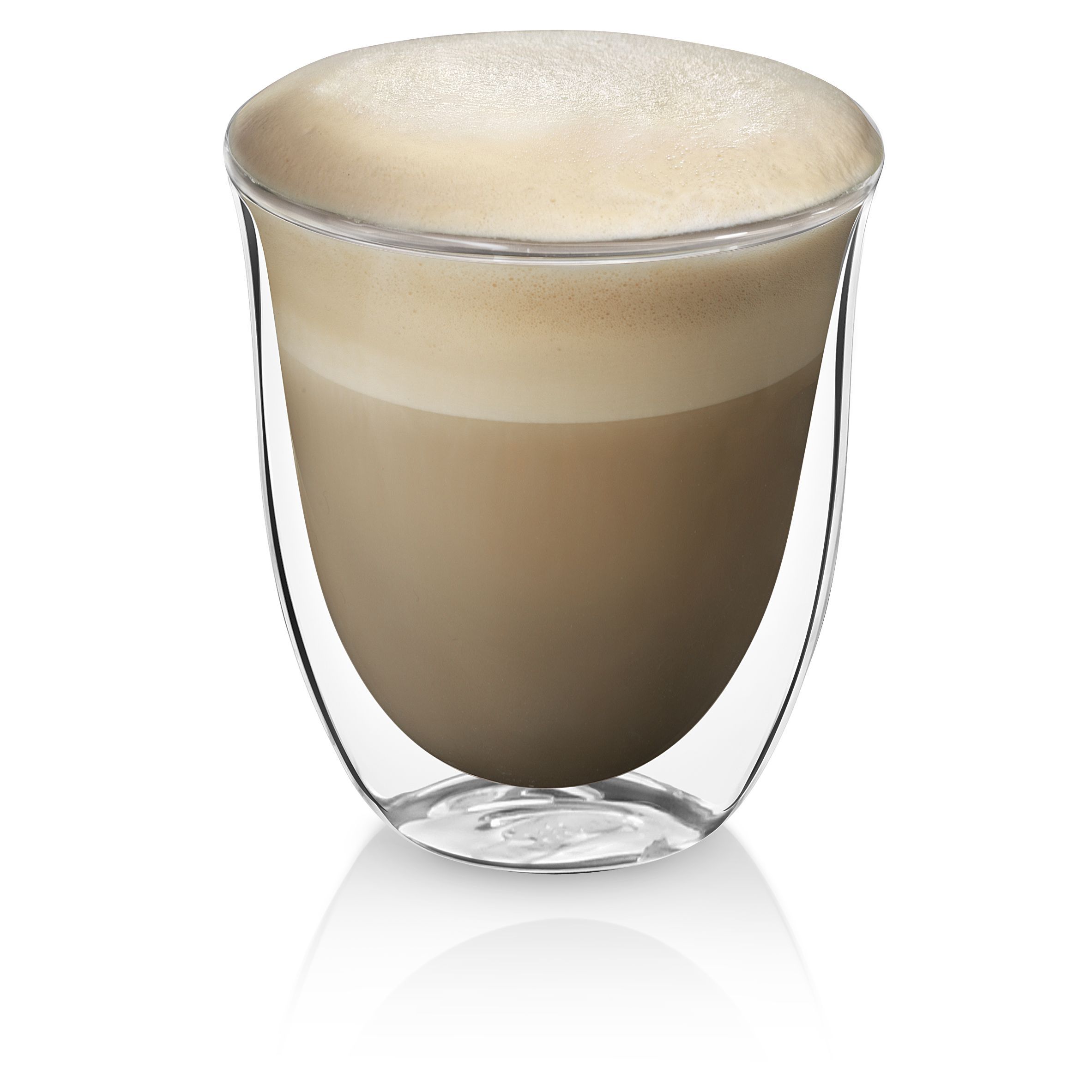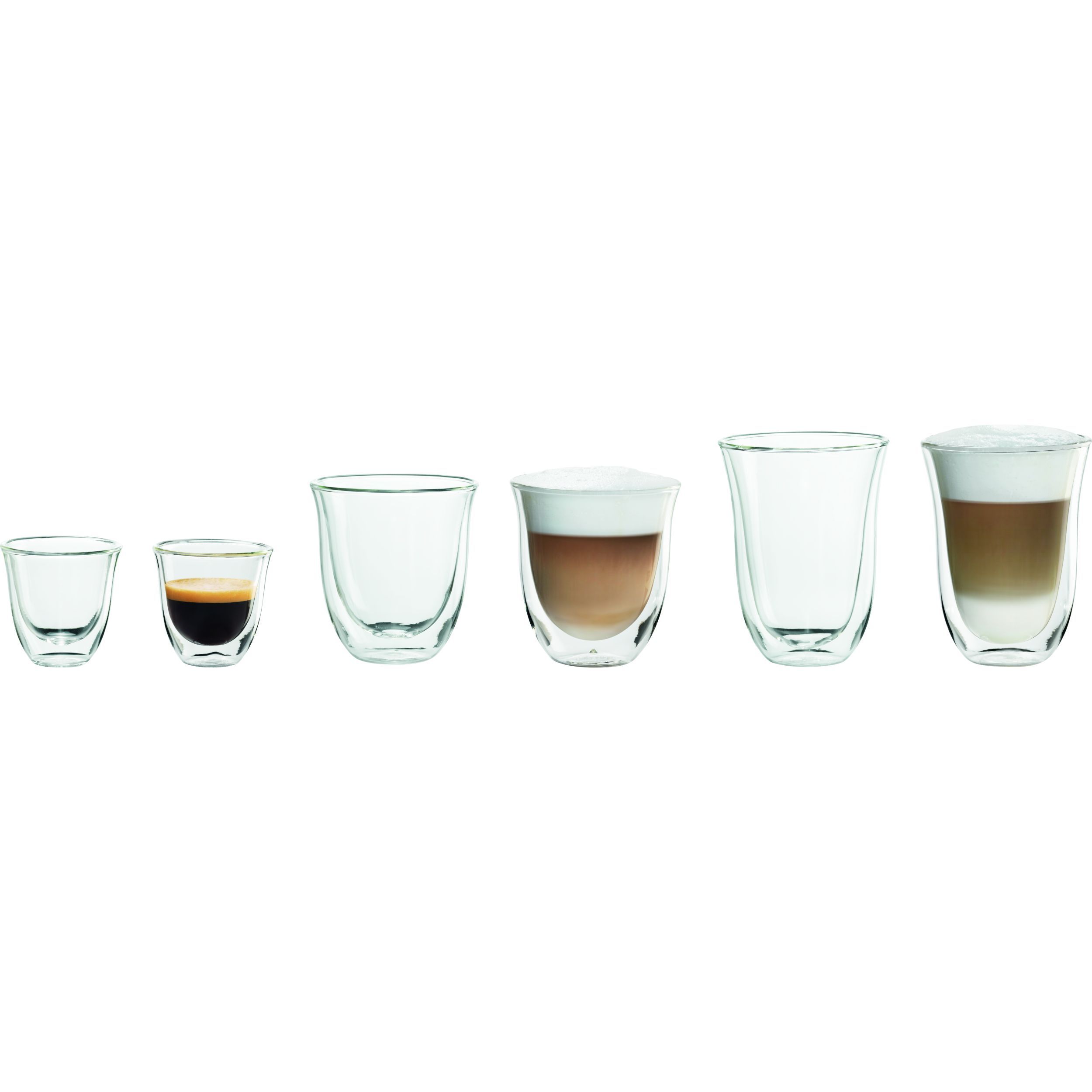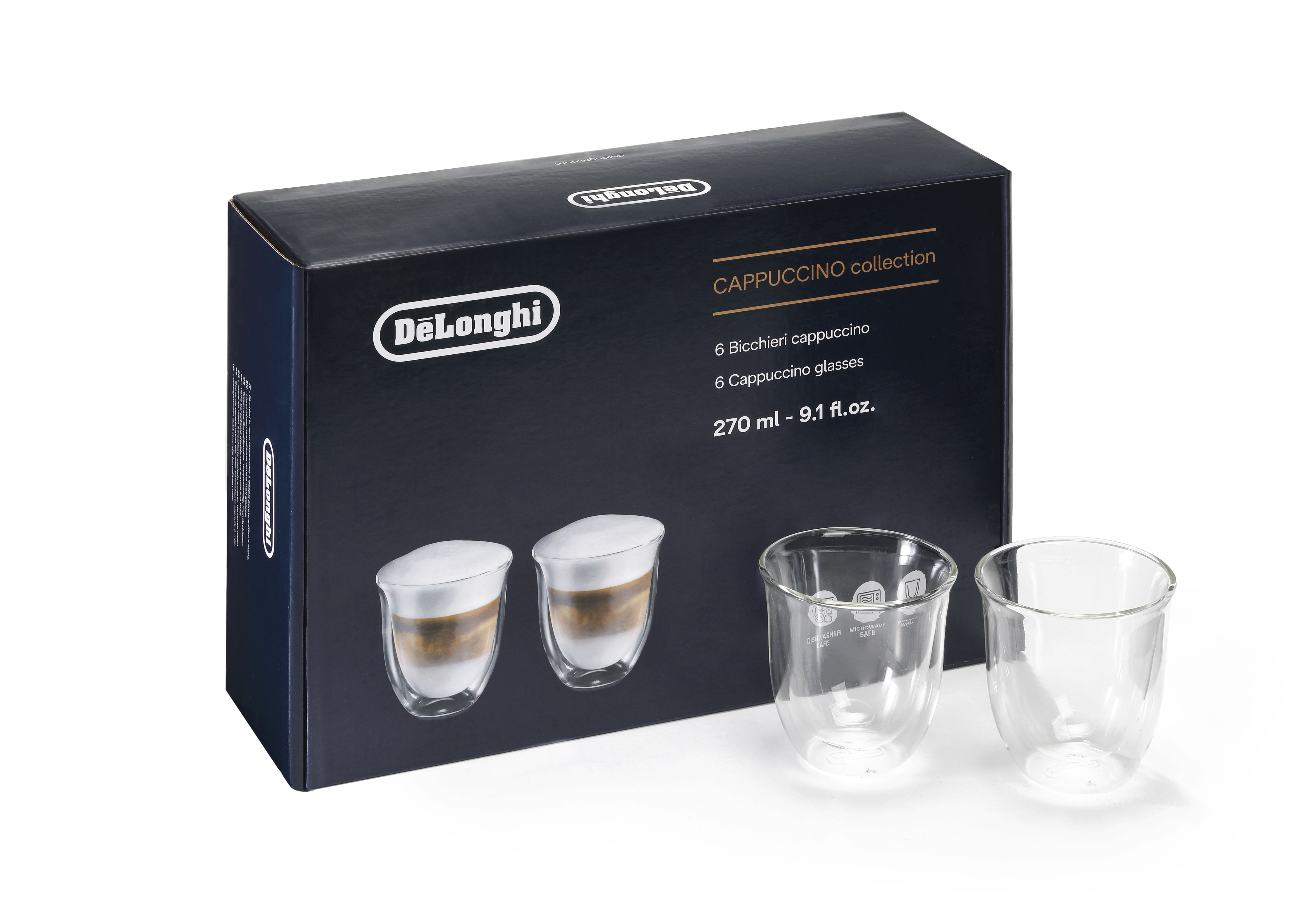 Paharele De’Longhi oferă modului de a servi cafeaua un plus de eleganță și rafinament. Paharele mențin temperatura cafelei constantă, datorită peretelui dublu din sticlă termorezistentă. Prin designul inovativ al acestora, paharele De’Longhi scot în evidență straturile perfecte ale unui cappuccino veritabil, în stil italian. Setul De’Longhi este un cadou perfect pentru iubitorii de cafea cu lapte. Setul conține două pahare De’Longhi pentru cappuccino, fiecare cu capacitatea de 270ml. Paharele pot fi introduse în mașina de spălat vase, pentru un proces de curățare complet.