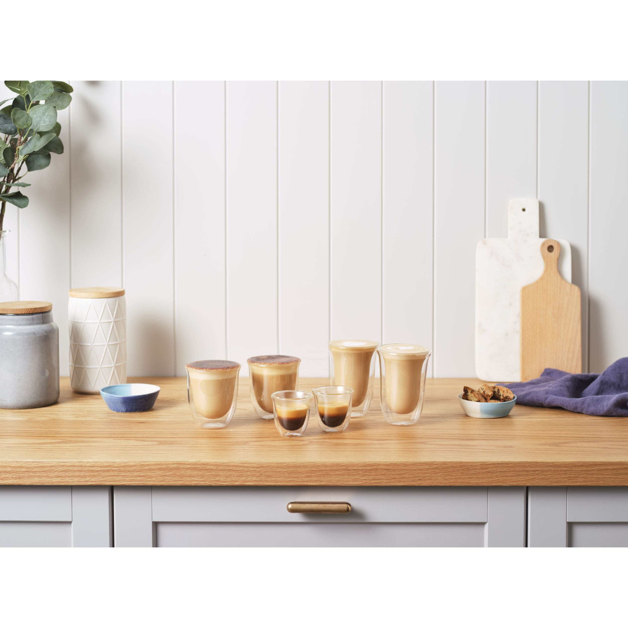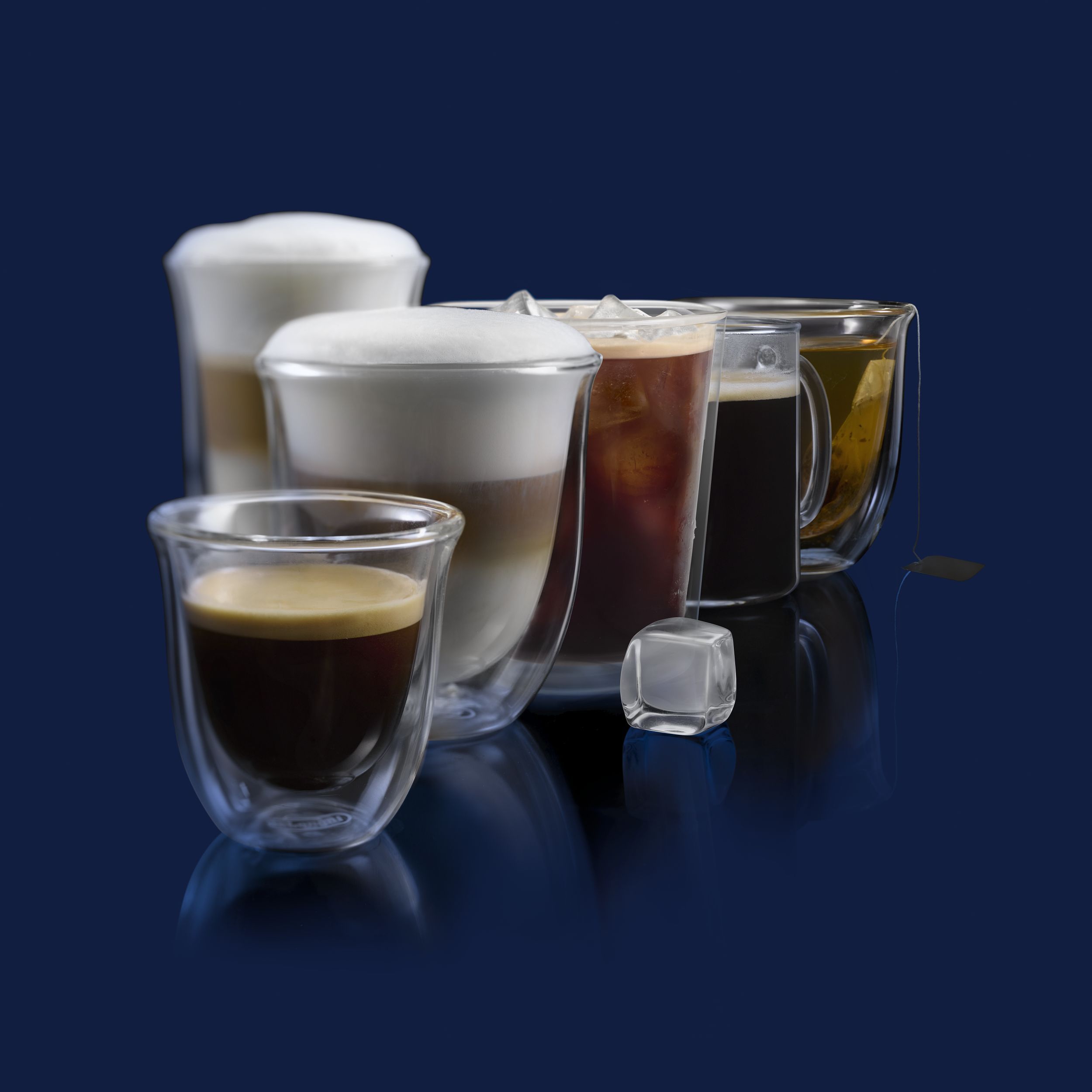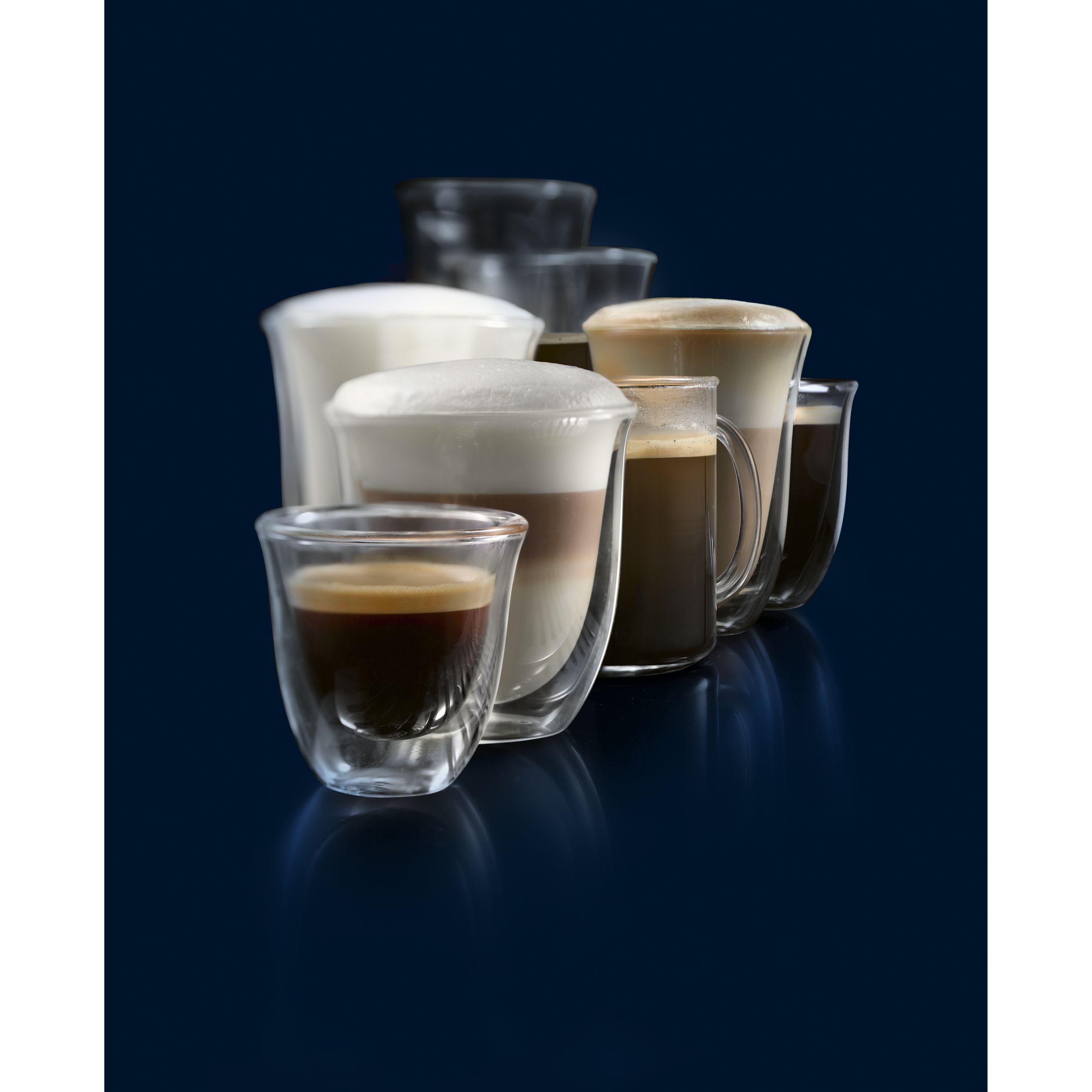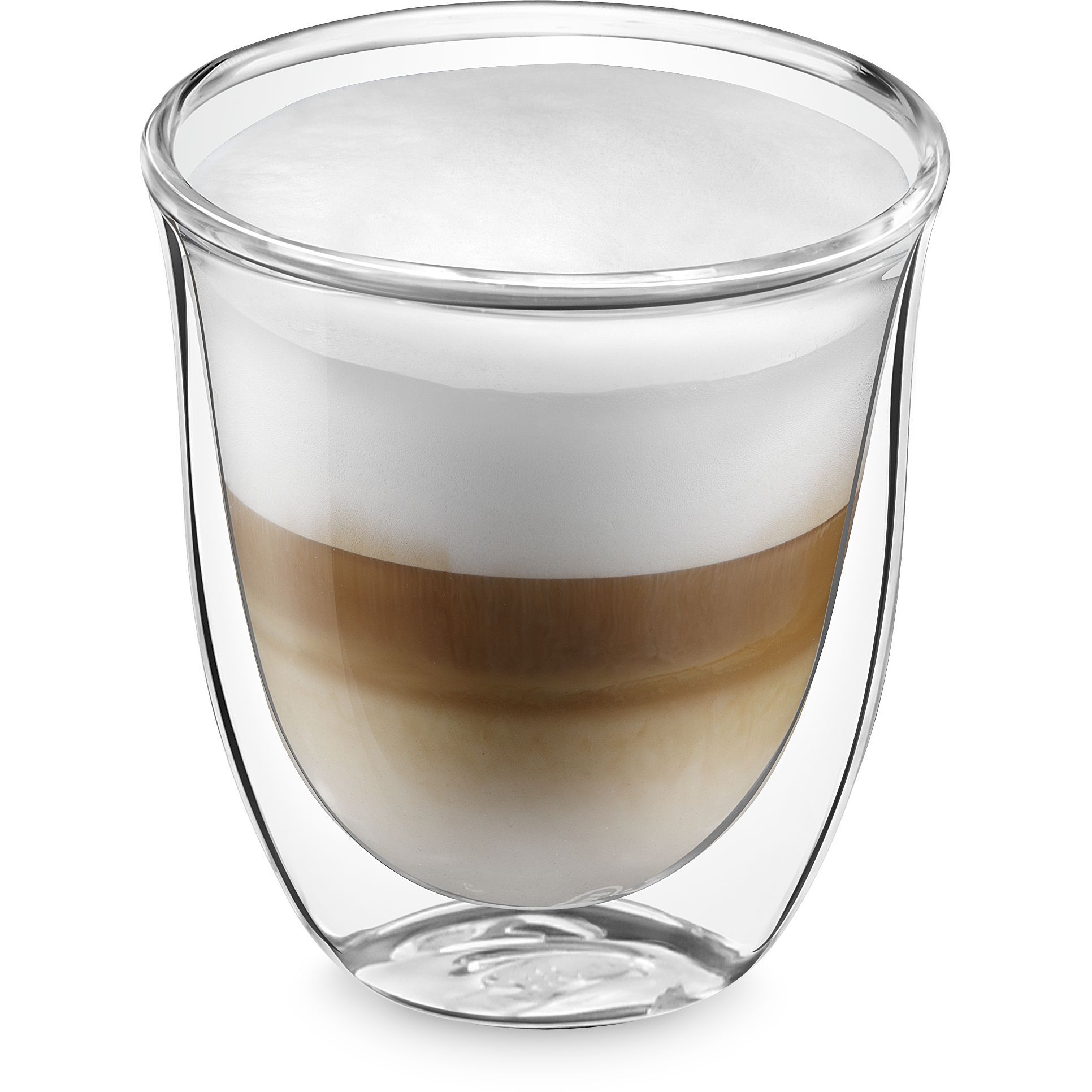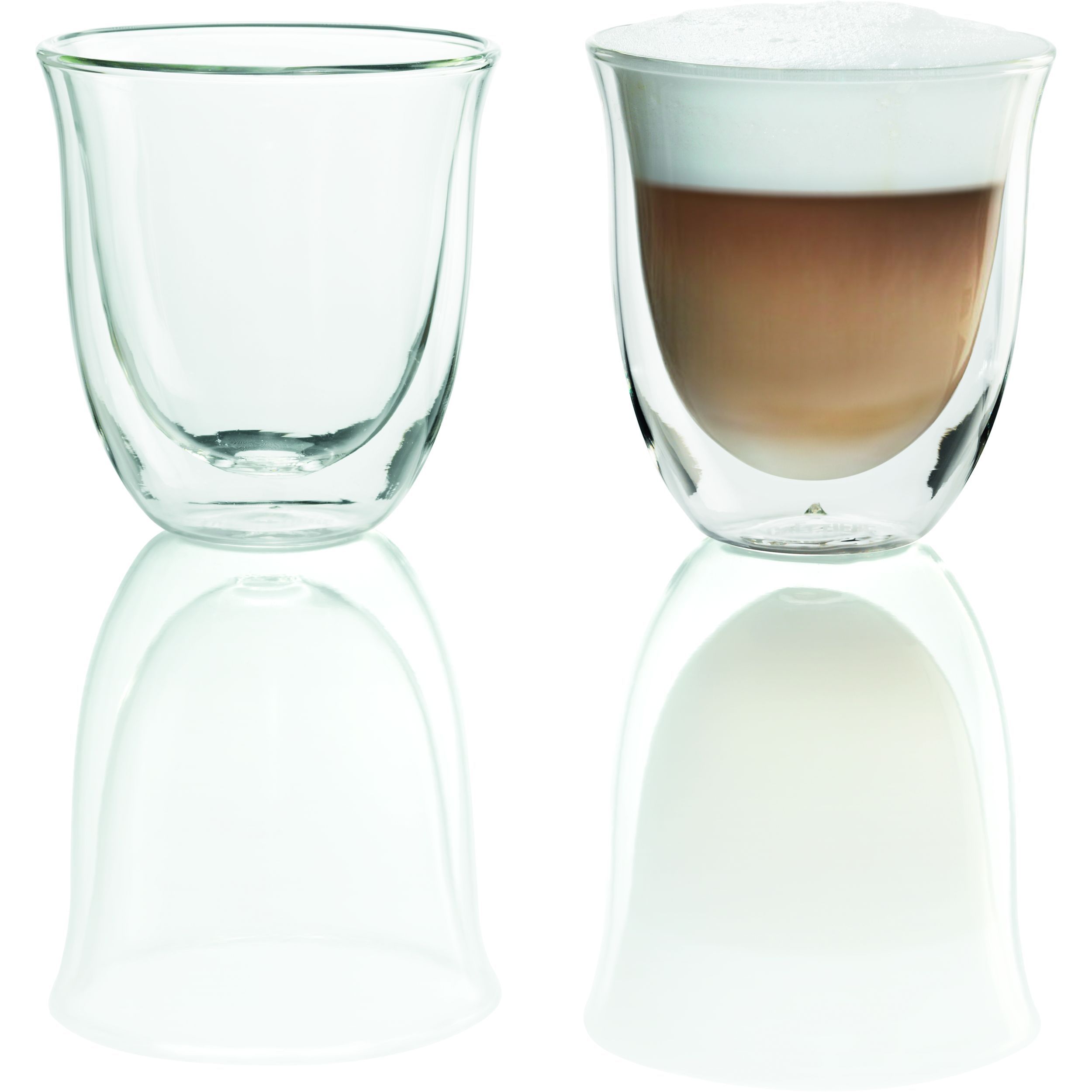 Paharele De’Longhi oferă modului de a servi cafeaua un plus de eleganță și rafinament. Paharele mențin temperatura cafelei constantă, datorită peretelui dublu din sticlă termorezistentă. Prin designul inovativ al acestora, paharele De’Longhi scot în evidență straturile perfecte ale unui cappuccino veritabil, în stil italian. Setul De’Longhi este un cadou perfect pentru iubitorii de cafea cu lapte. Setul conține două pahare De’Longhi pentru cappuccino, fiecare cu capacitatea de 270ml. Paharele pot fi introduse în mașina de spălat vase, pentru un proces de curățare complet.