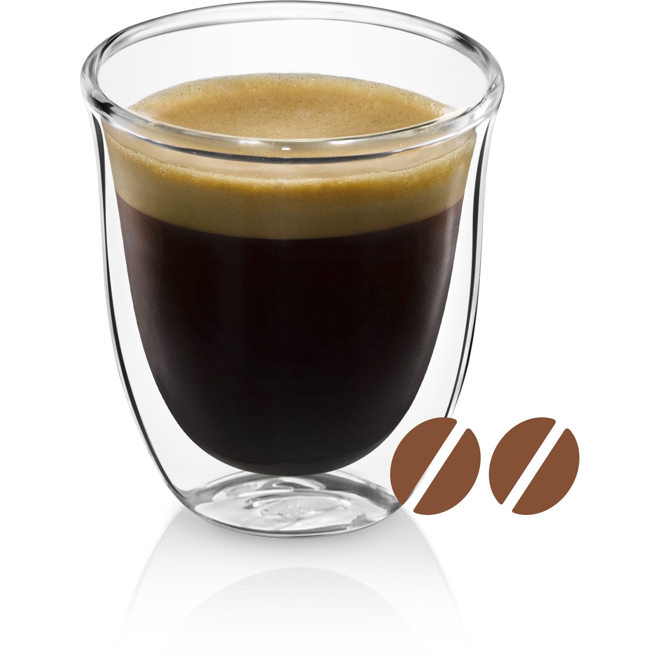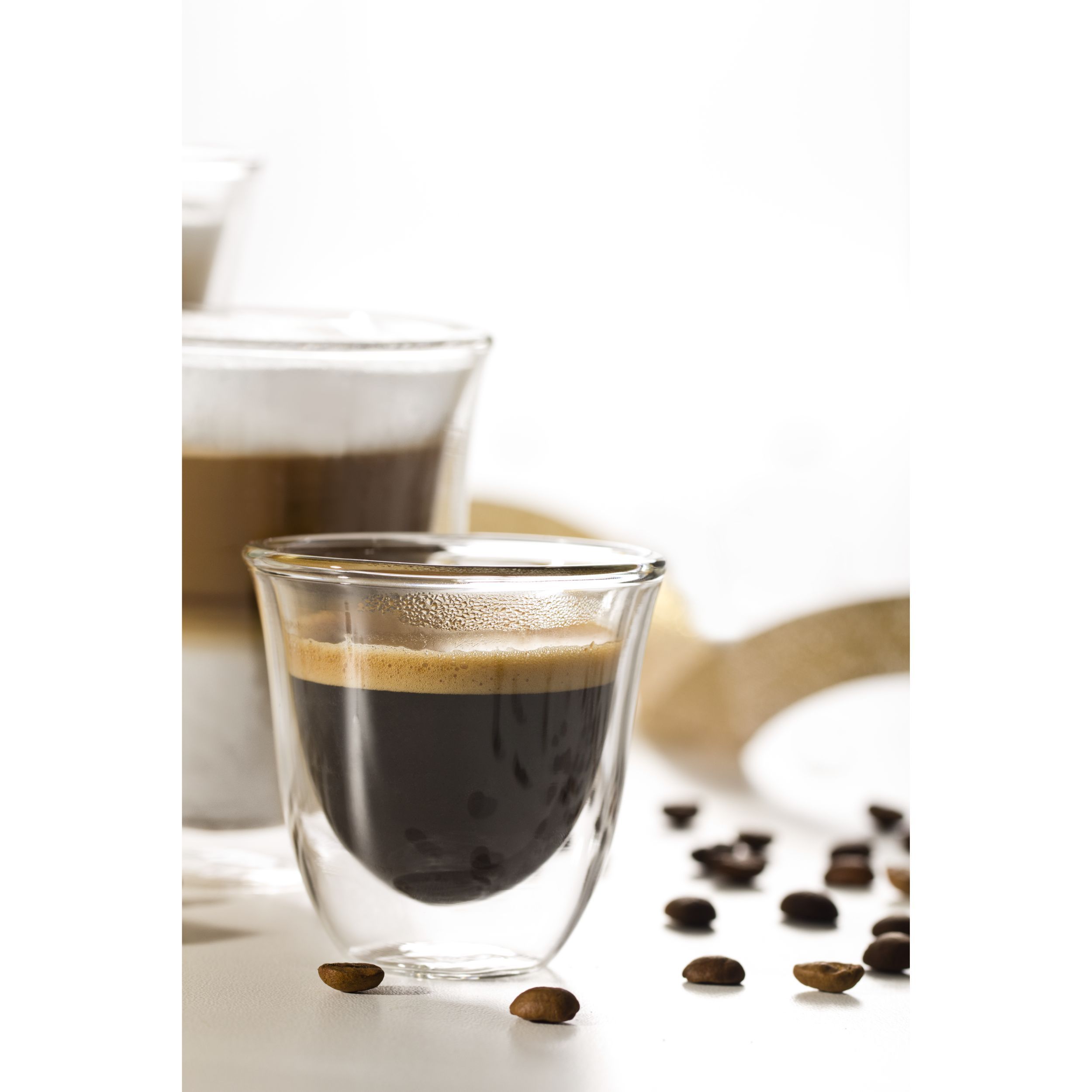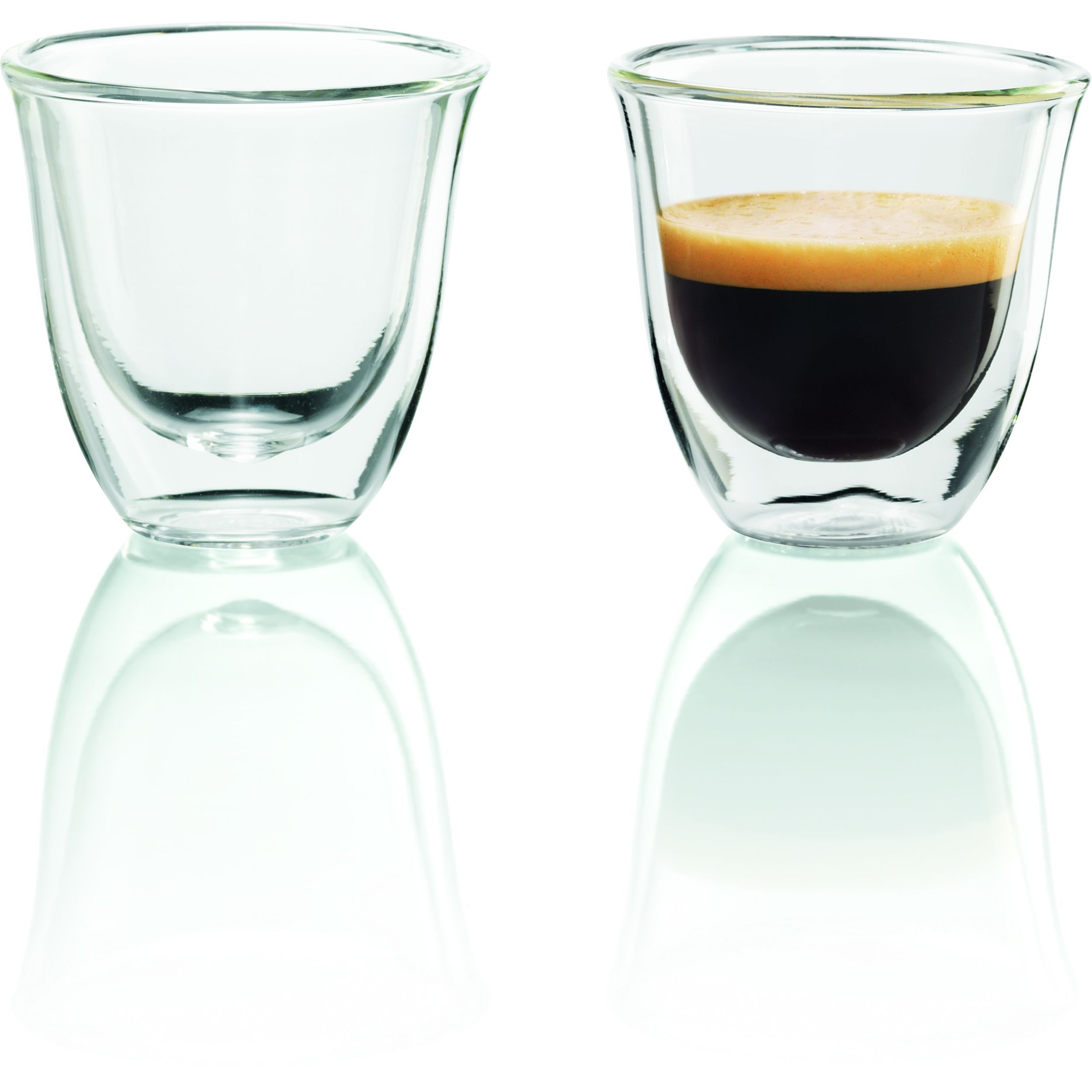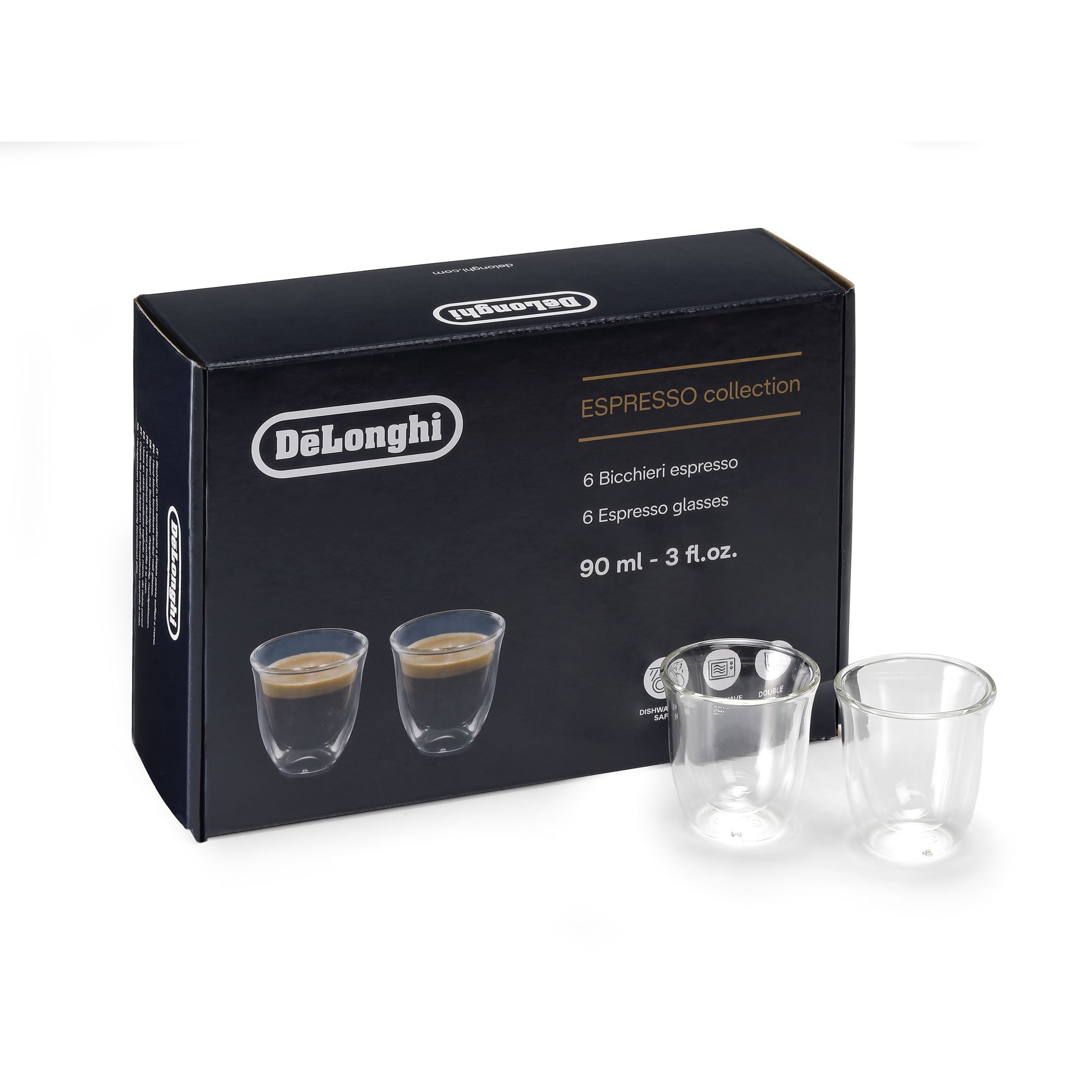 Paharele De'Longhi oferă modului de a servi cafeaua un plus de eleganță și rafinament. Paharele mențin temperatura cafelei constantă, datorită peretelui dublu din sticlă termorezistentă. Prin designul inovativ al acestora, paharele De’Longhi scot în evidență culoarea unui espresso perfect. Setul conține șase pahare De’Longhi pentru espresso, fiecare cu capacitatea de 90ml. Paharele pot fi introduse în mașina de spalat vase, pentru un proces de curățare complet.