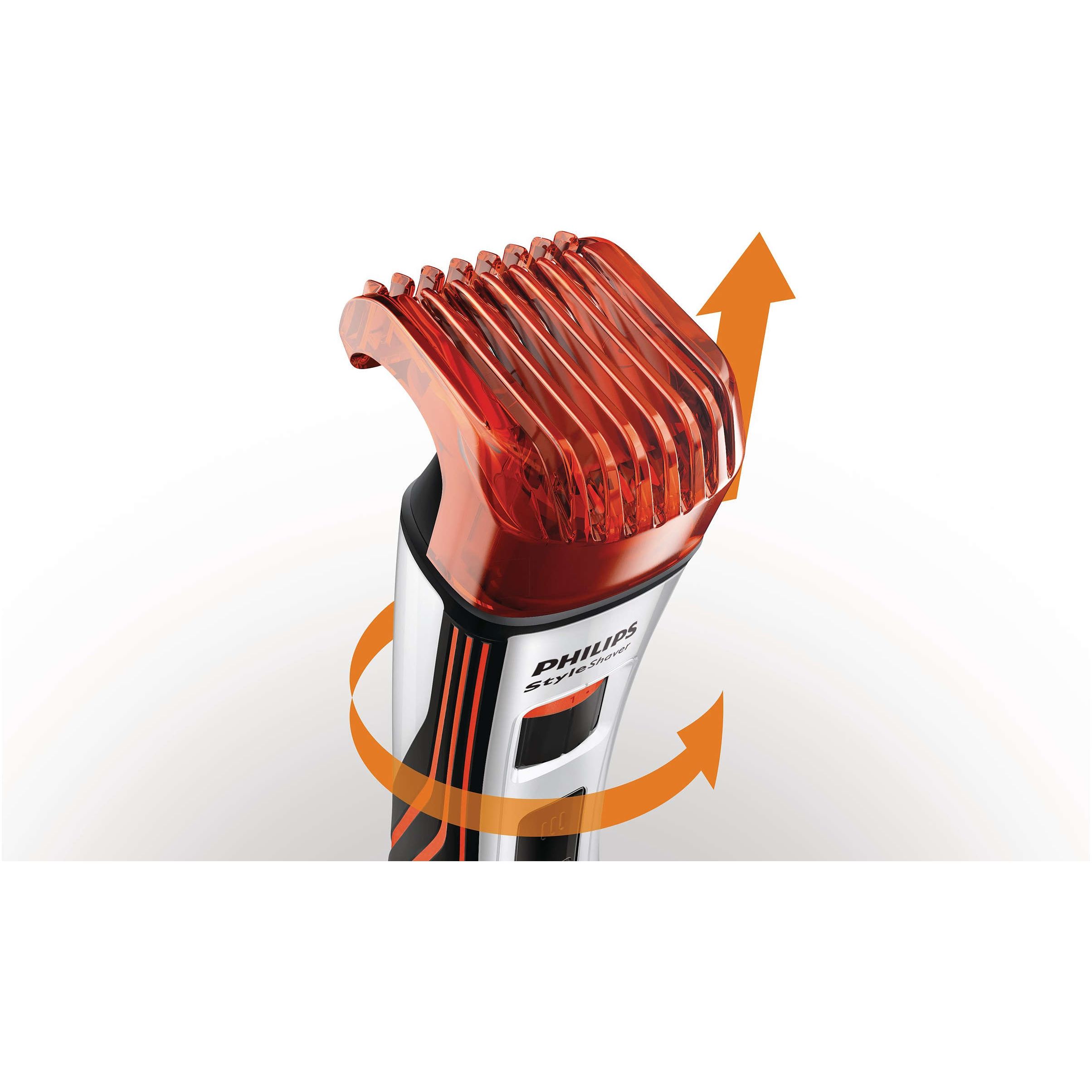 Maşină de tuns barba/aspect nebărbierit: 12 setări lungime 0,5-10 mm. Cu dispozitivul de tuns integral metalic (32 mm) şi cu pieptenele cu 12 reglaje de lungime vă este uşor să obţineţi exact lungimea dorită a bărbii. Fixaţi setarea perfectă a lungimii cu inelul de reglare. Dispozitivul de tuns metalic durabil, cu margini rotunjite care protejează pielea, garantează o tundere precisă şi egală.