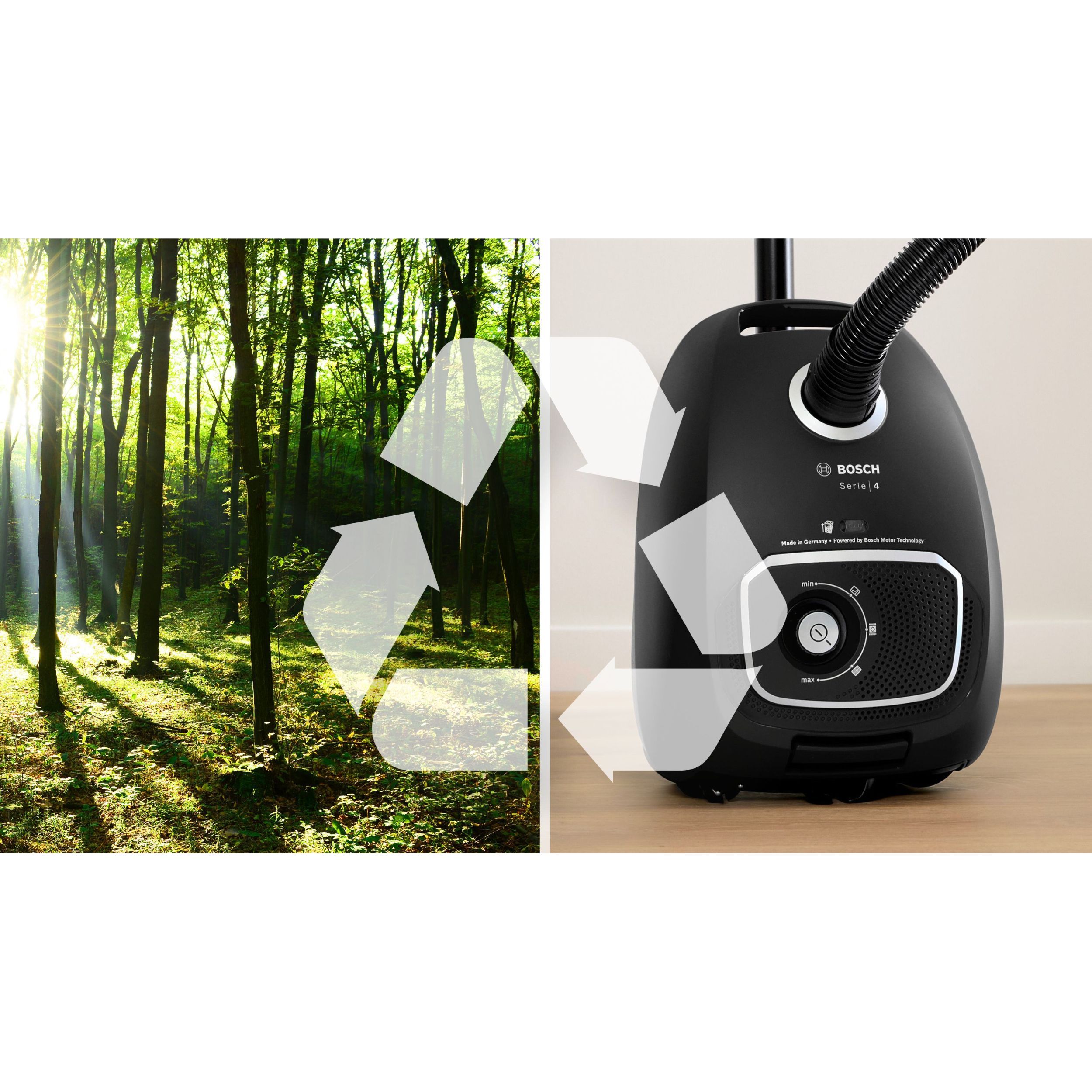 BOSCH este dedicat durabilității, motiv pentru care dispozitivele Bosch sunt dezvoltate pentru a conserva mediul și pentru a economisi resurse. Prin urmare, acest aspirator este fabricat din plastic reciclat în proporție de 32%, iar ambalajul este realizat din hârtie reciclată 95% cu material compostabil și reciclabil în interior. Și, datorită motorului Bosch de lungă durată și de înaltă calitate, fabricat în Germania, vei folosi aspiratorul tău o lungă perioadă de timp.