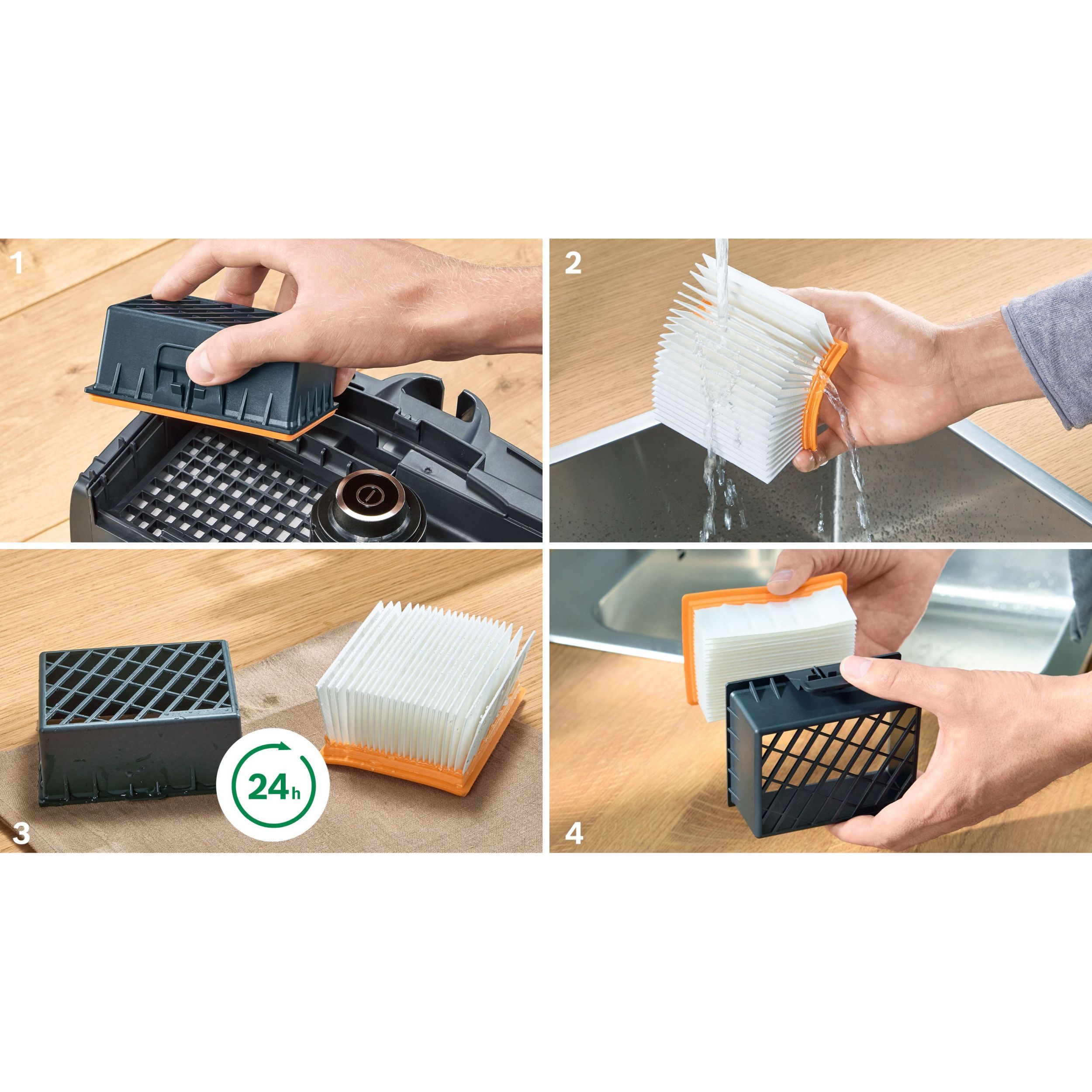 Filtru igienic HEPA lavabil: aerul evacuat este mai curat decât aerul din locuință. Este potrivit pentru persoanele care suferă de alergii.