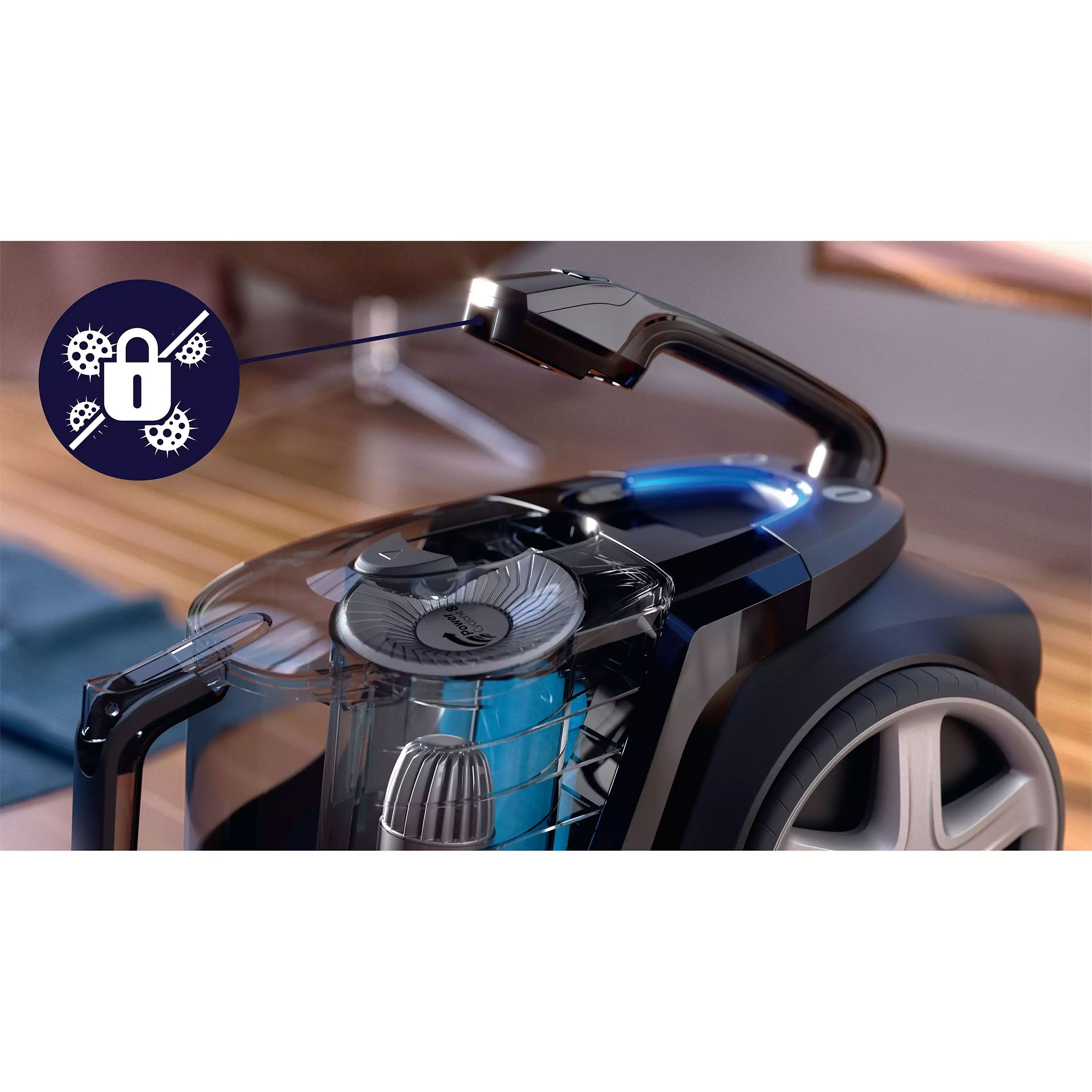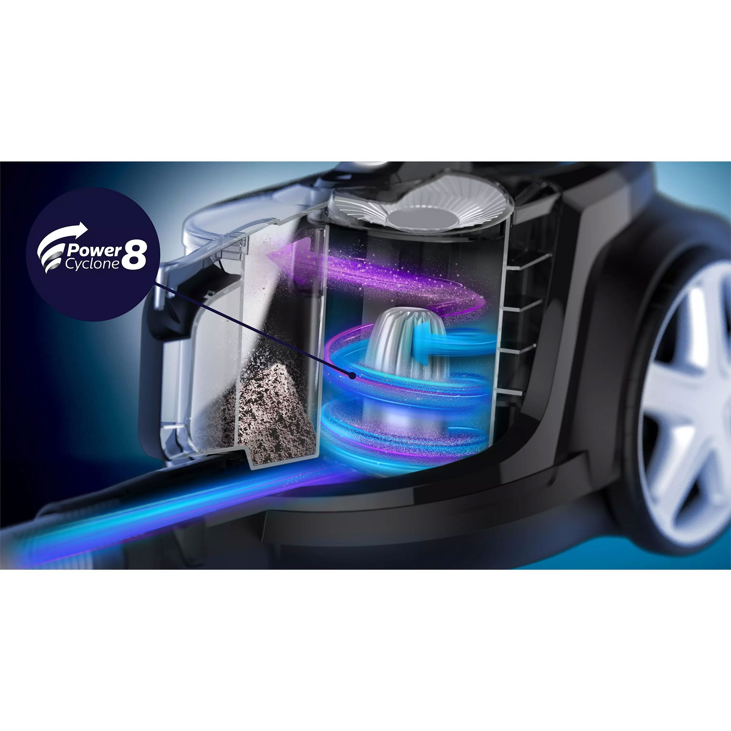 Tehnologia PowerCyclone 8 are o acţiune puternică, turbionară, pentru a maximiza fluxul de aer şi a permite cea mai mare putere de aspirare. Fluxul de aer extrem de accelerat din camera cilindrică separă eficient praful de aer la > 185 km/h, asigurând putere de aspirare mai mare pentru mai mult timp, pentru rezultate de curăţare imaculate.