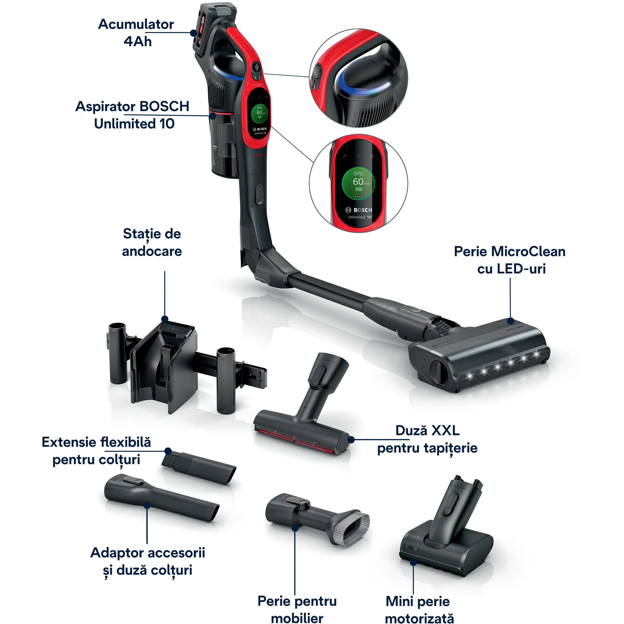 - Peria MicroClean: Experimentează cel mai bun sistem BOSCH de aspirare a prafului de peste 99,9%*, cu aceasta perie eliminându-se chiar și particulele microscopice;
