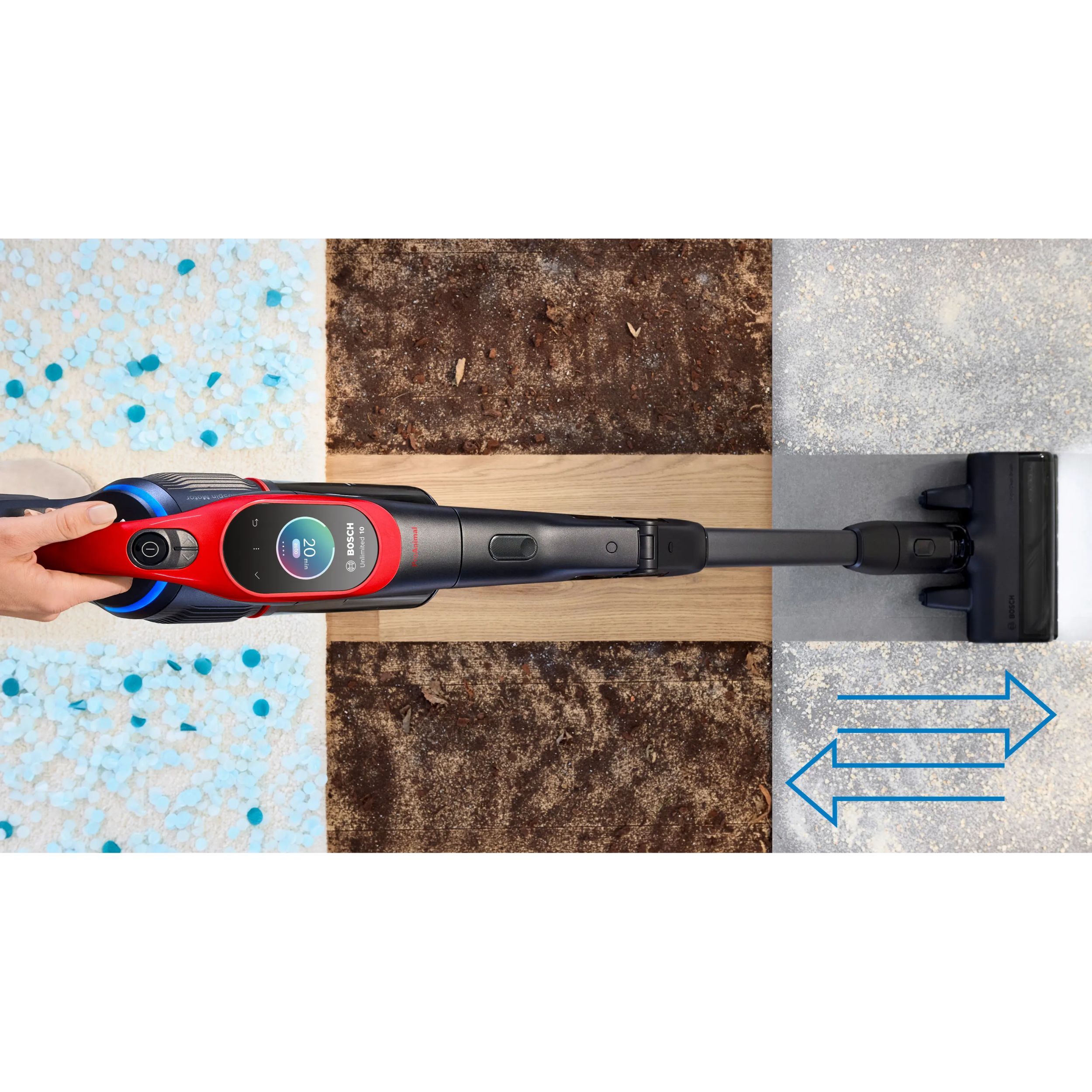 Peria MicroClean îndepărtează orice tip de praf și murdărie de pe toate podelele. Fie că este vorba de murdărie grosieră sau praf fin rămas în perii covoarelor, tesătura tapițeriei sau în crăpăturile podelelor dure. Chiar și particulele invizibile sunt aspirate de pe orice tip de suprafață, cum ar fi covor, parchet sau gresie. Unlimited 10 aspiră eficient, atât înainte cât și înapoi.