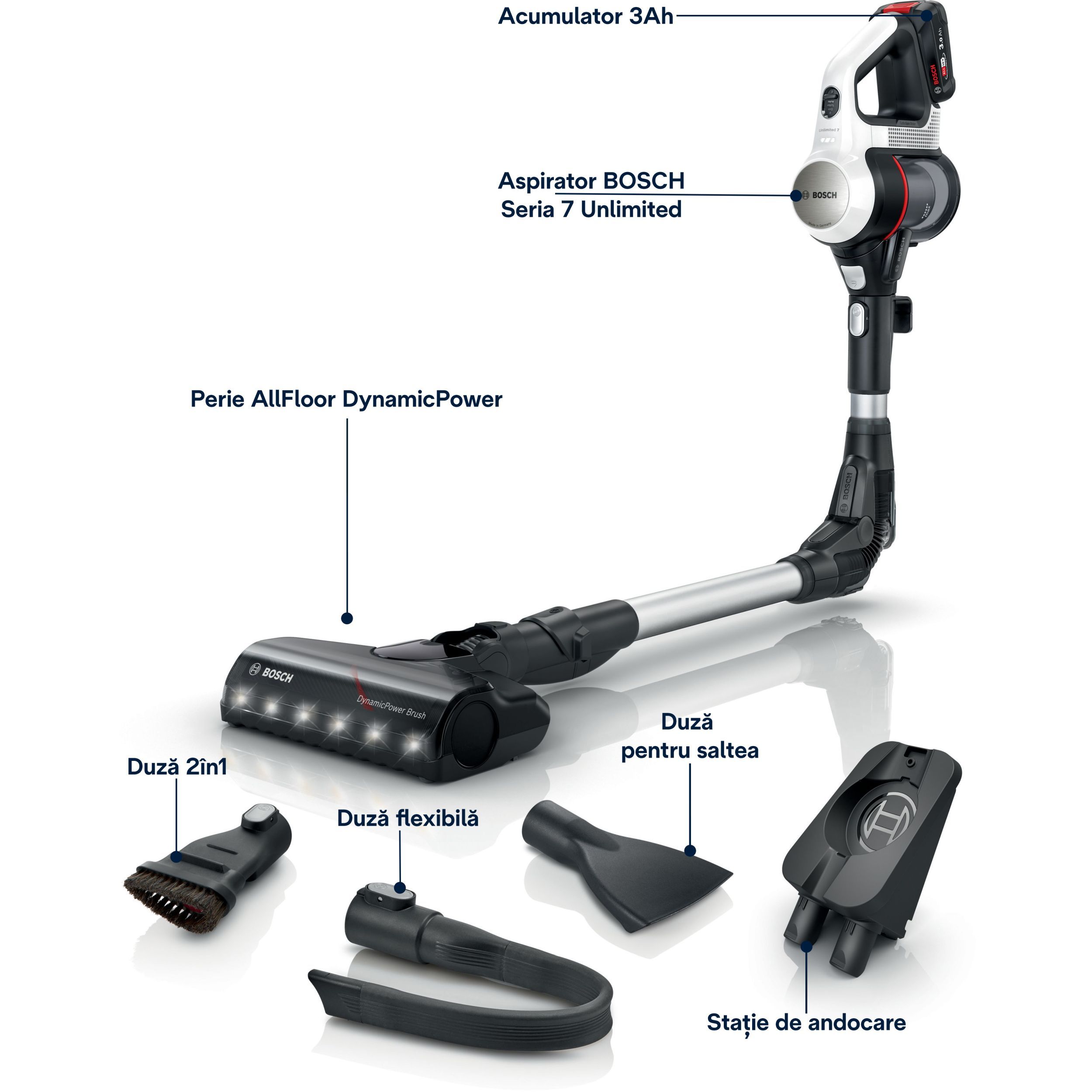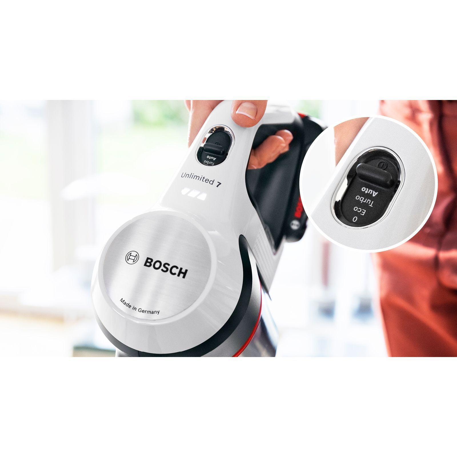 Acum este posibil: aspiratorul vertical Unlimited 7 oferă aceeași performanță de aspirare precum cea obținută de un aspirator cu cablu. Datorită acumulatorului puternic Bosch, a motorului ce funcționează cu până la 66,000 rpm și a periei motorizate cu LED-uri, acest aspirator multifuncțional este la fel de puternic precum cel cu cablu² și asigură rezultate excelente de îndepărtare a murdăriei și o curățare versatilă.