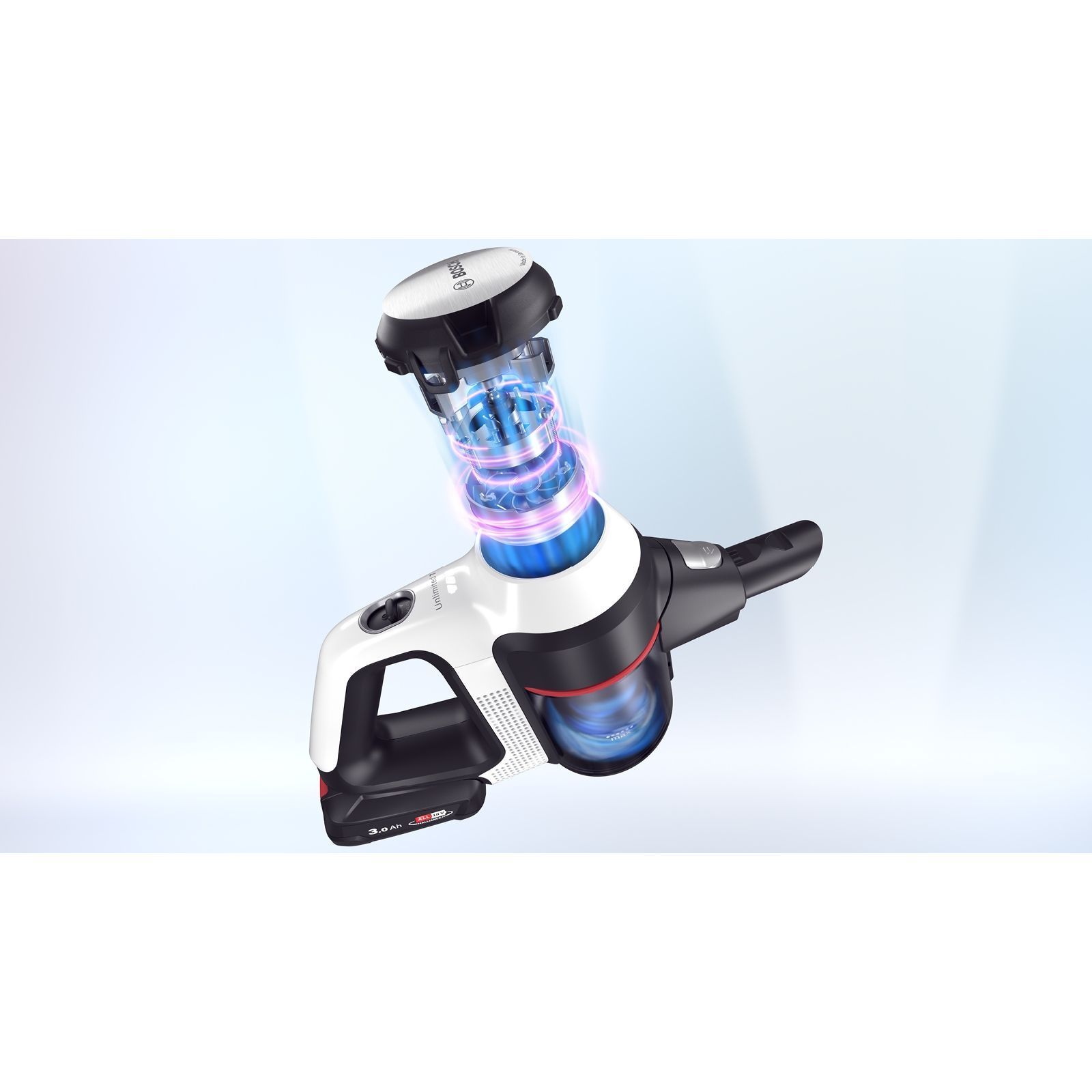 Datorită sistemului de detectare automată a bateriei, patentat de Bosch, aspiratorul recunoaște tipul de baterie utilizat și optimizează fie performanța pentru a îndepărta murdăria dificilă, fie durata de funcționare pentru a acoperi suprafete mari.