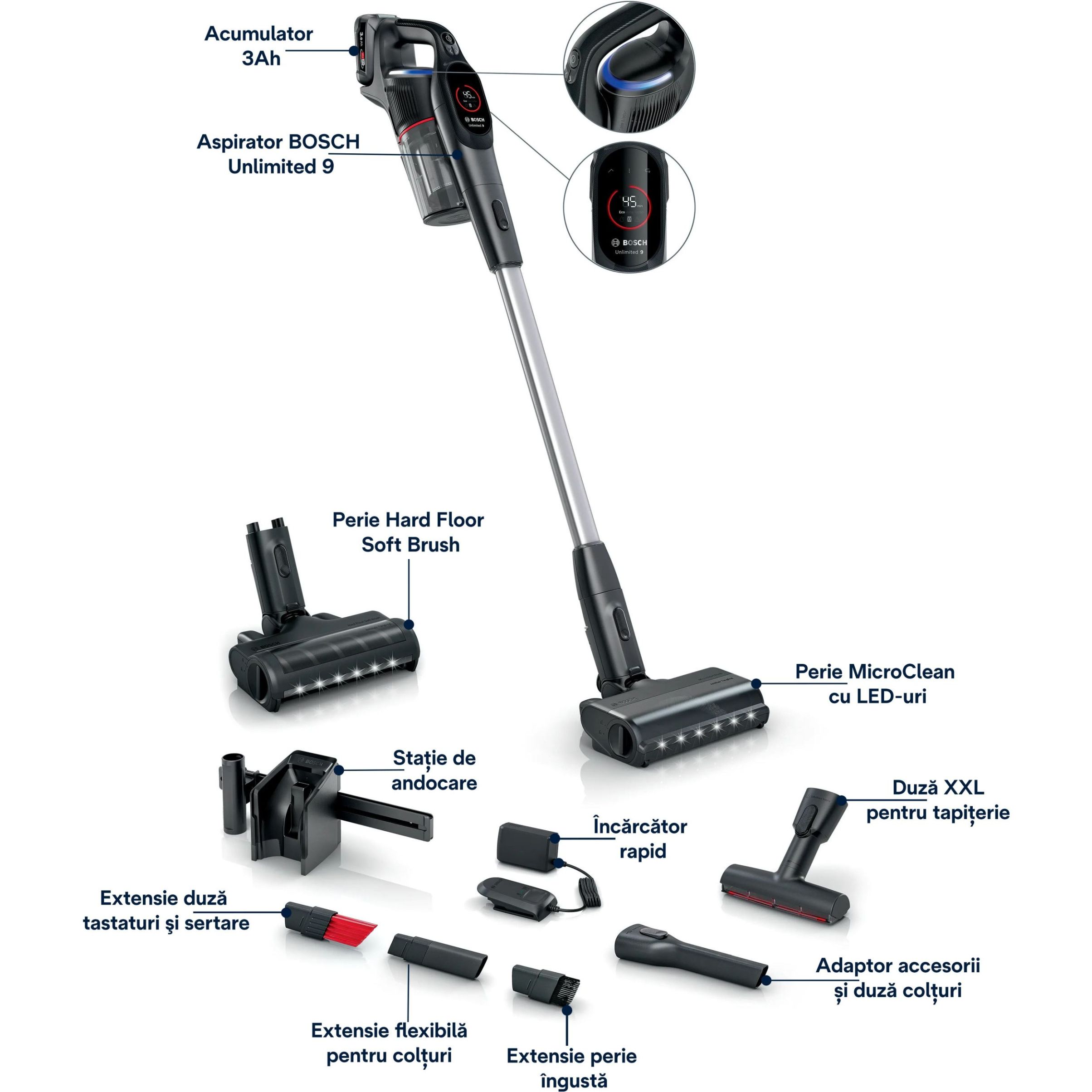 - Depozitare facilă: stație de andocare pentru depozitarea ușoară a aspiratorului și a accesoriilor.