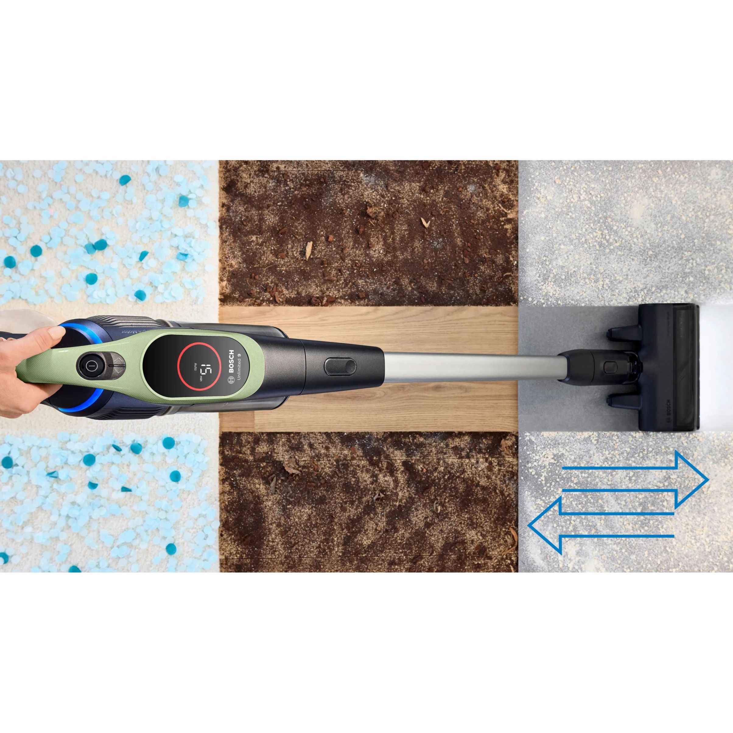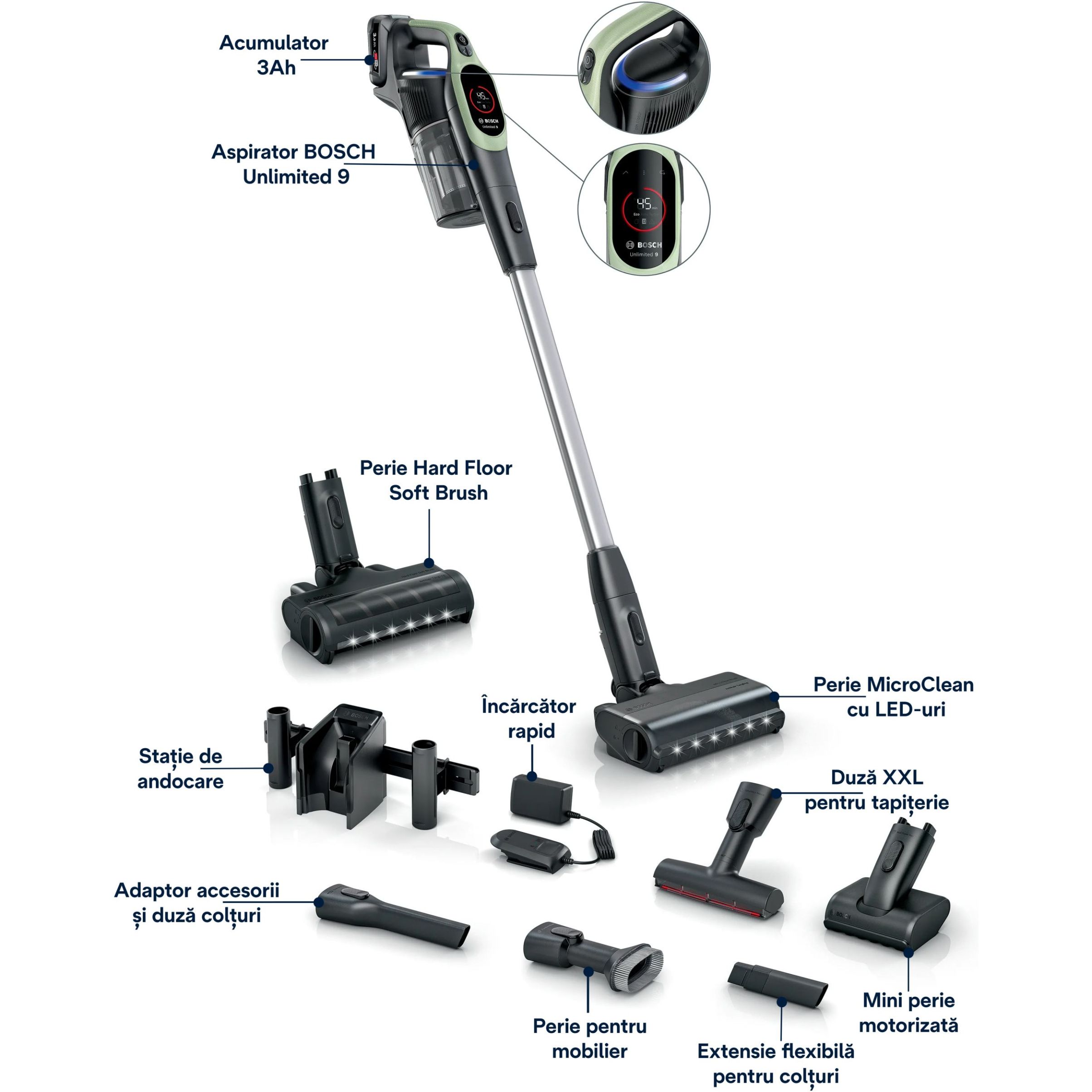 Unlimited 9 este echipat cu un display practic cu LED care afișează timpul de funcționare rămas și 3 moduri de putere pentru fiecare provocare. "Turbo" mărește performanța pentru sarcini dificile. Modul inteligent "Auto" ajustează performanța și durata de funcționare în funcție de podea și suprafață - indiferent dacă este covor sau podea tare și „Eco” oferă o durată de funcționare optimă, de lungă durată, pentru sarcinile de curățare de zi cu zi.