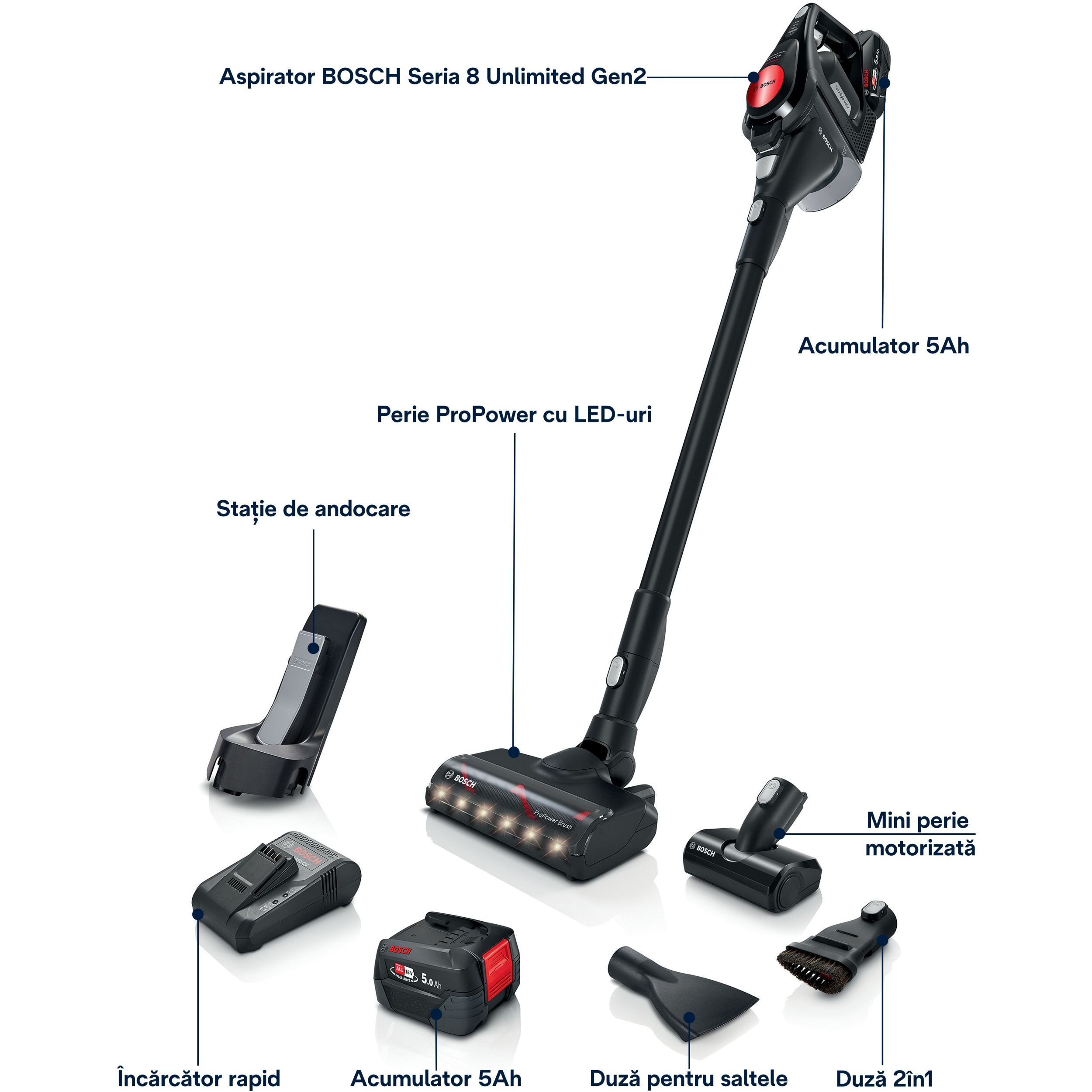 Cel mai eficient mod de a curăța locuința - Unlimited ProPower este potrivit pentru orice sarcină dificilă de curățare. Acumulatorul de 5.0 Ah are cu 66% mai multă energie * datorită celor 10 celule litiu-ion și asigură rezultate excelente de curățare.